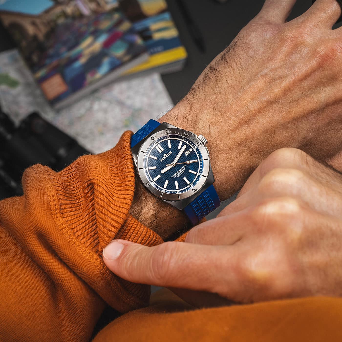 K příležitosti 70. výročí vzniku linie Marinemaster Fortis rozšířil varianty v 40mm pouzdru z recyklované nerezové oceli o nové modely obohacené o Gear Bezel™ – nejpohodlnější a nejfunkčnější jednosměrnou rotační lunetu nástrojových hodinek, jaká kdy byla navržena. K ekologickému pouzdru je připevněn originální gumový řemínek Horizon v odstínu oceánského modrého. Řádně implementovaný systém Fortis Lock System® poskytuje pevnou podporu těm, kdo milují podvodní průzkum. Lakovaný ciferník s motivem Fortis O a nanesenými indexy Superluminova® X1, kovové ručičky hodin, minut a sekund s Superluminova® X1, jsou prvky, které dávají těmto hodinkám jedinečný charakter a zajistí čitelnost i za slabého osvětlení.