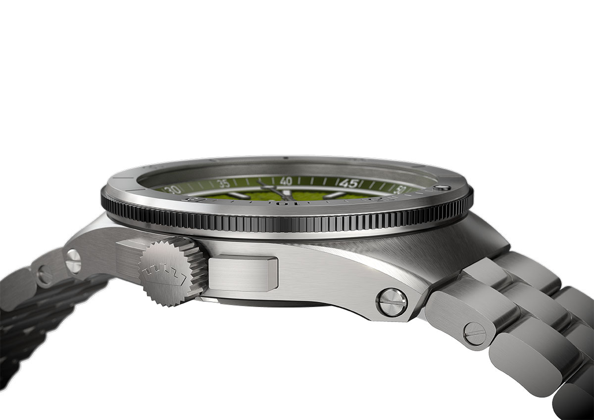 Puškohled má navíc boční vroubkování, které usnadňuje uchopení. Zelený jako peříčka zeleného datla, ciferník je krytý průhledným safírovým sklem téměř bez škrábanců s dvojitou antireflexní vrstvou. Fortis Marinemaster M-40 Woodpecker Green se vyznačuje modernizovanou ráží UW-30, což je vysoce výkonný automatický kalibr UW-30 Performance s rezervou chodu 38 hodin. To, co jej odlišuje od staršího modelu, je pevné, antimagnetické, pozlacené balanční kolečko Glucydur, které poskytuje výjimečnou přesnost standardu chronometru. UW-30 Performance, umístěný v pouzdře z recyklované oceli, podtrhuje silnou pozici Fortis v náMachineových hodinkách. Hodinky jsou zavěšeny na náramku BLOCK BRACELET, který vám umožňuje sami si upravit velikost.