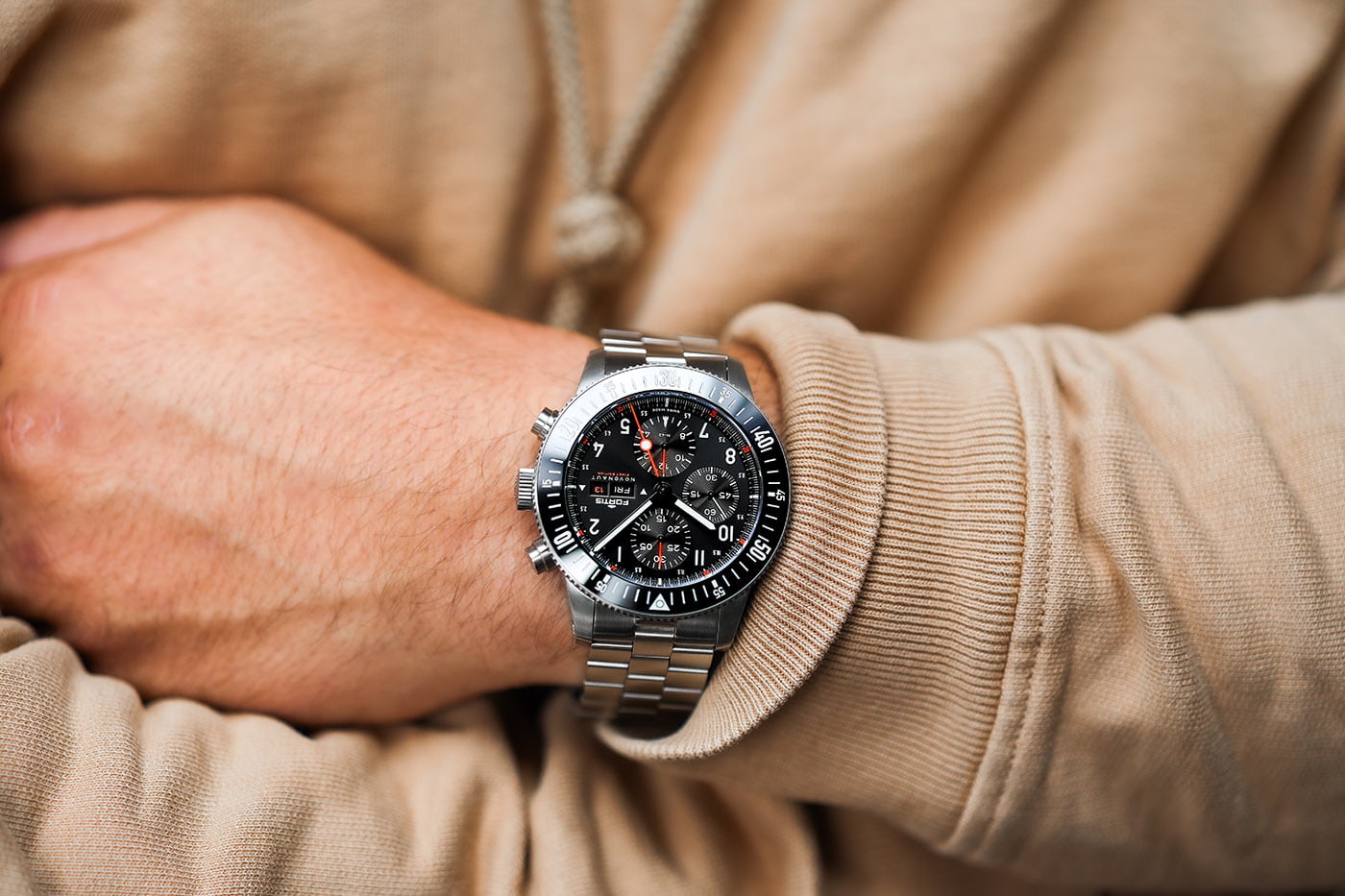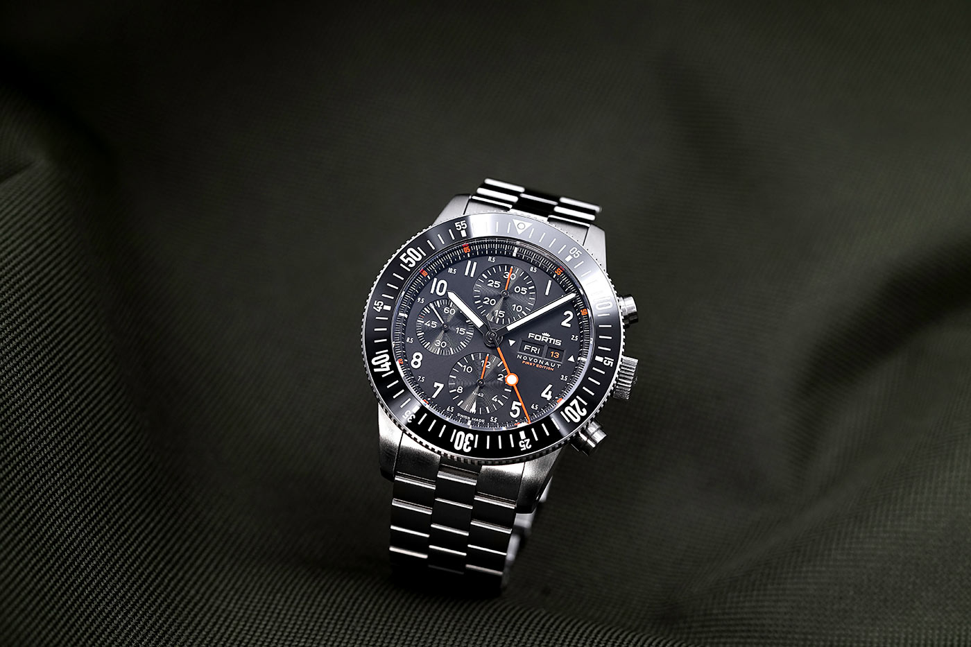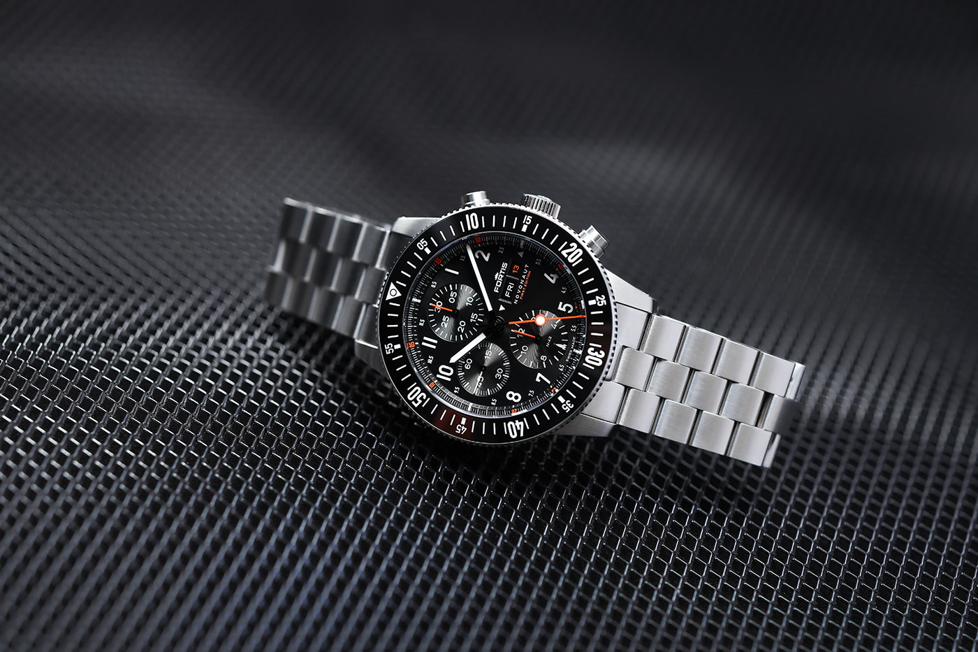 Nekompromisní odolnost in-house hodinek Fortis F2040010 dokazuje i materiál, ze kterého byly vyrobeny. Pouzdro 42 mm (44 mm s lunetou) i blokový náramek jsou vyrobeny z recyklované nerezové oceli. Funkčnost pouzdra zahrnuje mimo jiné speciálně navržené pryžové těsnění FKM u korunky a vroubkovaný okraj pro snadnější uchopení. Funkční hodnotou náramku je zapínání s rychlým nastavením velikosti. Dalším prvkem, který výrazně určuje kvalitu automatického chronografu Fortis Novonaut, je safírové sklíčko odolné proti poškrábání s nejlepší antireflexní vrstvou na světě. Třída voděodolnosti deklarovaná výrobcem je do 20 barů (200 metrů), model Fortis Novonaut tak má další uplatnění při potápění.