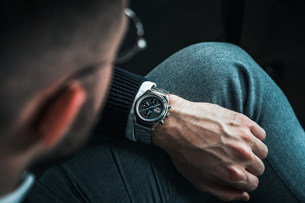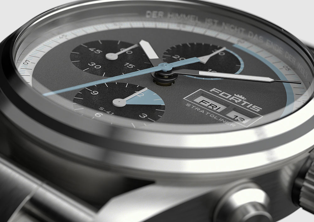 Tím však budoucí řešení, vesmírné analogie a překvapení nekončí. Pánské hodinky Fortis Stratoliner S-41 v každé verzi mají úžasný ciferník, jehož barva a struktura jsou inspirovány vesmírným vesmírem. Písčitá/zrnitá struktura je odkazem na měsíční prach a dokonale kulatý tvar evokuje představu měsíce v úplňku. Dalším ohromujícím prvkem jsou vesmírně modré značky označující různé fáze kosmického letu Virgin Galactic, které jsou podrobně popsány na posledním obrázku s vysvětlením číselníku. Obecně platí, že modré oblasti jsou promyšleně tvarovány tak, aby odrážely stoupání, zrychlení, apogee bodu G, klouzání a přistání mateřské lodi. Celý ciferník je chráněn safírovým sklem odolným proti poškrábání s antireflexní vrstvou na obou stranách. Pouzdro a náramek o průměru 41 mm jsou vyrobeny z recyklované nerezové oceli.