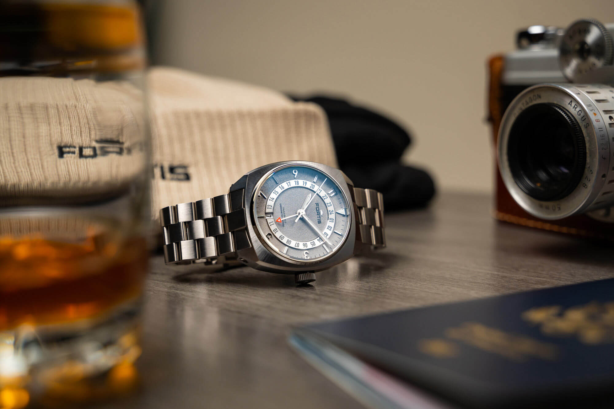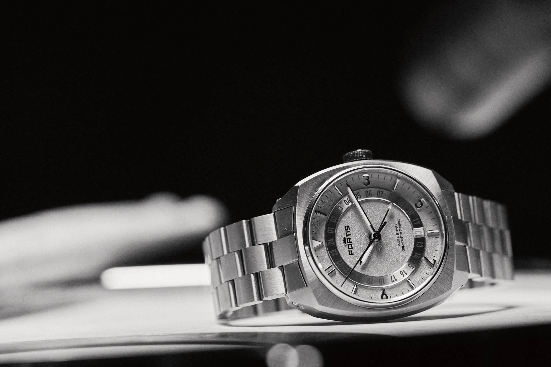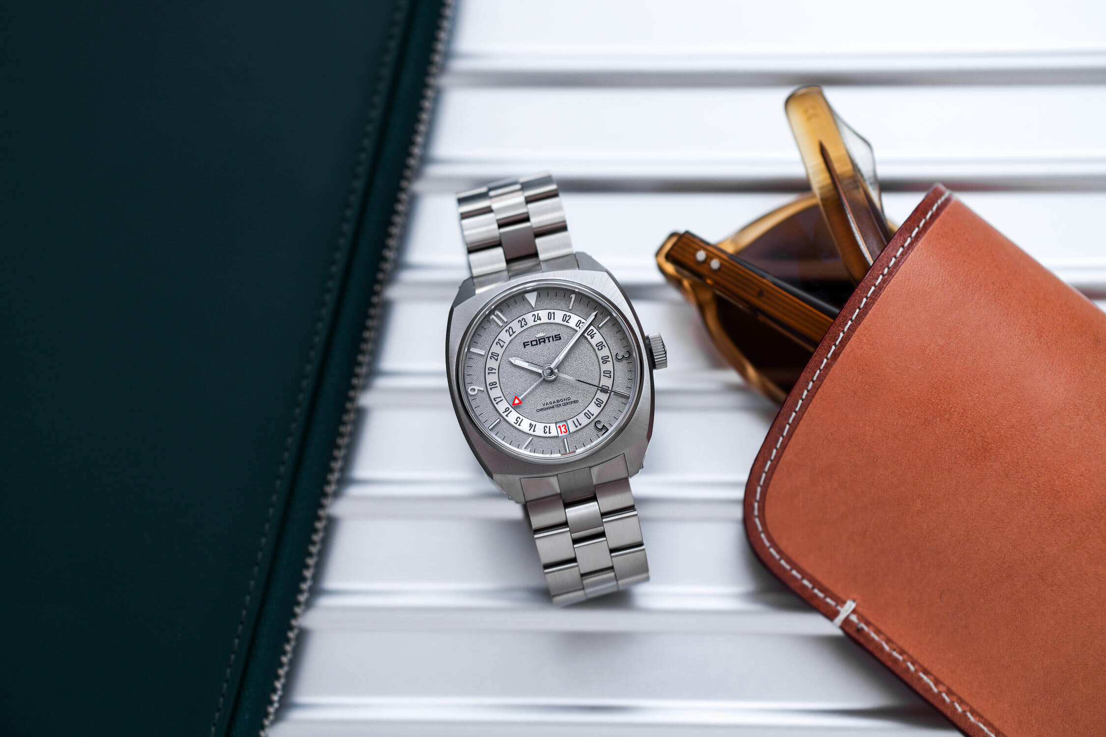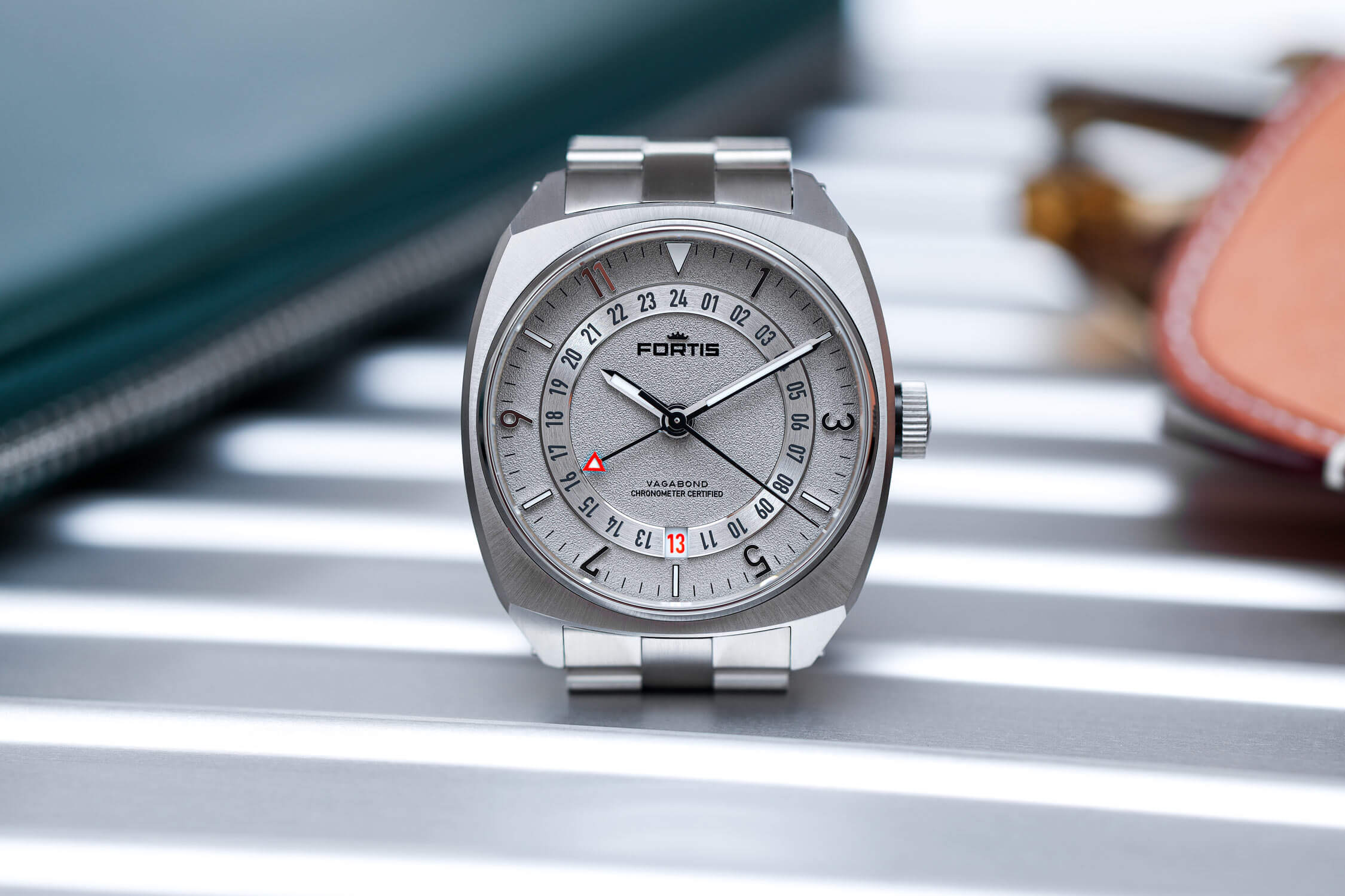 První, co zaujme, je unikátní tvar pouzdra. Mezi jednotnými, kulatými pouzdry slavných modelů Marinemaster, Flieger a Novonaut vynikají svým odvážným přístupem prezentované švýcarské hodinky Fortis Vagabond F6660000. FORTIS sáhl po retro stylu, zvolil „cushion“ pouzdro, které dodává hodinkám nejen eleganci, ale také zdůrazňuje jejich luxusní charakter. Pouzdro o průměru 40 mm, vyrobené z nejkvalitnějšího titanu 5, zaujme precizním kartáčováním a lesklým prstencem. Hodinky jsou dokonale profilované a zakřivené ouška plynule navazují na titanový náramek a zajišťují pohodlné uchycení na zápěstí. Tento model jako zástupce nástrojových časovačů nabízí vysokou třídu těsnosti až do 200 metrů. Korunka je navíc zajištěna trojitým systémem těsnění z odolné pryže FKM, která zaručuje spolehlivost i v náročných podmínkách. Číselník je chráněn safírovým sklem s antireflexní vrstvou a zadní strana pouzdra z tónovaného safírového skla vám umožní obdivovat precizní, manufakturní mechanismus. S osobitým přístupem k detailu je na zadní straně pouzdra také zajímavý nápis „jet lag resistant“ – jemný způsob, jak naznačit, že tyto hodinky jsou připraveny na jakoukoli cestu a časové pásmo.