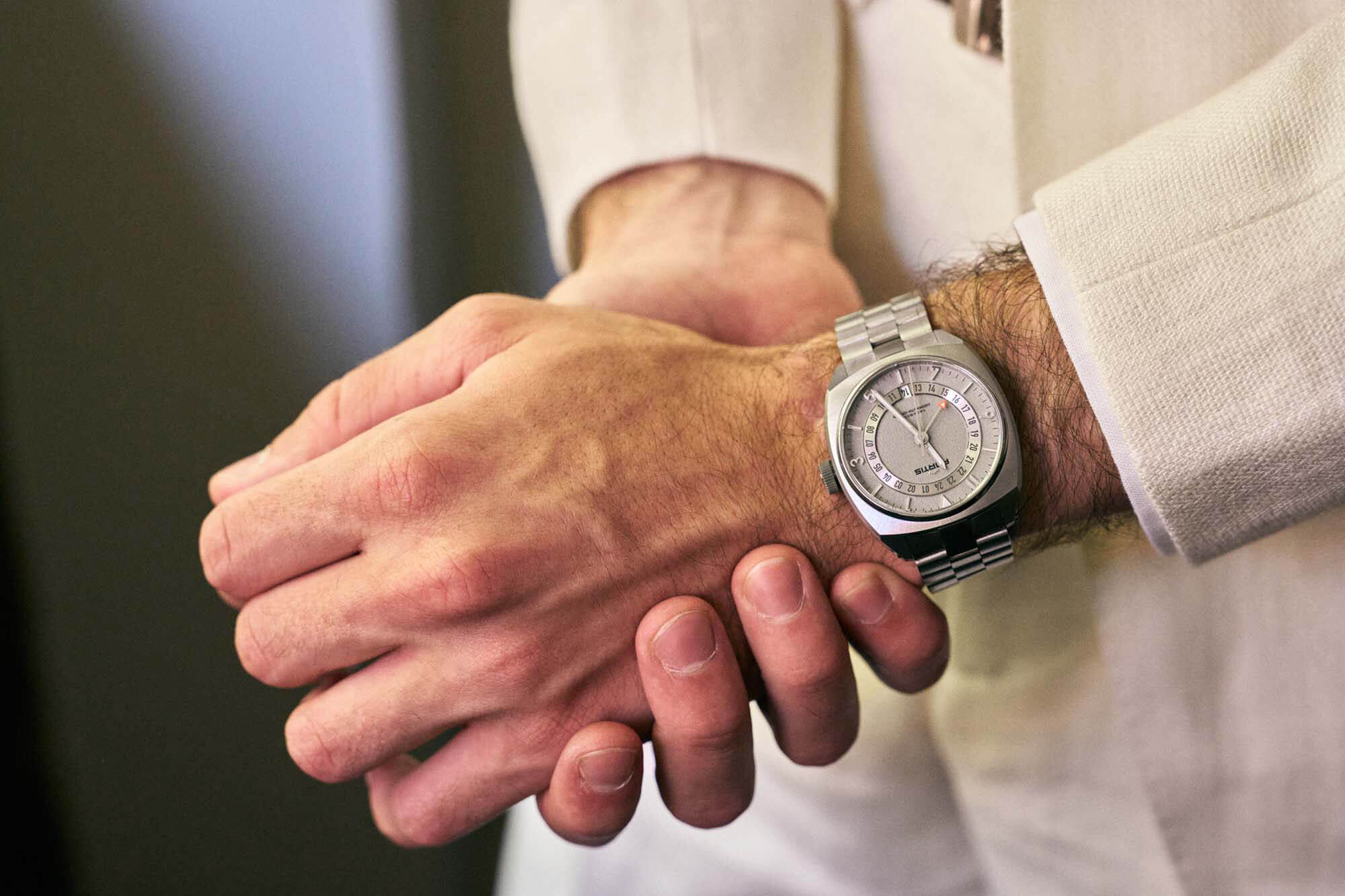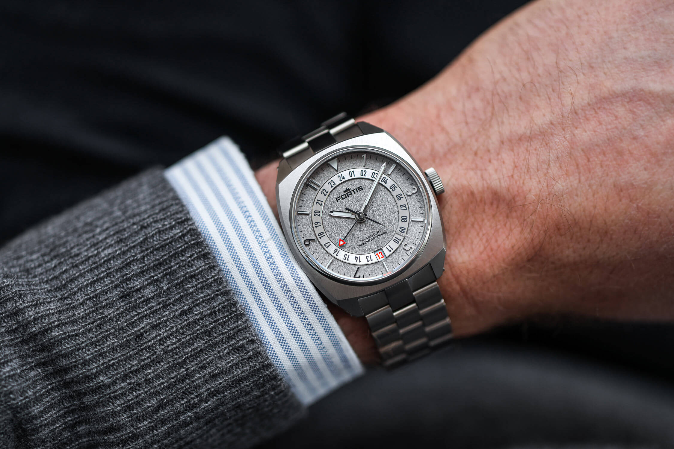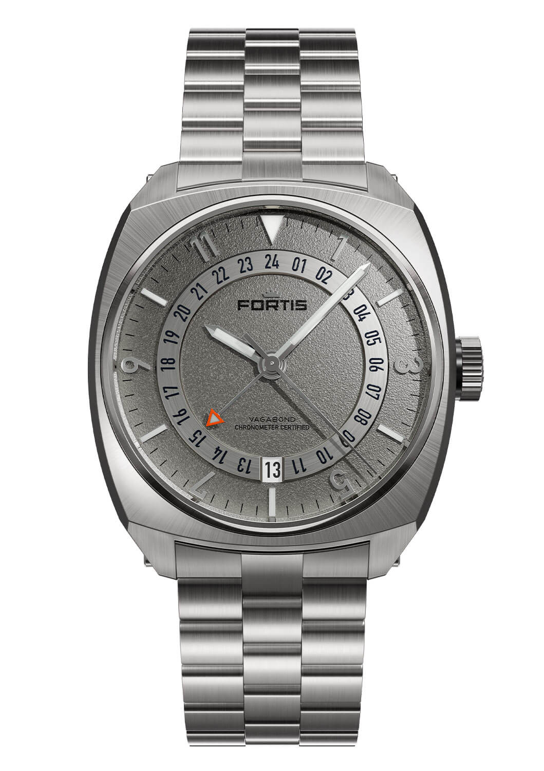 To, co hodinky Fortis Vagabond odlišuje, není jen tvar pouzdra, ale především jeho unikátní zrnitě šedý ciferník. Pozornost věnovaná průhlednosti typická pro značku Fortis znamená, že ciferník byl navržen s ohledem na minimalismus a čitelnost – způsobem, který nezahltí, ale umožňuje plnou funkčnost. Na číselníku jsou pouze nejdůležitější značky, které umožňují snadné odečítání času. Na okraji ciferníku je skromná minutová stupnice s přehlednými indexy a arabskými číslicemi označujícími liché hodiny a na 12. hodině je trojúhelníková značka, která celé věci dodává další akcent. Trojúhelník i indexy jsou pokryty Super-LumiNova X1, která zajišťuje čitelnost při slabém osvětlení. Na vnitřní straně ciferníku přibyl jemný prsten s 24hodinovou stupnicí z bílého zlata. Proč tento neobvyklý materiál? Tvůrci Vagabond vysvětlují, že bílé zlato zdůrazňuje prestižní charakter hodinek a symbolizuje hodnotu domova, který je tím nejcennějším místem, kam se vždy vracíme, bez ohledu na to, jak daleko nás naše cesty zavedou.