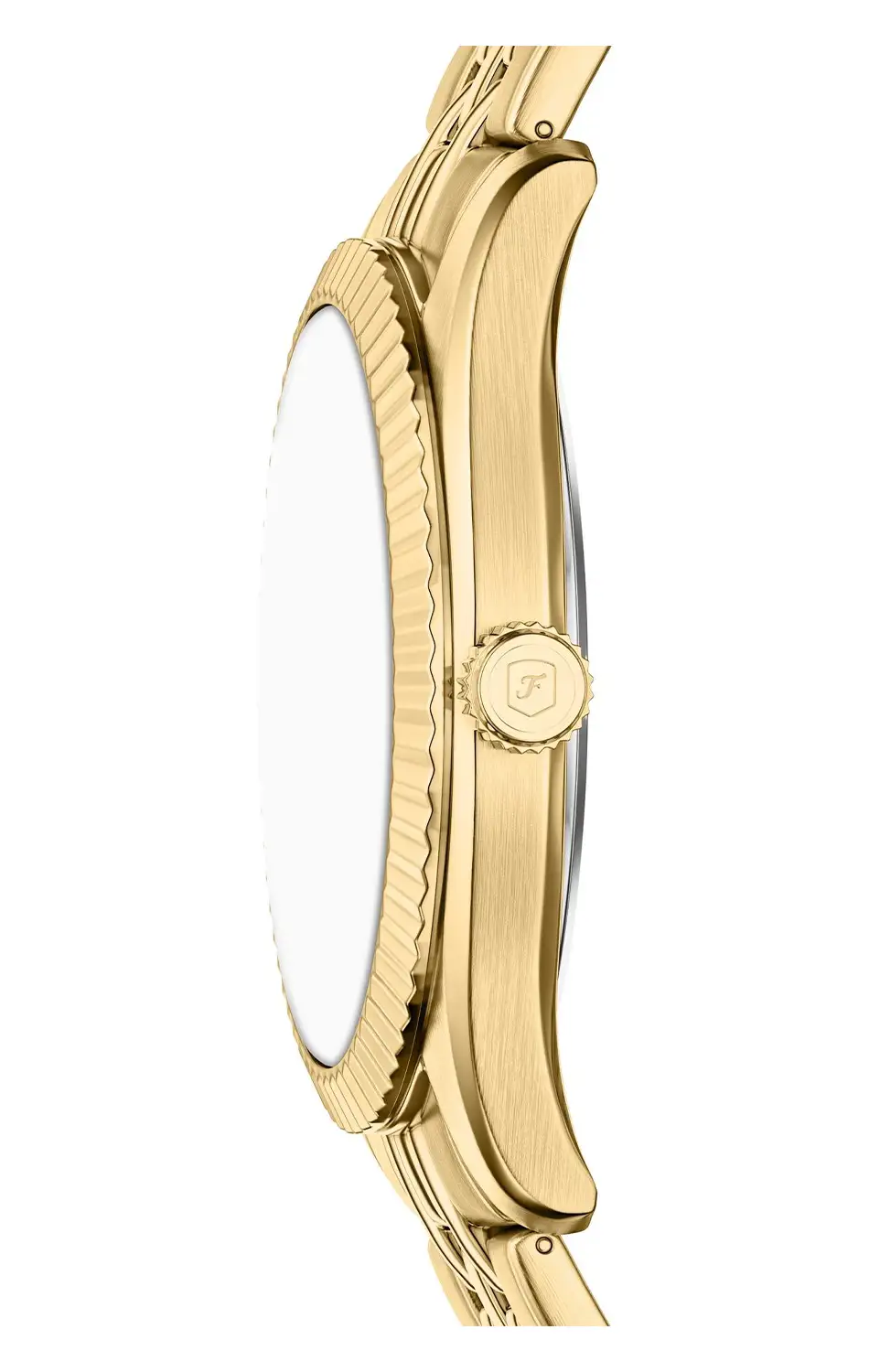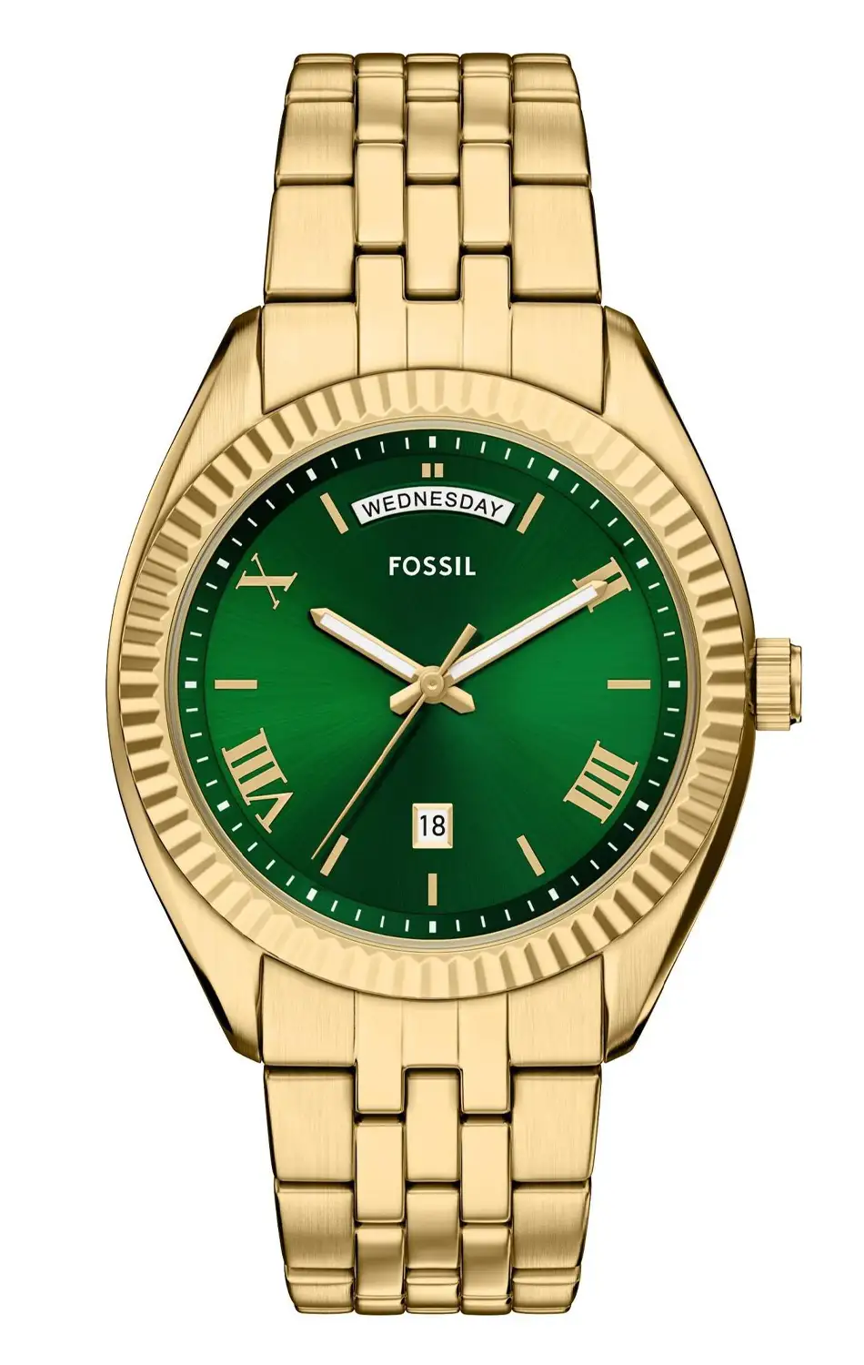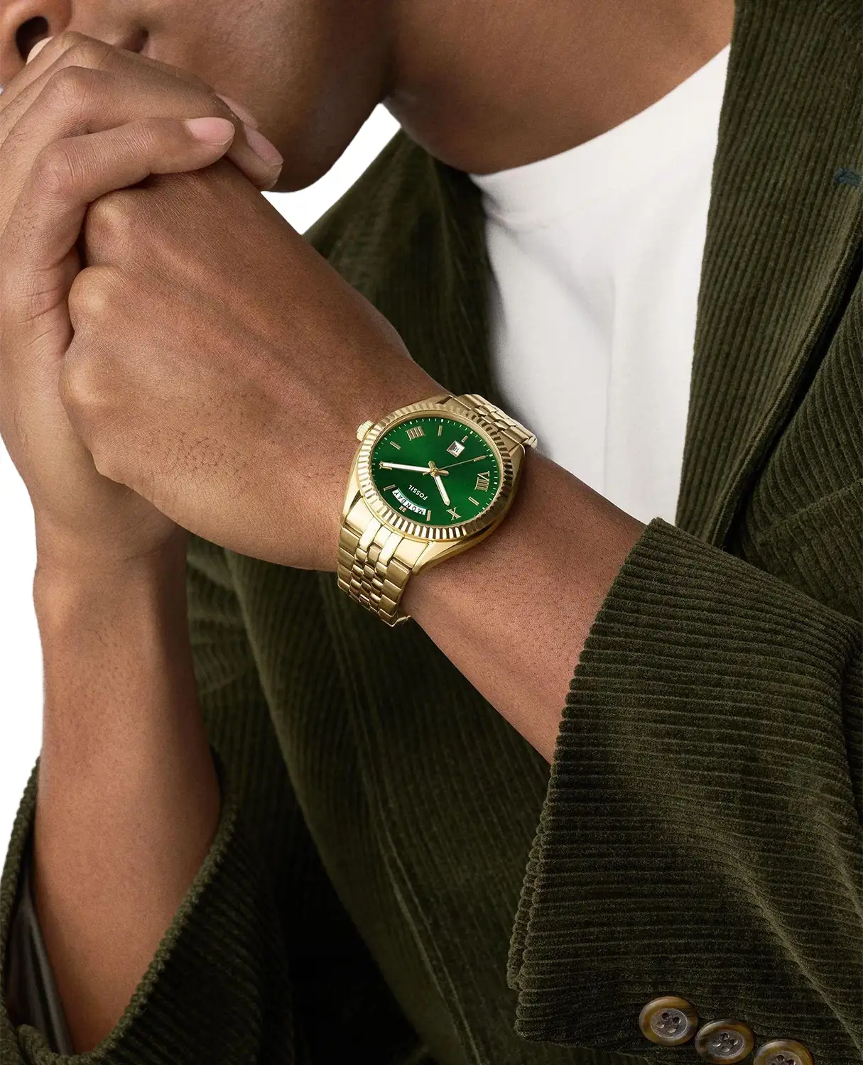 Pánské hodinky Fossil Campbell FS6142 jsou klasickou volbou v výrazně elegantním, a zároveň moderním provedení. Pouzdro o průměru 42 mm s povrchovou úpravou ve zlaté barvě jim dodává prestižní charakter a zajišťuje, že model okamžitě upoutá pozornost na zápěstí. Zelený ciferník v kombinaci se zlatými indexy a ručičkami vytváří nadčasový kontrast, který se skvěle hodí jak ke stylu smart casual, tak k formálnějším outfitům. Ocelový náramek ve stejném odstínu celek uzavírá do soudržné, bižuterní formy.