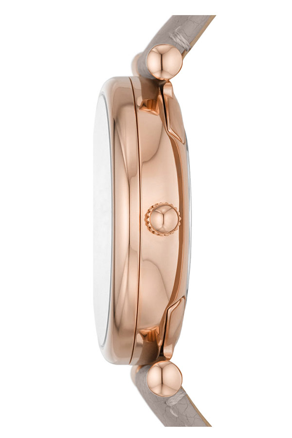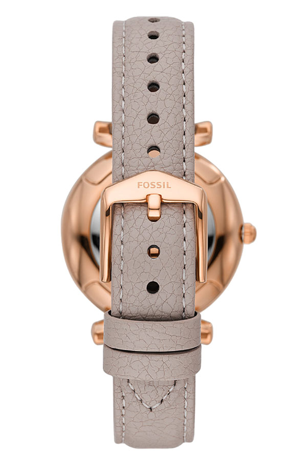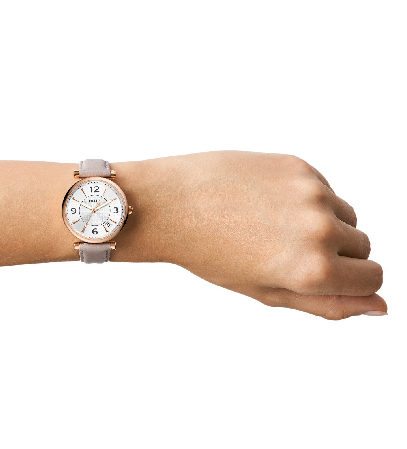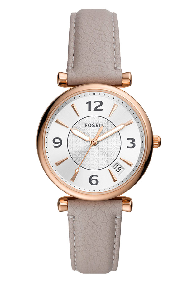 Fossil Carlie s referenčním číslem ES5161 jsou dívčí hodinky s pouzdrem pozlaceným růžovým zlatem metodou PVD. Hodinky ES5161 jsou kulaté pouzdro z nerezové oceli a šedý kožený řemínek připevněný k očkům s klasickým zapínáním na přezku. Na stříbrném ciferníku je zdobený střed a lineární indexy smíchané s arabskými číslicemi a datumové okénko ve čtvercovém okénku mezi čtvrtou a pátou hodinou, které označuje aktuální den v měsíci. Minerální sklíčko chrání ciferník před poškozením.