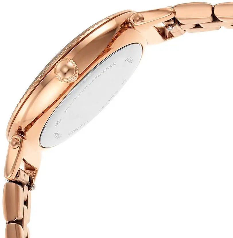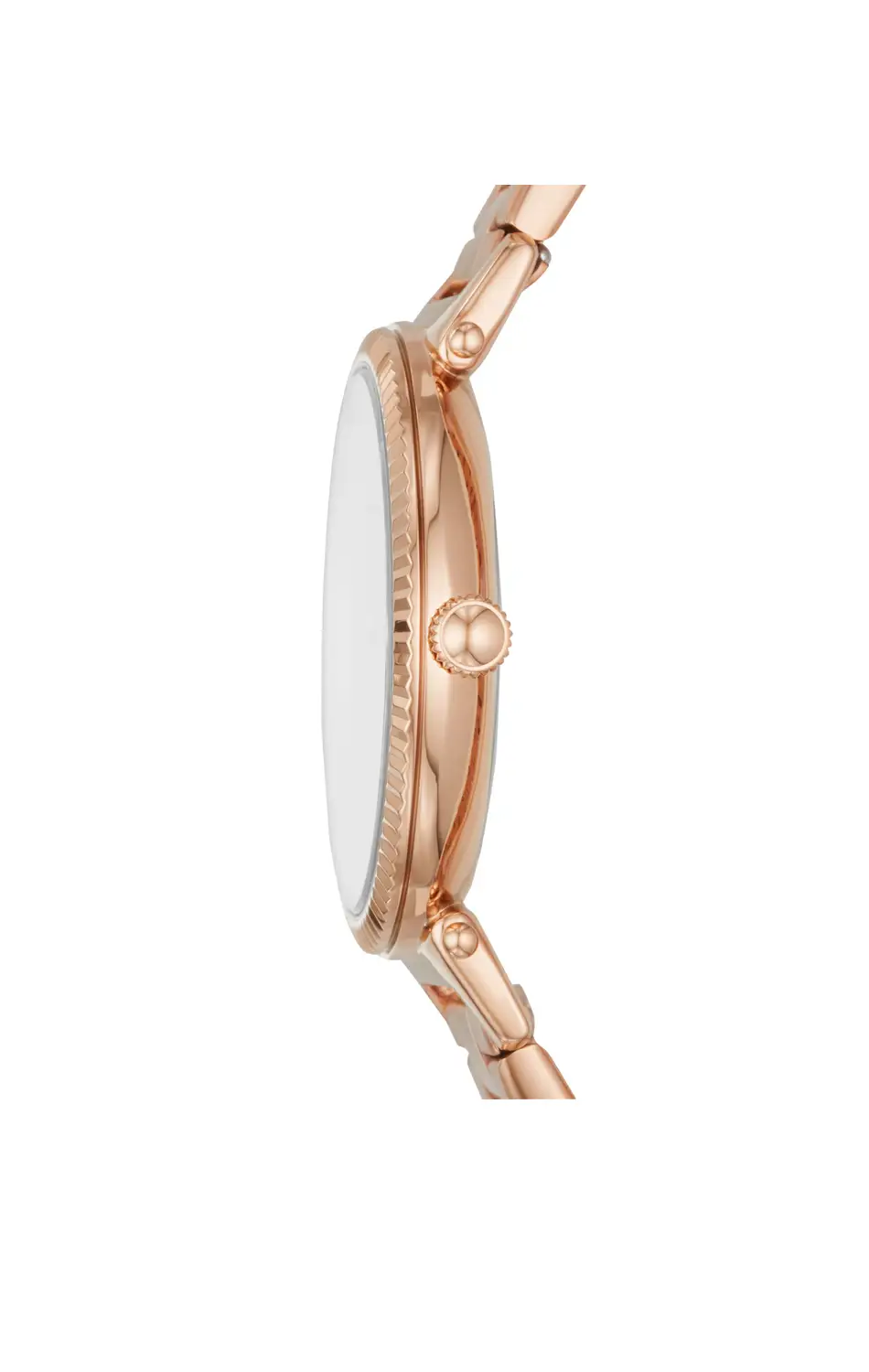 Pozlacené dámské hodinky Fossil Daisy ES4791 jsou určené ženám, které oceňují decentní eleganci a nadčasovou formu. Štíhlé pouzdro o průměru 34 mm v teplém odstínu růžového zlata se jemně usazuje na zápěstí a vytváří efekt šperkového doplňku, který stylizaci nedominantně doplňuje. Světlý ciferník s jemnými římskými indexy podtrhuje klasický charakter modelu a dodává mu lehkost.