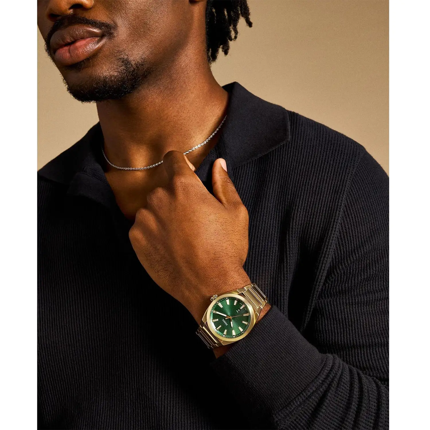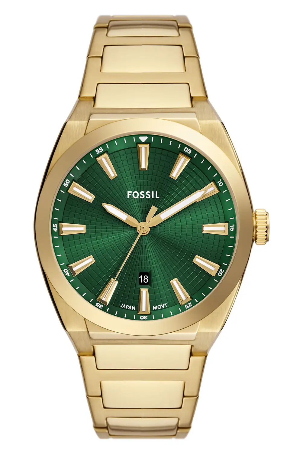 Pánské hodinky Fossil Everett FS6090 jsou výrazným modelem s moderním, městským charakterem, v němž pozlacené pouzdro a náramek tvoří soudržný, vizuálně silný celek. Průměr pouzdra 41 mm mu dodává výraznou přítomnost na zápěstí, ale bez efektu přehnanosti, díky čemuž zůstávají hodinky univerzální a dobře vyvážené. Zelený číselník s geometrickou texturou a aplikovanými indexy vytváří hloubku a kontrast, který přitahuje pohled a podtrhuje současný styl kolekce Everett.