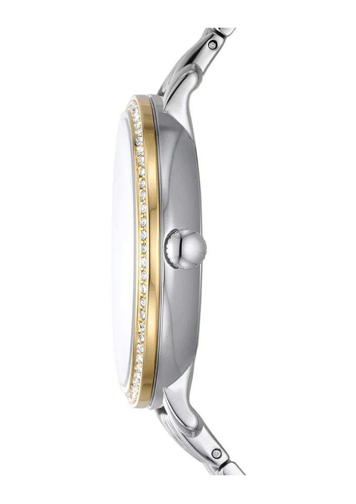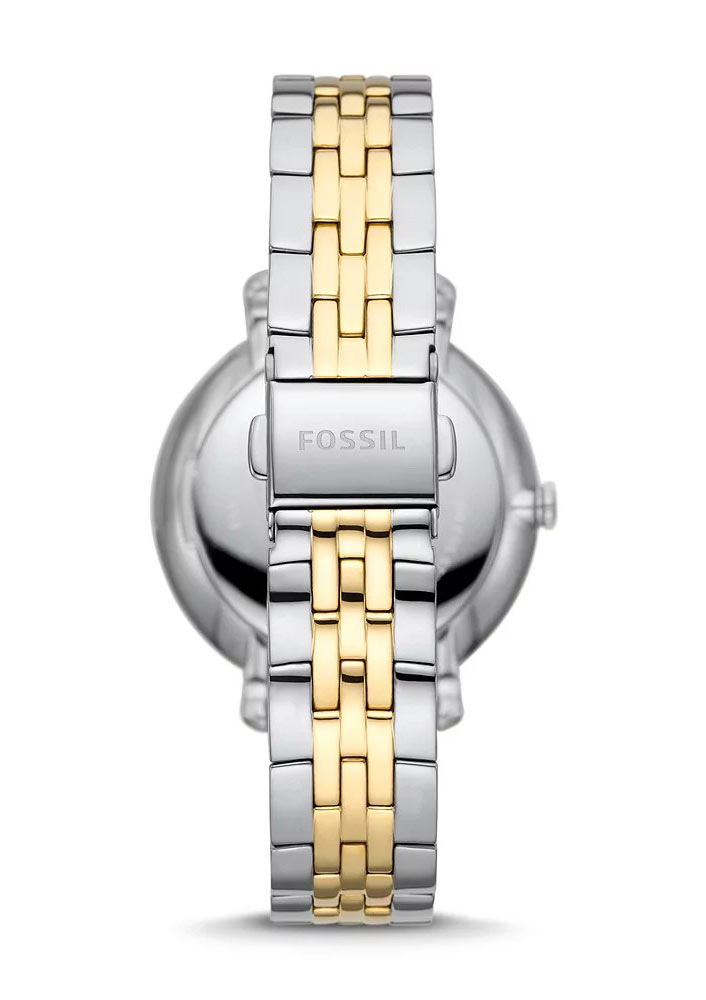 Hodinky Fossil Jacqueline ES5166 mají dvoubarevné pouzdro o velikosti 36 mm. Tato velikost pomůže přizpůsobit tyto hodinky zápěstí každé ženy. Stříbrné a zlaté pouzdro je osazeno lesklými zirkonovými kamínky, které dodávají tomuto modelu eleganci. Tyto klasické dámské hodinky Fossil jsou spárovány s pohodlným stříbrno-zlatým ocelovým náramkem. Náramek lze upravit na jakoukoli velikost zápěstí a jeho jemný lesk podtrhuje univerzální styl těchto hodinek. Bezpečná a pohodlná motýlková spona sepne náramek na vašem zápěstí.