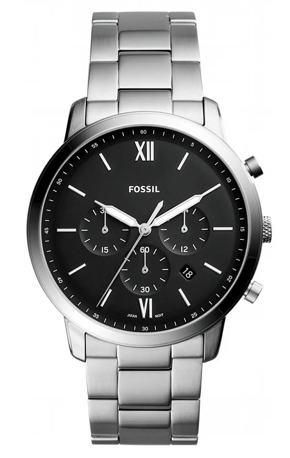 Pánské hodinky Fossil Neutra Chronograph FS5384 jsou návrhem pro muže, kteří oceňují klasickou formu doplněnou o výrazný technický akcent. Pouzdro o průměru 44 mm dodává hodinkám výraznou přítomnost na zápěstí a černý číselník v kombinaci s ocelovým náramkem vytváří elegantní, nadčasový celek. Římské hodinové indexy ve spojení s minimalistickými ručkami budují přehledné rozvržení a podtrhují charakteristický styl řady Neutra.