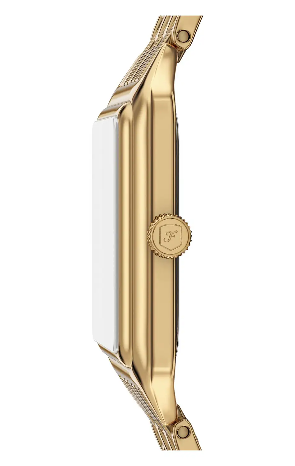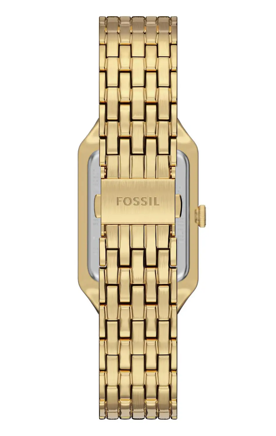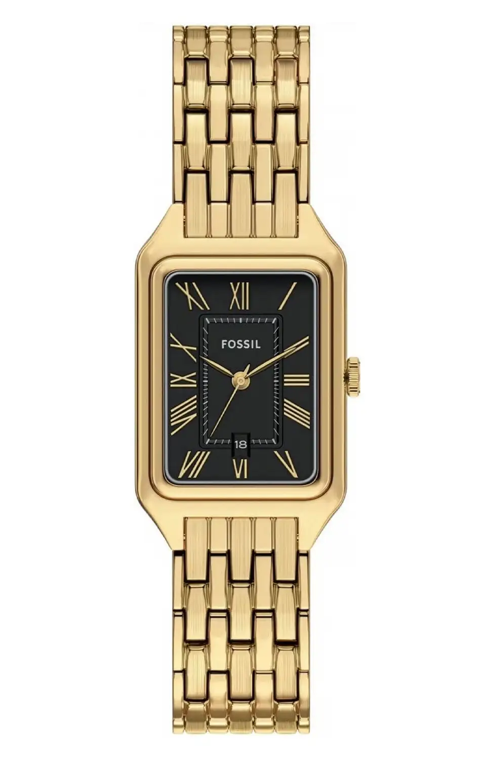 Dámské hodinky Fossil Raquel ES5434 přitahují pozornost již na první pohled výrazně šperkovou formou, která více připomíná elegantní náramek než klasický časoměr. Štíhlé pouzdro o šířce 23 mm ve zlaté barvě se dokonale přizpůsobí zápěstí a obdélníkový tvar dodává celku módní, lehce pařížský charakter. Černý ciferník s římskými indexy ve zlatém provedení vytváří kontrast, který podtrhuje luxusní styl a činí z tohoto modelu výrazný doplněk jak pro každodenní stylizace, tak pro večerní outfity.