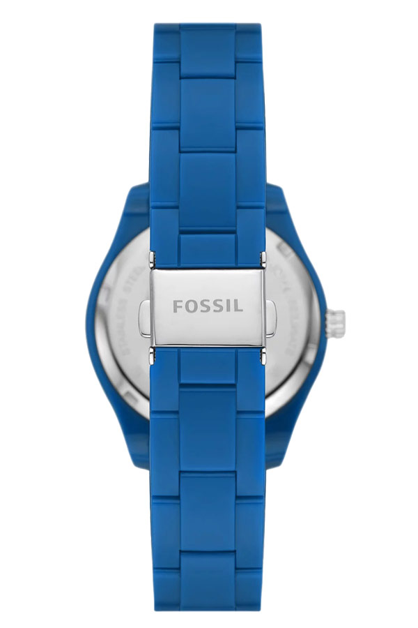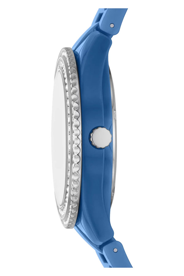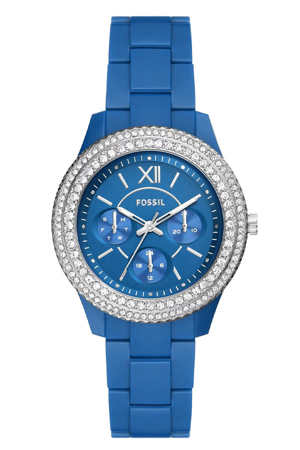 Americká značka Fossil představila pro-planetové dámské hodinky vyrobené z plastu. Fossil Stella ES5193 je modré pouzdro zdobené zirkony, které je v kombinaci s plastovým páskem rovněž v modré barvě.