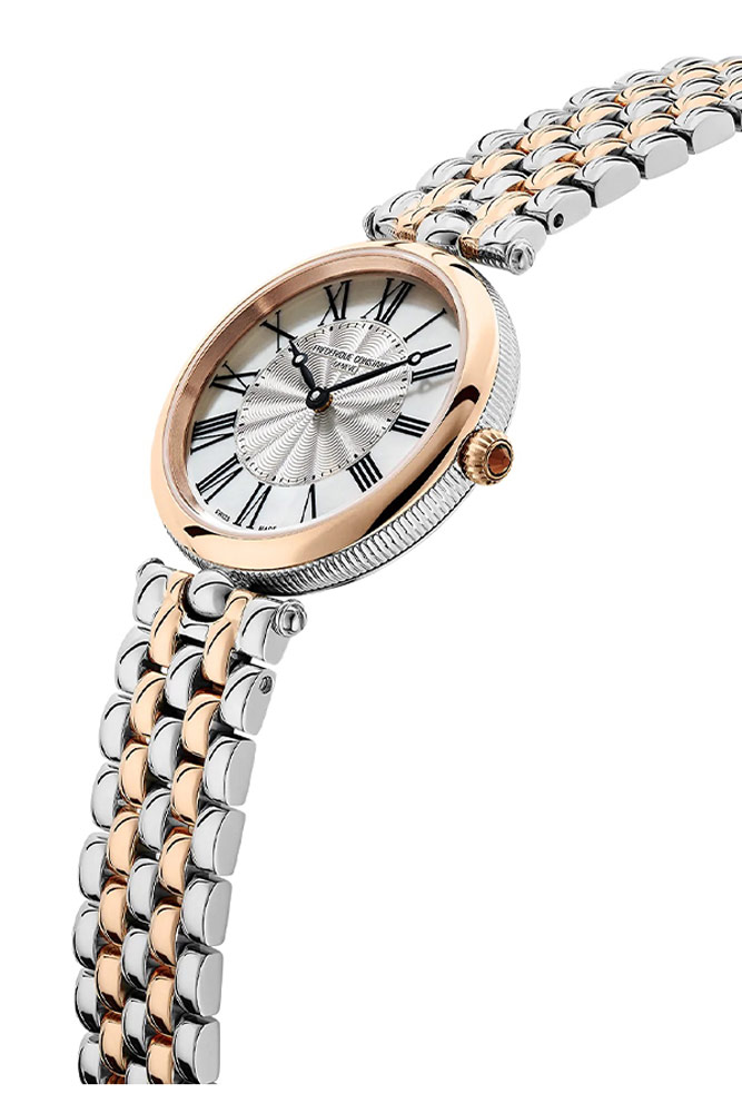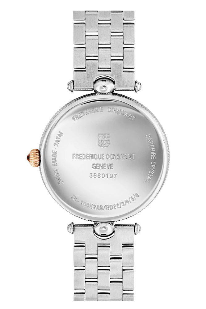 Frederique Constant Art Deco Round vybavený náramkem z nerezové oceli s prvky pozlacenými růžovým zlatem. Korunku s nastavením času zdobí oranžový kabošon . Hodinky navržené pro každodenní nošení moderními a výjimečnými ženami.