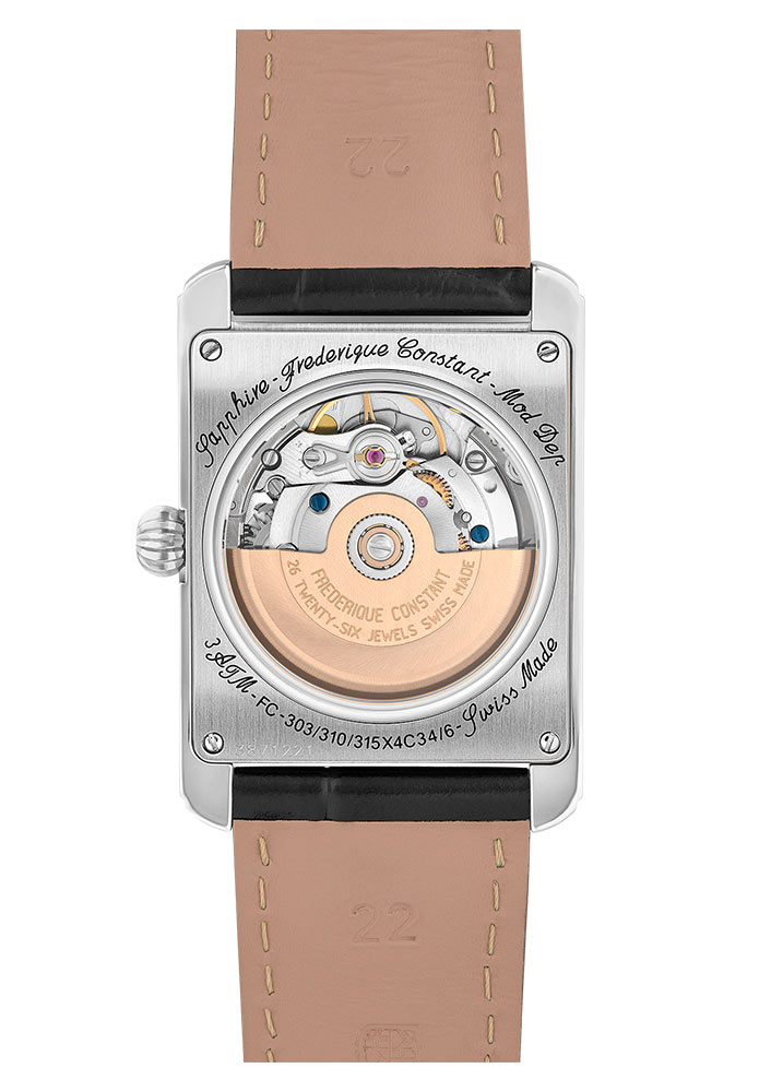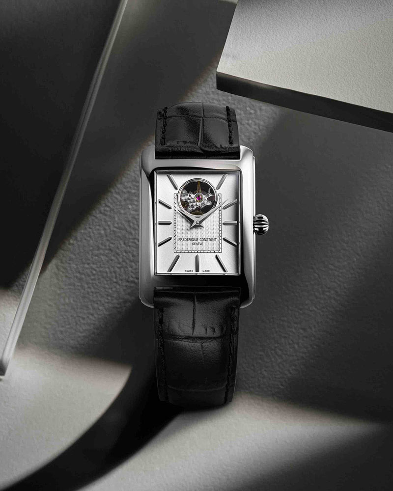 Přední strana obdélníkových hodinek Frederique Constant je pokryta safírovým sklem vysoce odolným proti poškrábání. Kryje stříbrný ciferník s odhaleným vyvážením. Výrobce tohoto švýcarského mistrovského díla umožňuje obdivovat práci srdce unikátního automatického mechanismu. Ciferník s elegantními ručičkami a indexy zakrývá originální strojek poháněný pohybem zápěstí. FC-311 s rezervou chodu až 38 hodin zajišťuje dokonalé měření času. Otevřený ciferník srdce vynikne v davu klasických řešení a potěší oko svého majitele.