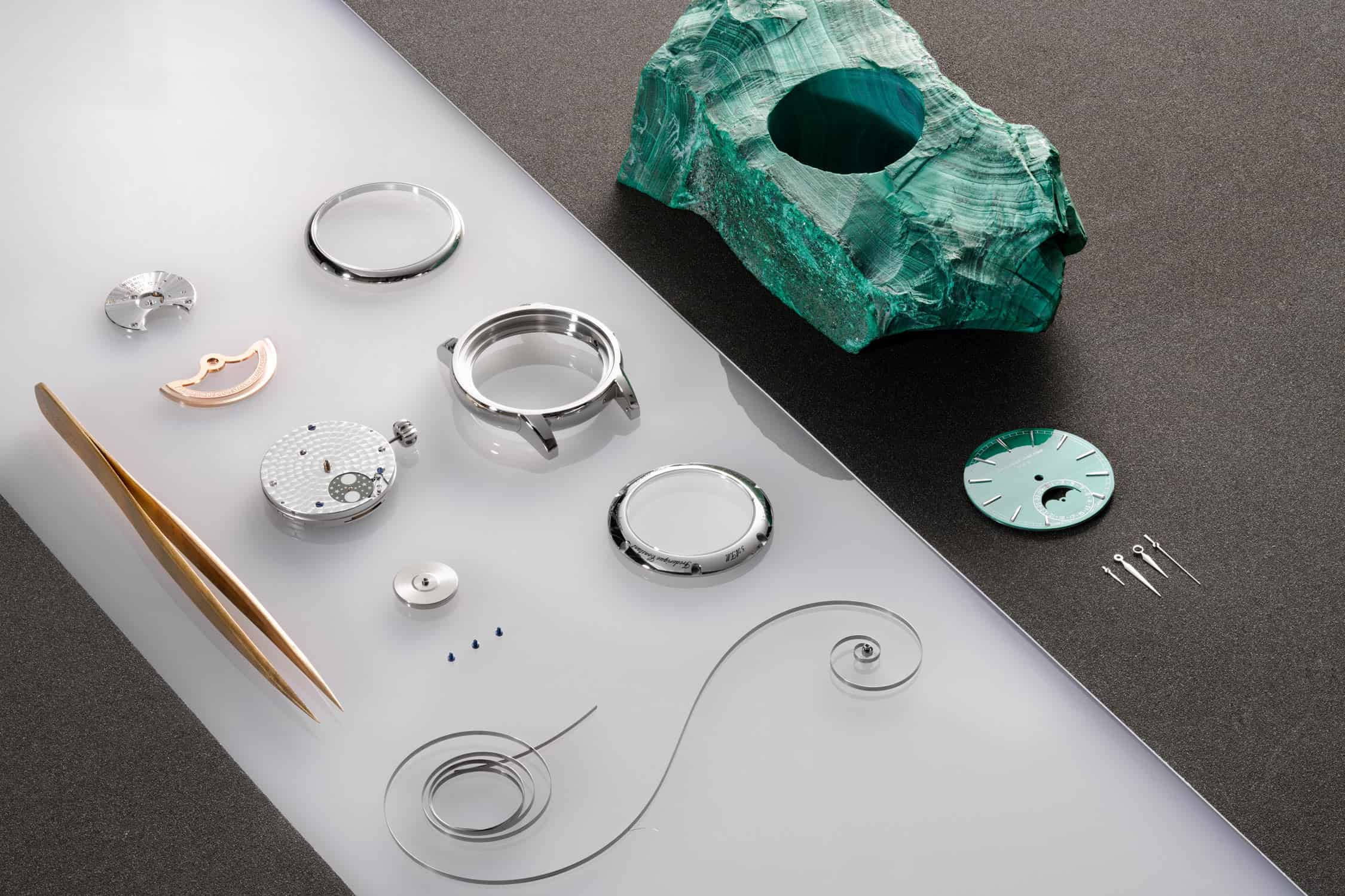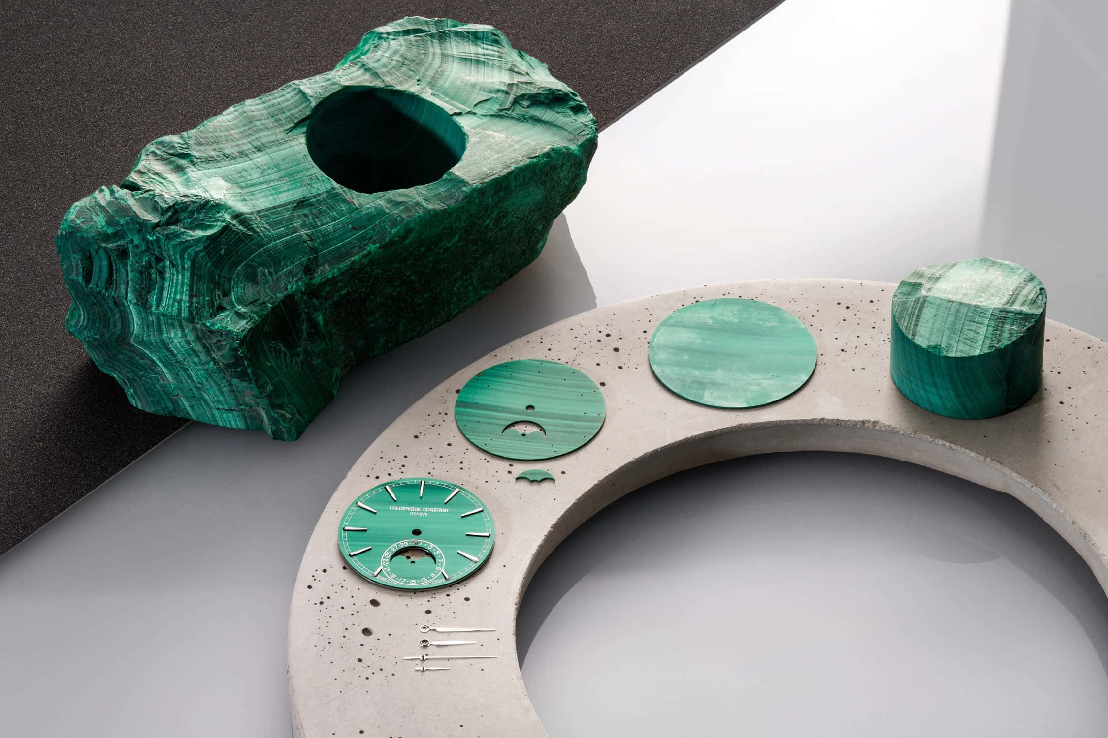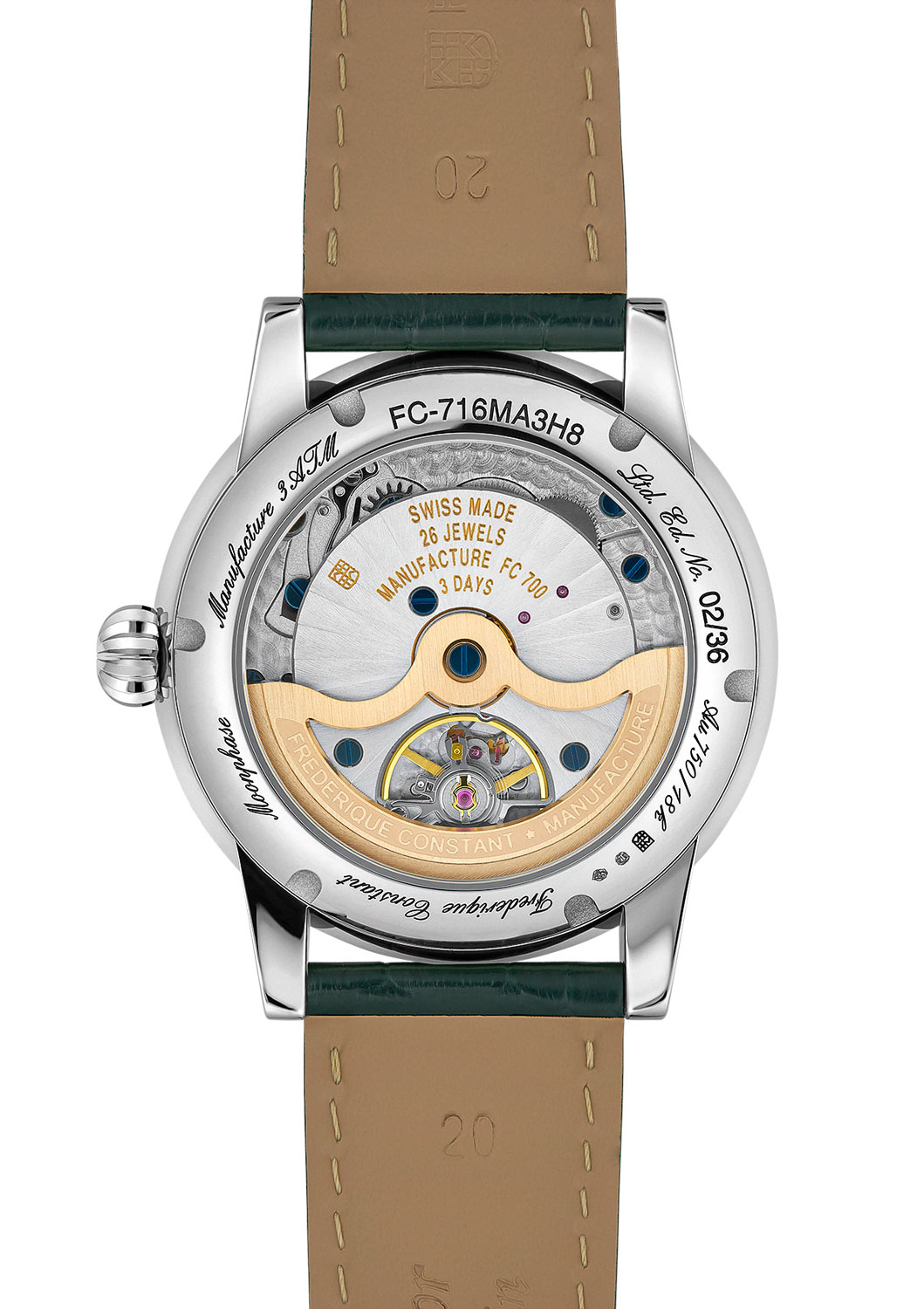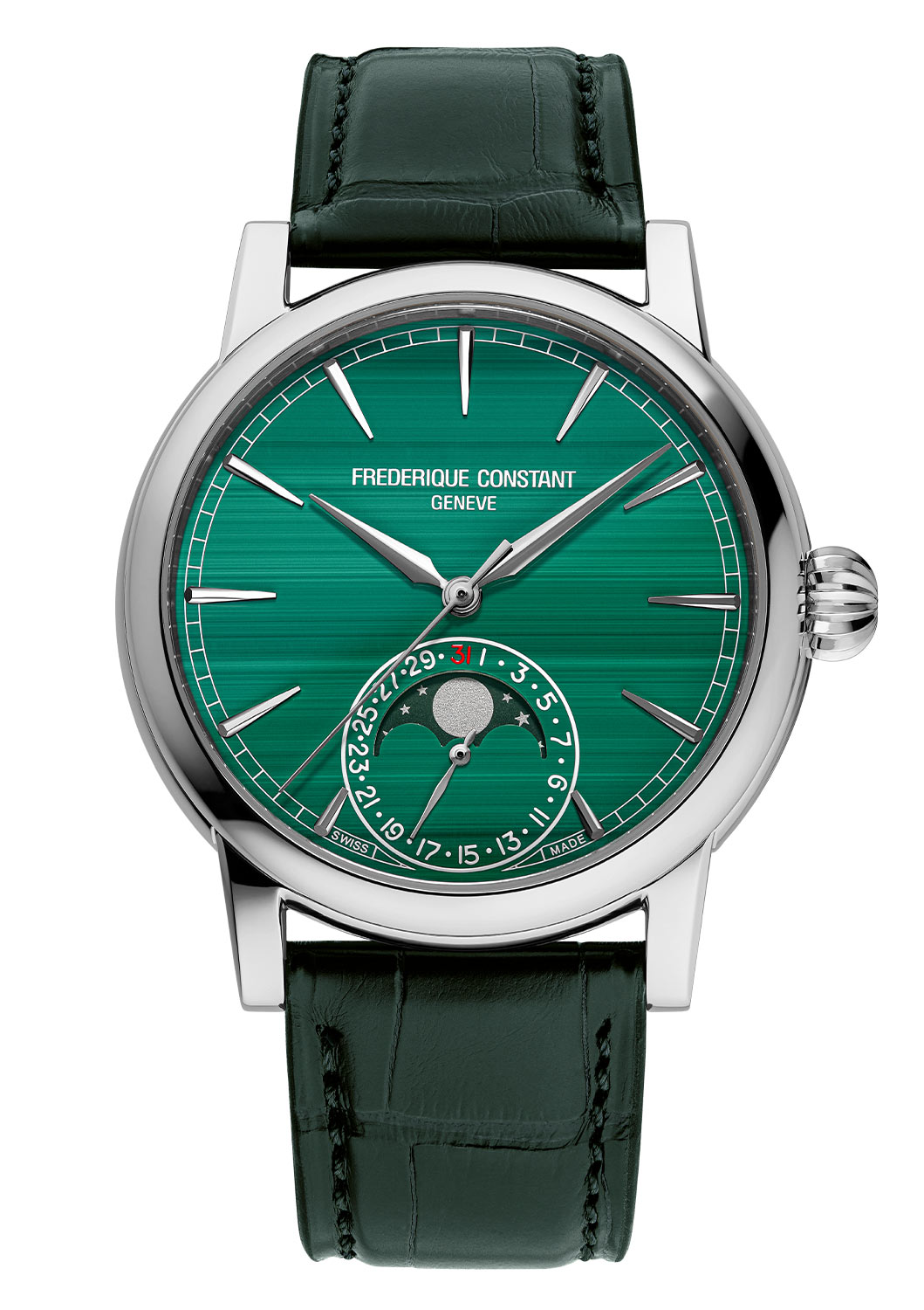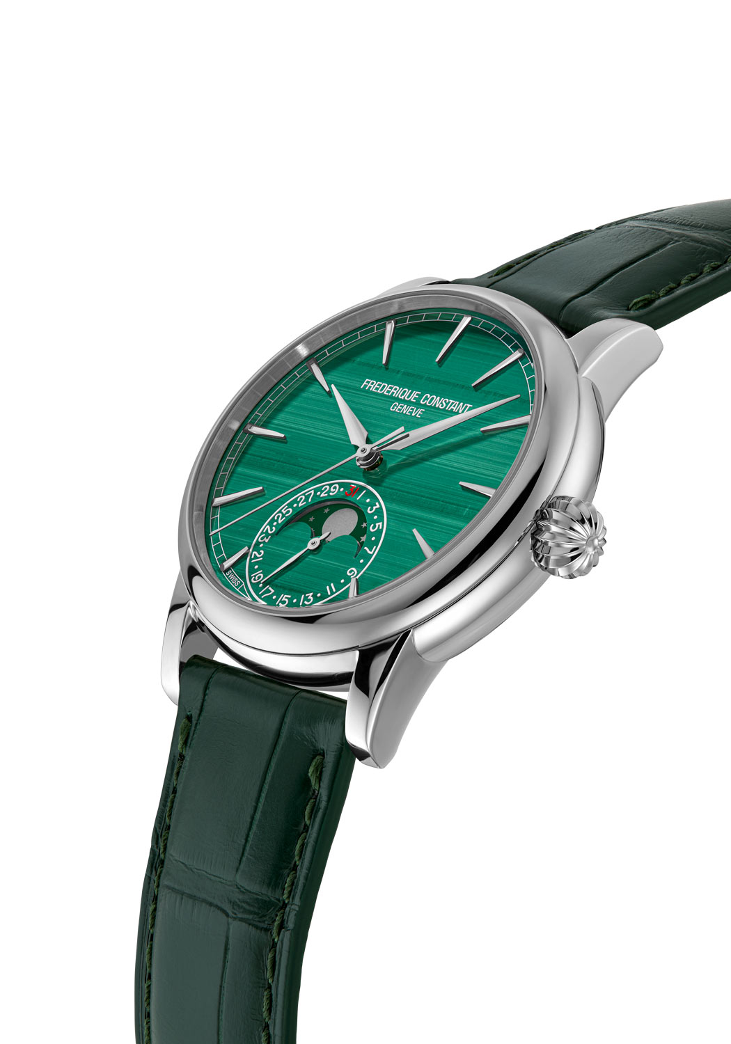 I když si tyto švýcarské hodinky zachovává svou klasickou identitu a výrazné komplikace, přináší zcela novou estetiku. Jeho cílem je zdůraznit prestiž mezi sběrateli, dále zlepšovat technické aspekty a posilovat historické základy značky. Limitovaná edice hodinek Frederique Constant využívá unikátní zelený ciferník z malachitu, který jí dodává jedinečný charakter. Tento minerální kámen byl vybrán pro své bohaté odstíny. V 6 hodin se spojí dvě komplikace v jednu mimořádně užitečnou funkci. Datum a fáze měsíce jsou integrovány na jednom subciferníku. Současný číselník fáze měsíce, který je stříbrný, dokonale ladí s pouzdrem z bílého zlata. Zobrazení data přesně ukazuje aktuální den v měsíci.