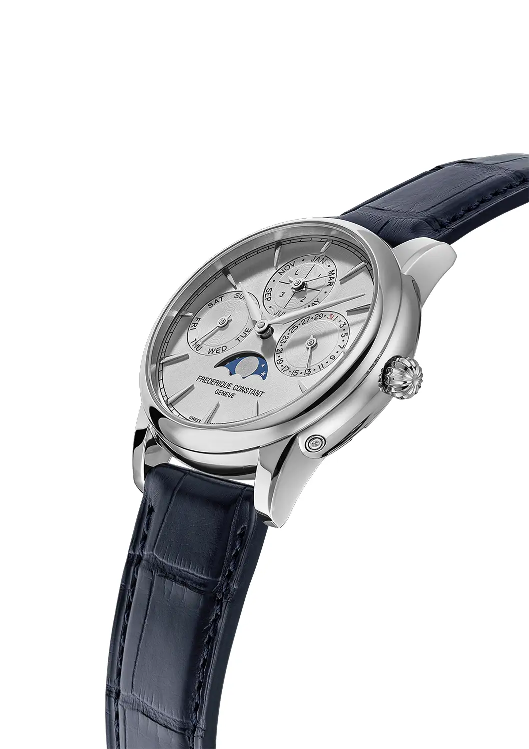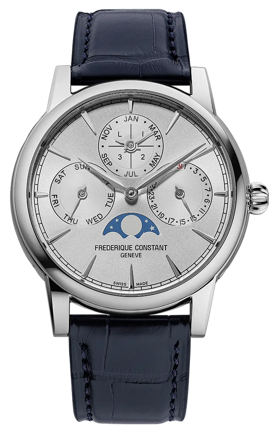 Frederique Constant Classic Perpetual Calendar Manufacture FC-776S3H6 jsou výjimečné pánské hodinky, v nichž se tradice švýcarského hodinářství setkává s moderními řešeními. Jejich elegantní pouzdro z ušlechtilé oceli o průměru 40 mm a tloušťce 12,1 mm si zachovává klasické proporce, které zajišťují pohodlí při nošení a nadčasový styl. Pozornost si zaslouží stříbrný číselník zdobený jemným slunečním brusem, který v kombinaci s tmavě modrým řemínkem z aligátoří kůže vytváří ideální komplet jak pro formální příležitosti, tak pro každodenní použití.