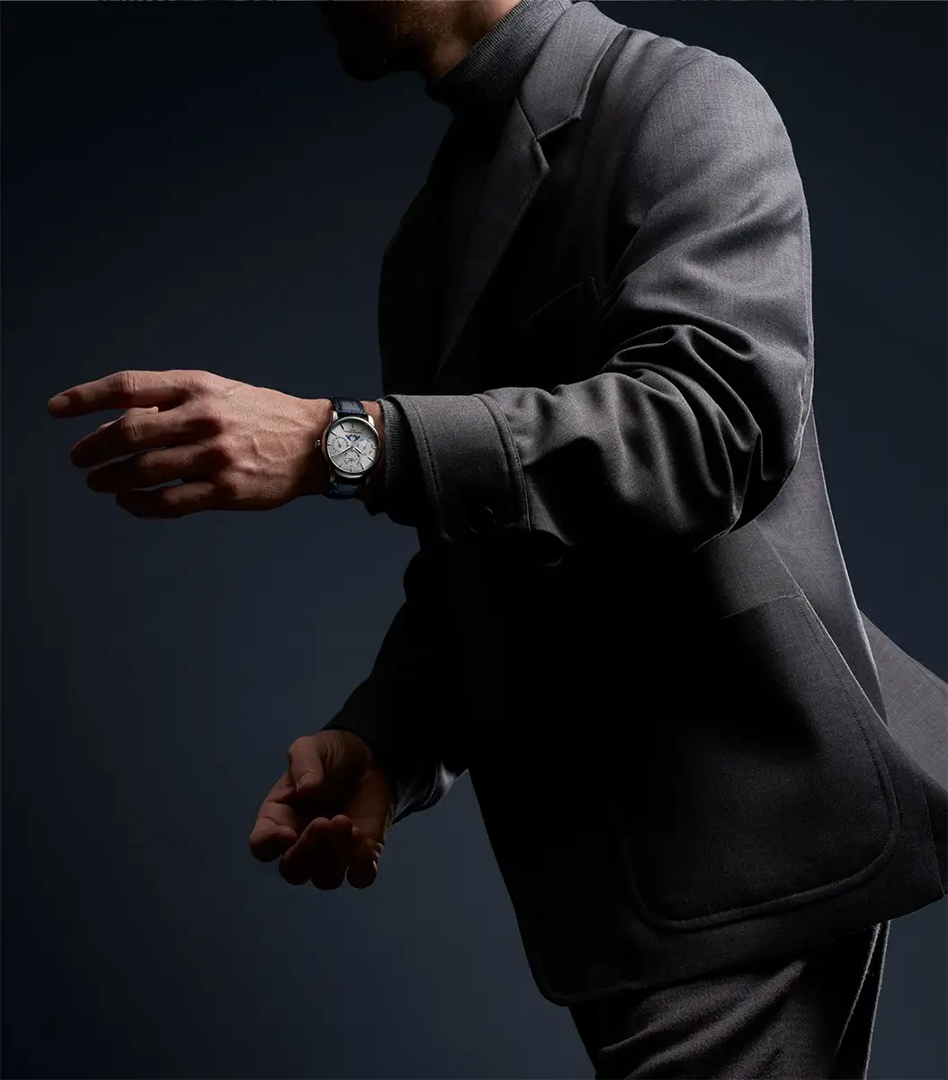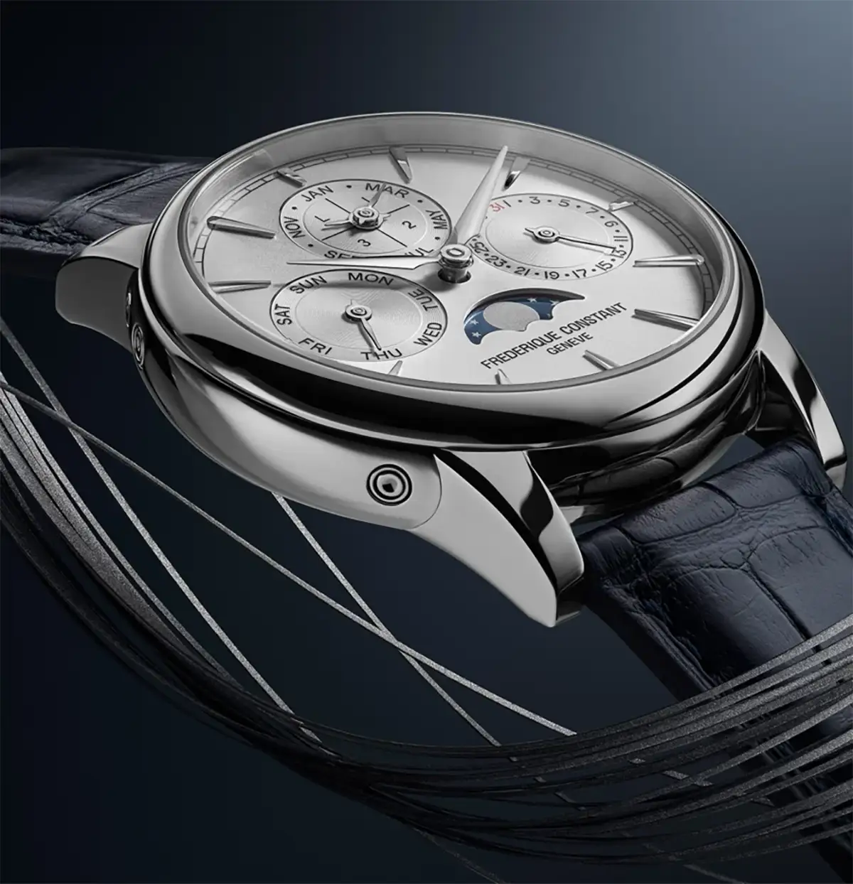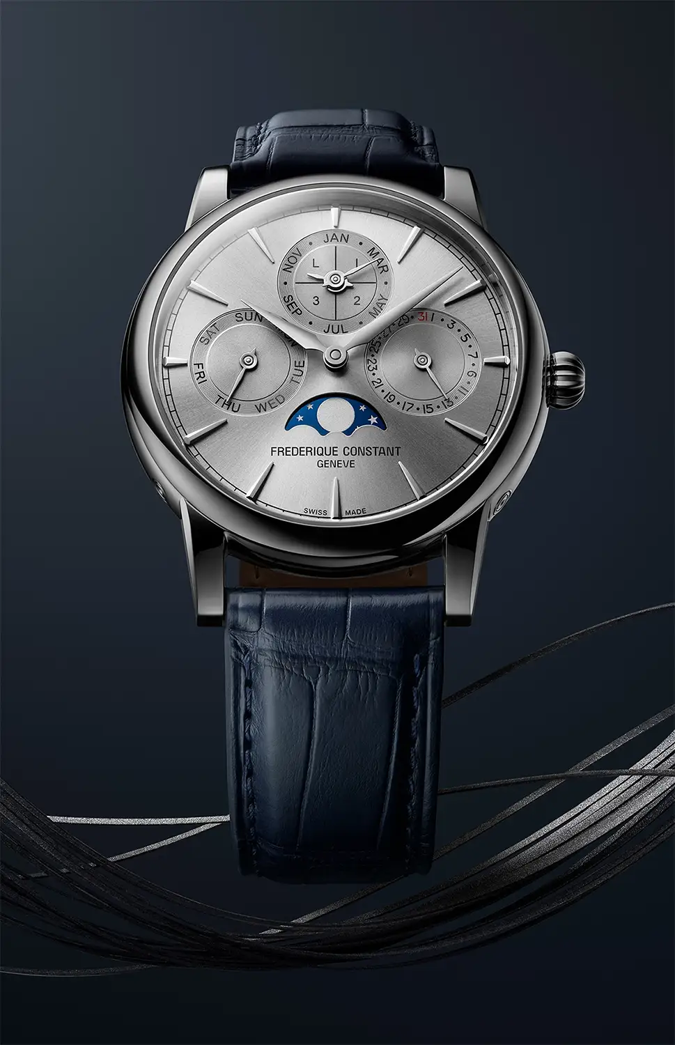 Uspořádání číselníku je přehledné a harmonické: subčíselník dne v týdnu na 9. hodině, data na 3. hodině, měsíce a přestupného roku na 12. hodině a fáze měsíce na 6. hodině. Každý z nich je navíc ozdoben jemným spirálovým brusem, který dodává ciferníku hloubku a trojrozměrný charakter. Štíhlé aplikované indexy a elegantní ručky typu dauphine dotvářejí celek a podtrhují vytříbený charakter hodinek.