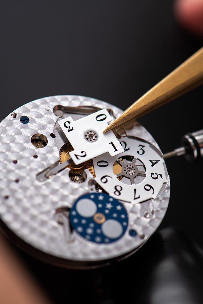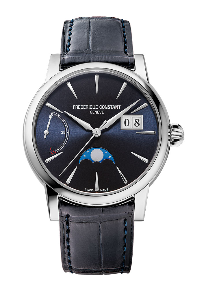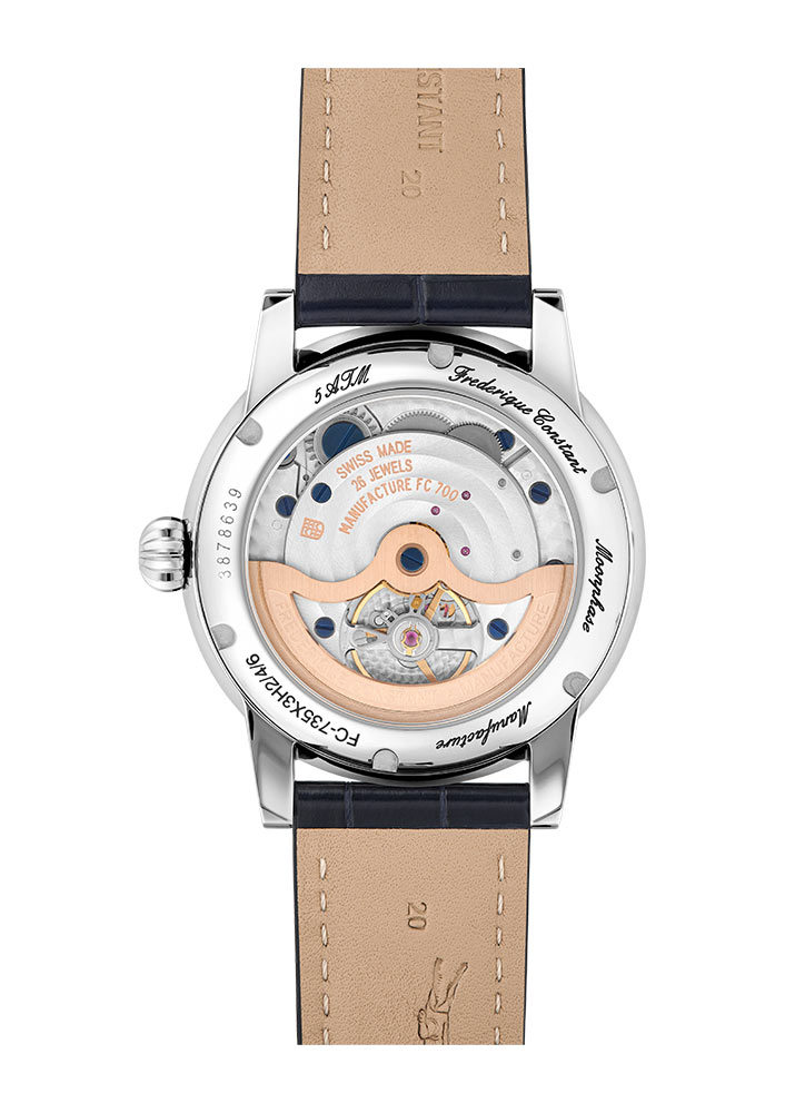 Na druhé straně mezi 2. a 3. hodinou je funkce Frederique Constant Big Date obklopená dvojitým oknem s oddělenou přihrádkou pro desítky a jednotky. Tato dokonalá rovnováha je dále zdůrazněna měsíční fází v 6 hodin na hvězdně modrém pozadí. Stejně jako všechny předchozí mechanismy se Frederique Constant ujistil, že tento byl intuitivní. Tři komplikace, funkce nastavení času a natahovací mechanismus se nastavují pomocí šikovné velké korunky na 3 hod. Bez tlačítek, korektorů a jehel je kalibr FC-735 vysloveně moderní. Promyšlené a navržené pro každodenní použití, pokračují v nadčasovém étosu: cenově dostupné hodinky, které nevyžadují žádné speciální hodinářské dovednosti ze strany nositele.
