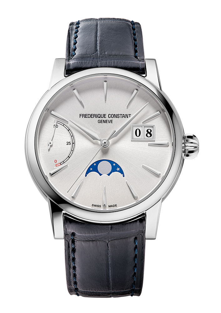 Luxusní klasické pánské hodinky Frederique Constant Classic Power Reserve Big Date Manufacture FC-735S3H6 vybavené třicátým prvním in-house kalibrem ženevské manufaktury Frederique Constant, FC-735. Jedná se o první proprietární strojek, který nabízí velký ukazatel data, fáze měsíce a rezervy chodu – nyní celkem 50 hodin. To druhé ukazuje štíhlá ručička pohybující se v oblouku v 9 hodin se stupnicí 0 až 50. Když je ručička v červené zóně, je to varování, že tyto elegantní pánské řemínkové hodinky je třeba natáhnout nebo se zastaví.