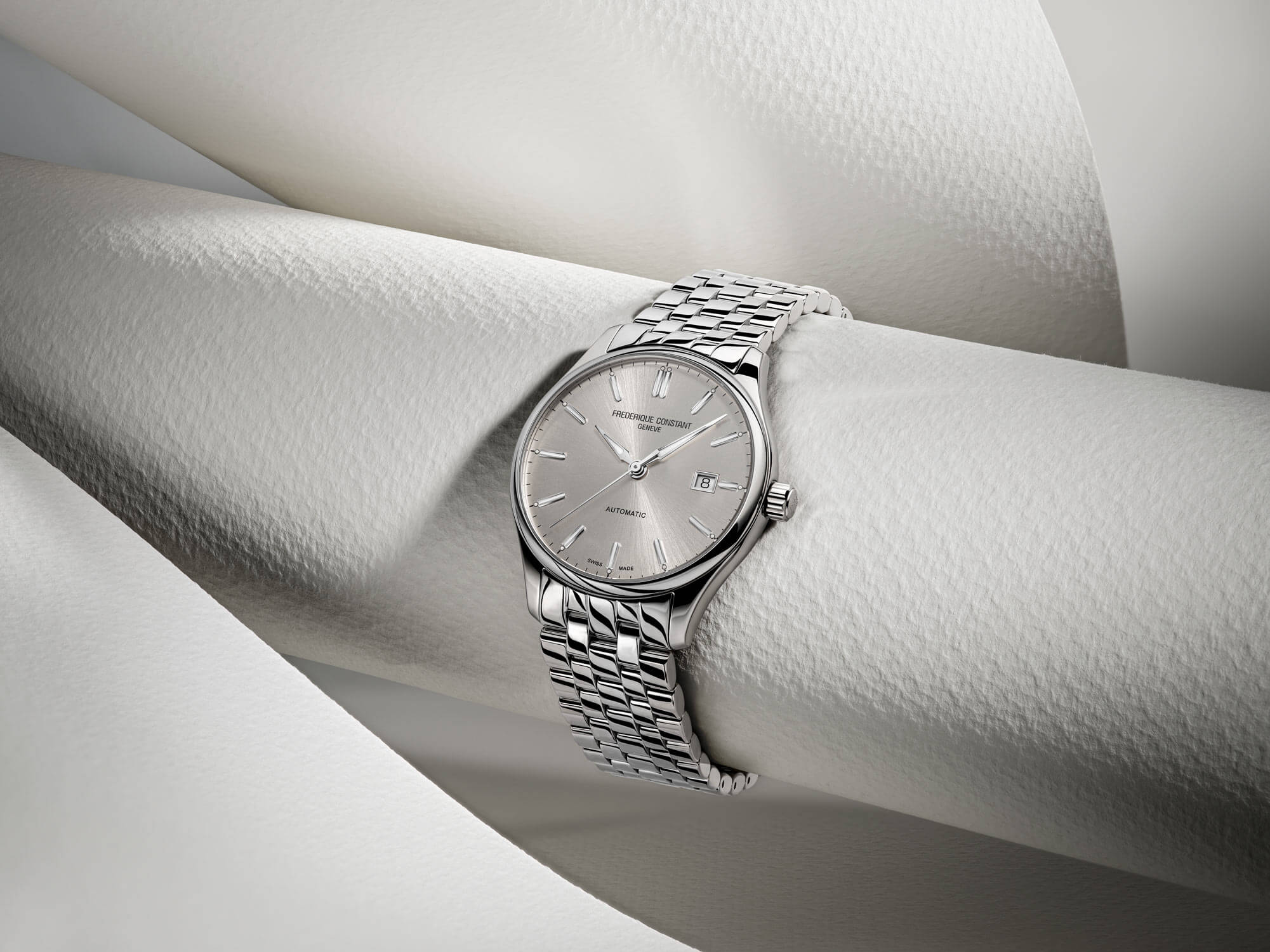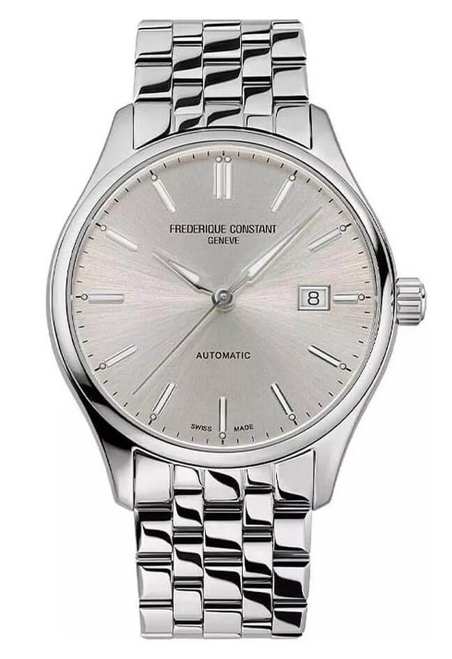 Ciferník hodinek je skutečnou klasikou designu – hluboký, lesklý stříbrný odstín, který se mění v závislosti na úhlu dopadajícího světla, jim dodává jedinečné kouzlo. Tento efekt přitahuje pozornost, avšak jemně a sofistikovaně. Stříbrné indexy a ručičky ladí s pouzdrem, čímž vytvářejí harmonický a elegantní celek. Na třetí hodině se nachází přehledný ukazatel data, který zvyšuje funkčnost modelu a činí jej praktickým společníkem pro každý den. Srdcem hodinek je švýcarský automatický strojek FC-303, který zajišťuje precizní chod a spolehlivost, jakou lze od prémiových časoměřičů očekávat. Jsou to hodinky, které spojují dokonalou estetiku s nekompromisní kvalitou.