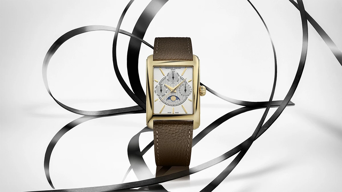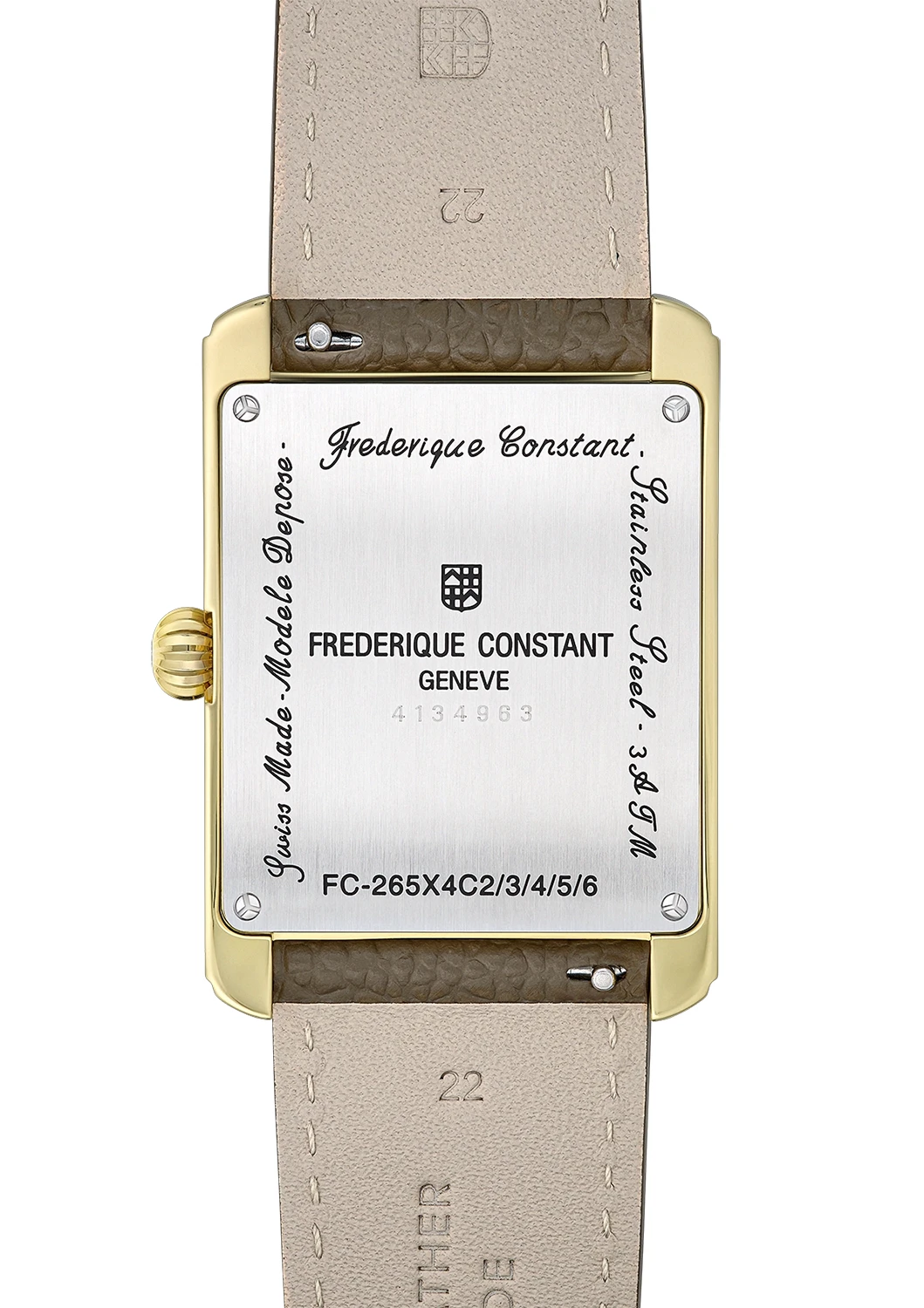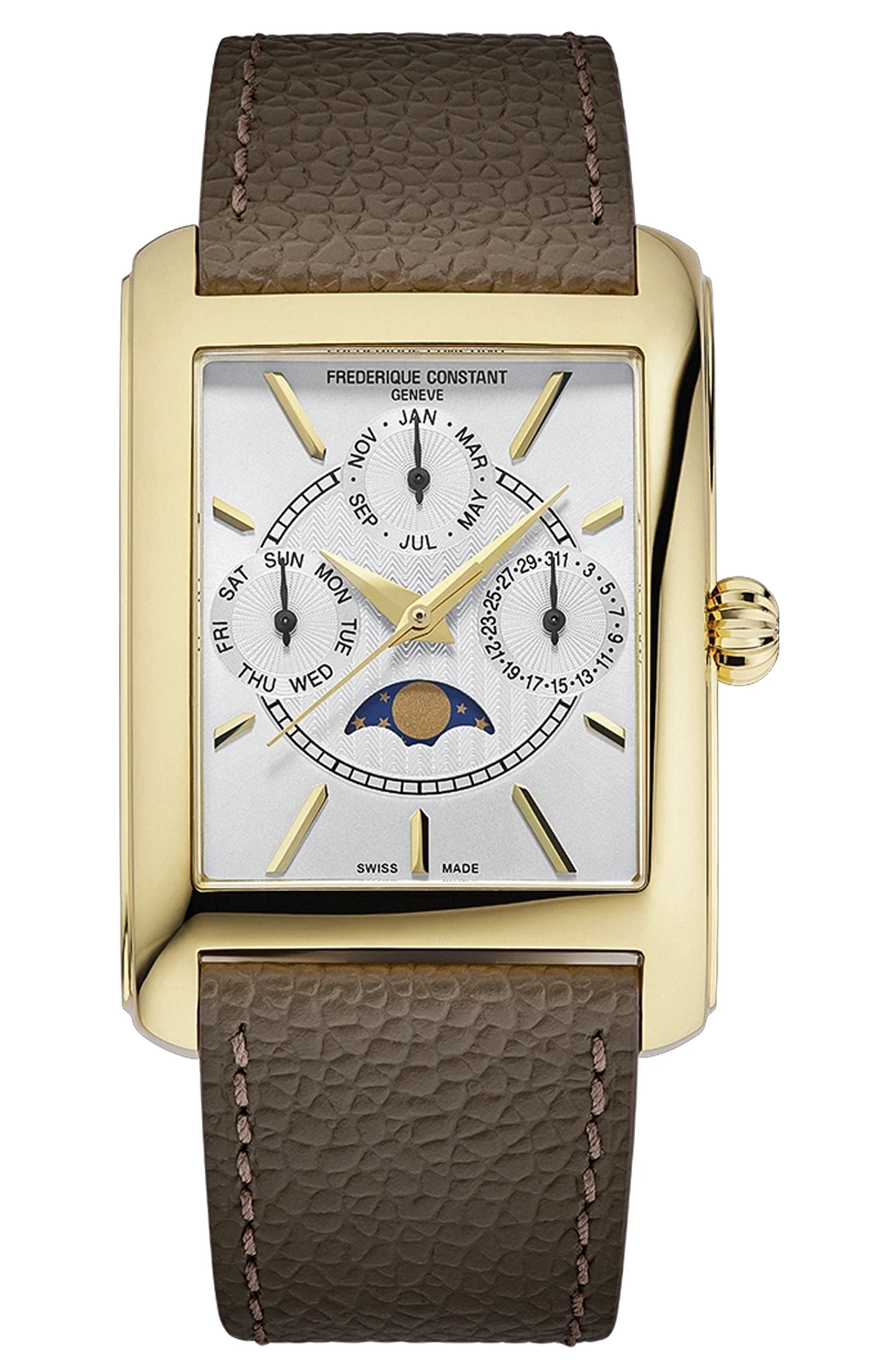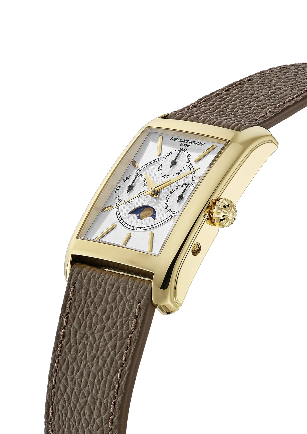 Pouzdro v barvě žlutého zlata kombinované s bílým číselníkem vytváří vytříbenou kompozici, v níž má každý detail svůj význam. Harmonické uspořádání ukazatelů prezentuje datum, den v týdnu a měsíc, zatímco decentní okénko měsíční fáze dodává číselníku charakter a připomíná tradici hodinek haute horlogerie. Křemenný strojek FC-265 zaručuje spolehlivost a jemné indexy i štíhlé ručky podtrhují elegantní charakter hodinek.