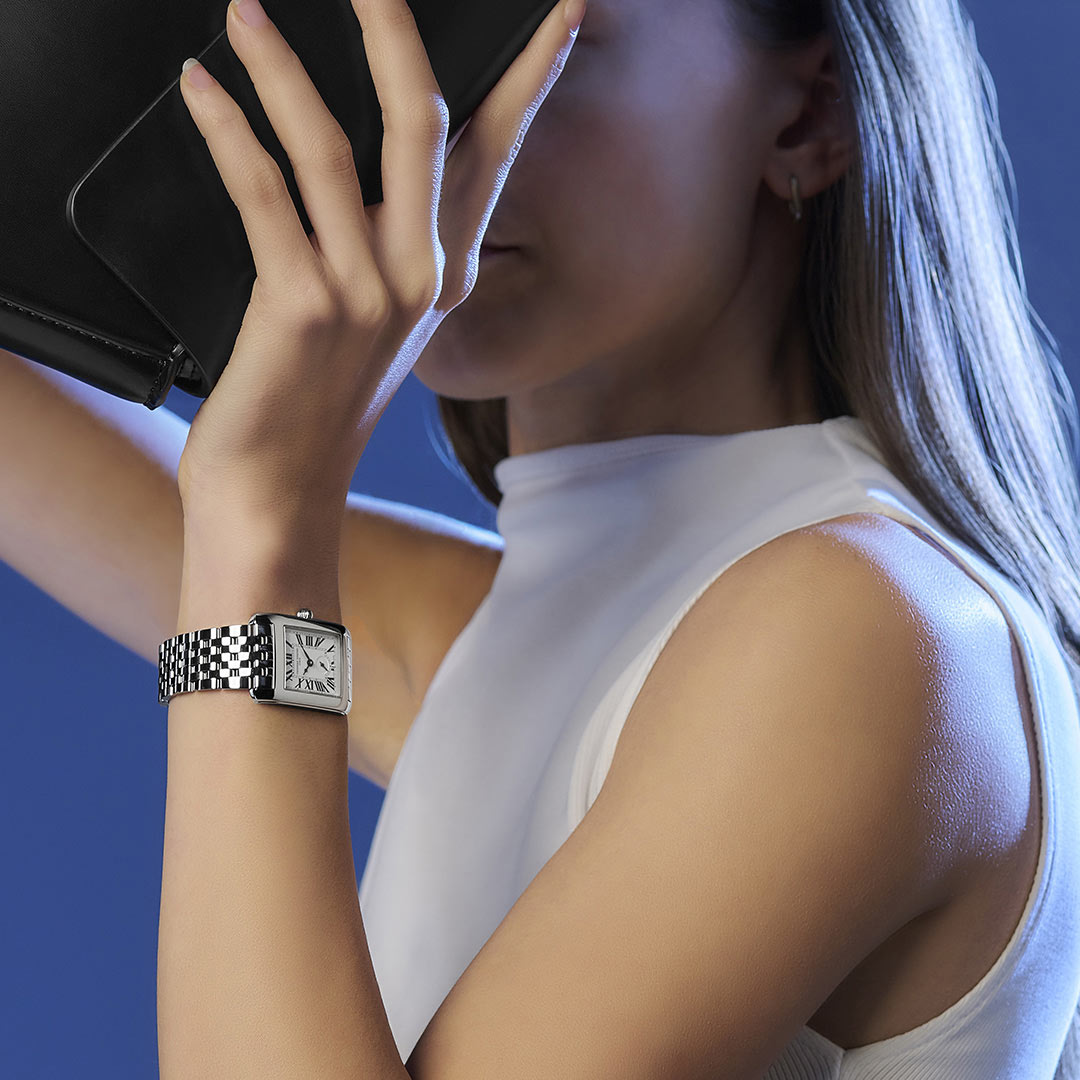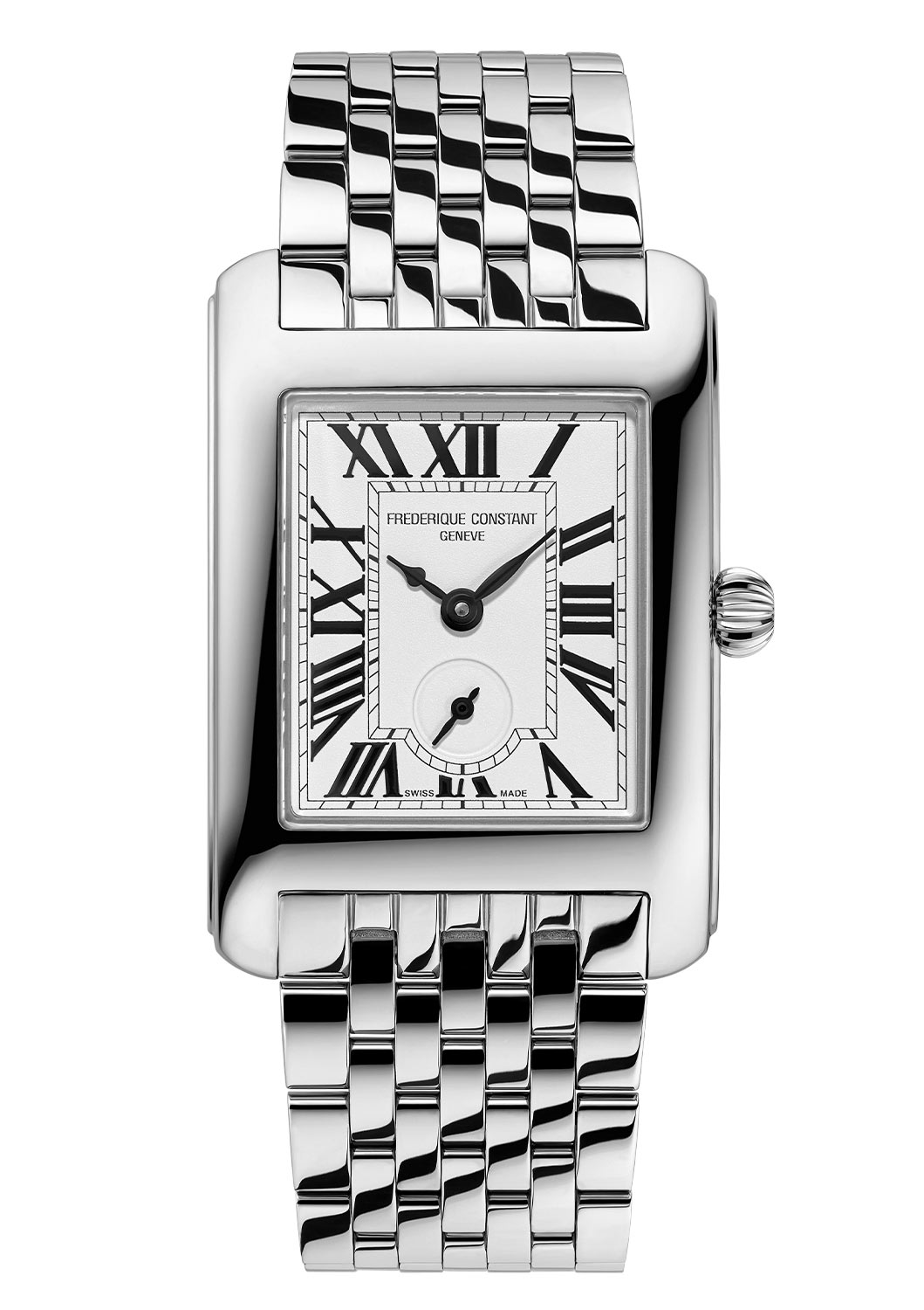 Před více než sto lety, ve 20. a 30. letech 20. století, vyrazili hodináři novou cestu, odklonili se od tradičních kulatých pouzder a uvedli na trh elegantní čtvercové a obdélníkové modely. Tyto inovativní designy, které vždy fascinují milovníky klasiky, jsou nyní znovu oživeny v podobě hodinek Frederique Constant Classics Carree FC-235S2C6B. Tyto hodinky jsou vyrobeny výhradně z oceli a jsou vybaveny přesným švýcarským strojkem s malou sekundovou komplikací. Stříbrný ciferník pokrytý tvrdým safírovým sklem, zdobený velkými římskými číslicemi, nabízí harmonické uspořádání: dvě centrální ručky a malá vteřinová ručka umístěná mimo střed, nad minutovým „sektorovým číselníkem“.