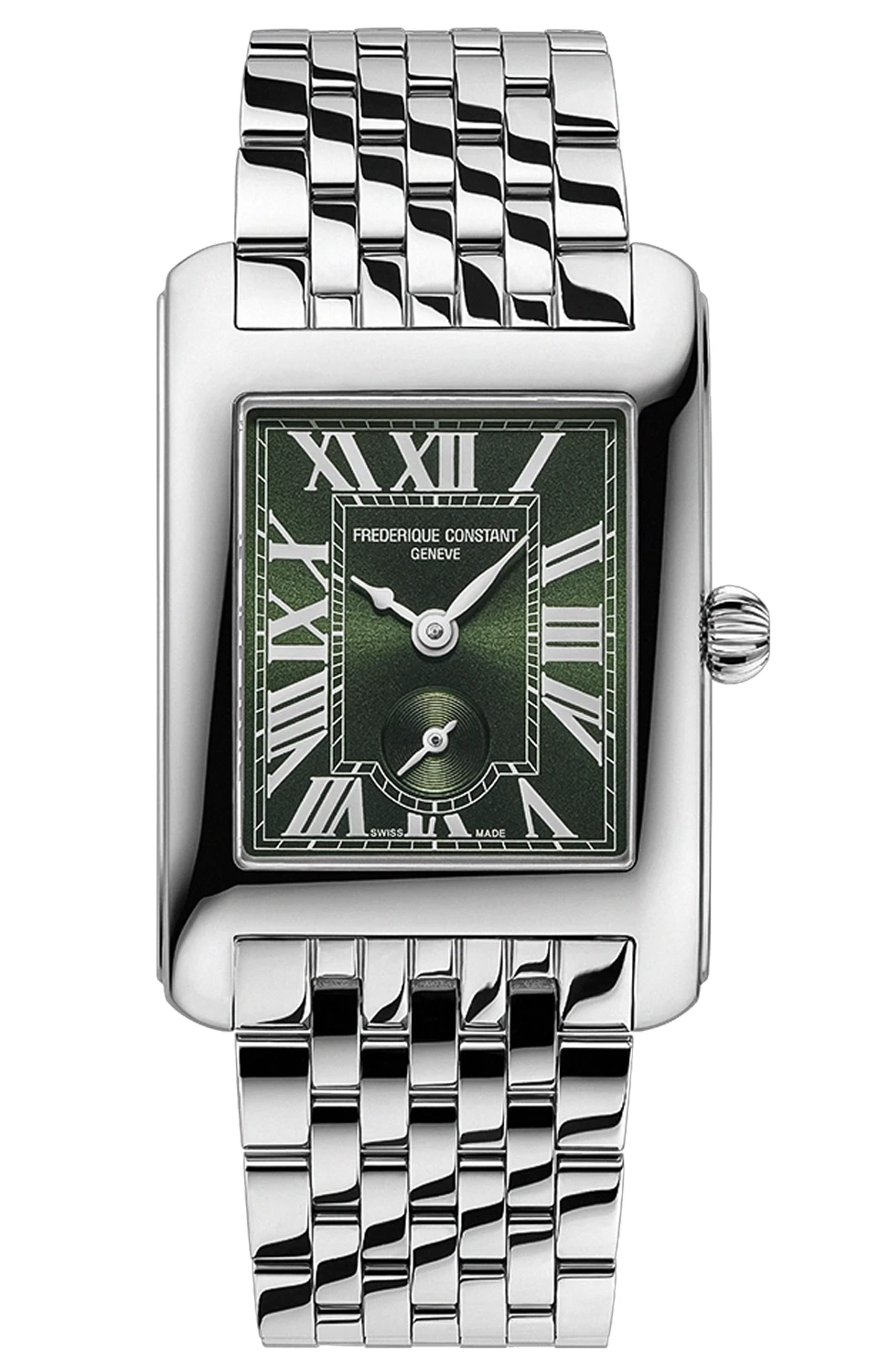 Frederique Constant Classics Carree Small Seconds FC-235GR2C6B jsou elegantní hodinky, které spojují ducha art déco s moderním švýcarským řemeslem. Obdélníkové pouzdro z ušlechtilé oceli o rozměrech 36 × 25,2 mm je doplněno elegantním náramkem s pětiřadovou konstrukcí, což celku dodává vyvážený a prestižní charakter. Srdcem modelu je švýcarský quartzový strojek FC-235, který zaručuje přesnost a pohodlí při používání bez nutnosti každodenního natahování.