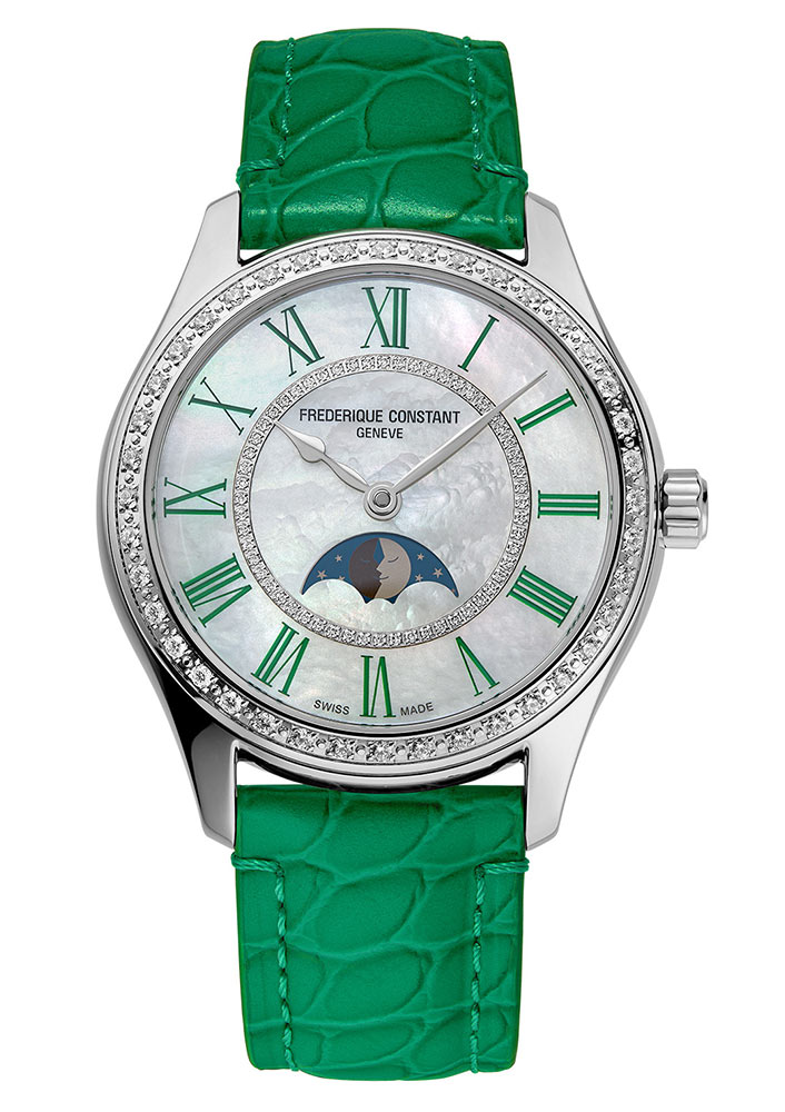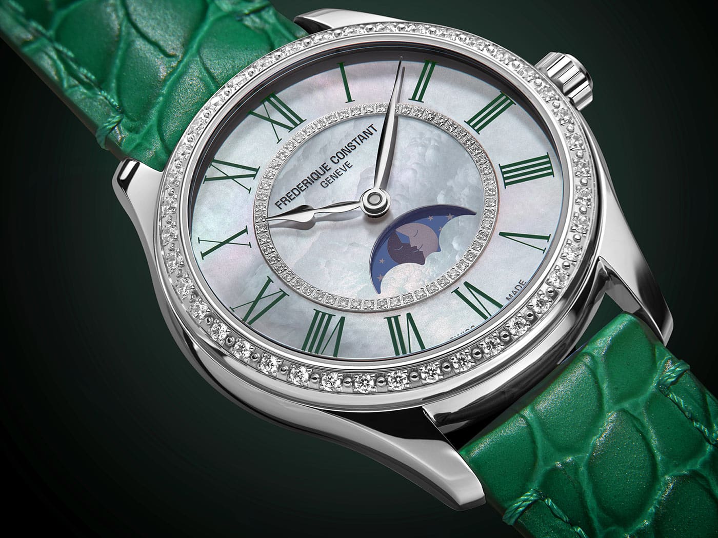 Frederique Constant Classics Elegance Luna je elegantní dámské hodinky navržené s ohledem na harmonii a romantiku. V centru kompozice jsou dva půlměsíce, které se objetím spojují na pozadí tarczy z perlové hmoty umístěné v 36milimetrovém ocelovém pouzdru. Hodinky s měsíčními fázemi jsou k dispozici ve čtyřech variantách, všechny s automatickým mechanismem a zdobené diamanty.
