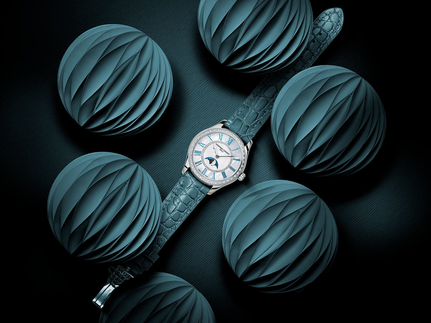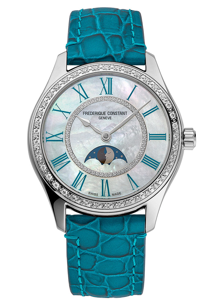Frederique Constant Classics Elegance Luna je elegantní dámské hodinky navržené s ohledem na harmonii a romantiku. V centru kompozice jsou dva půlměsíce, které se objetím spojují na pozadí perlového ciferníku umístěného v 36milimetrové ocelové pouzdře. Hodinky s měsíčními fázemi jsou nabízeny ve čtyřech variantách, všechny s automatickým mechanismem a zdobené diamanty.