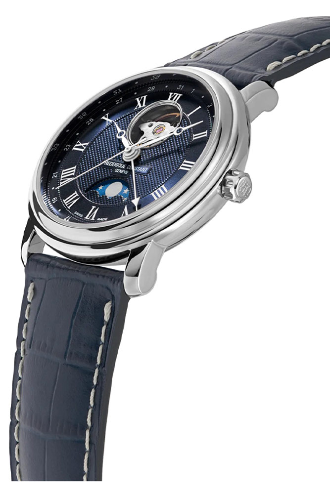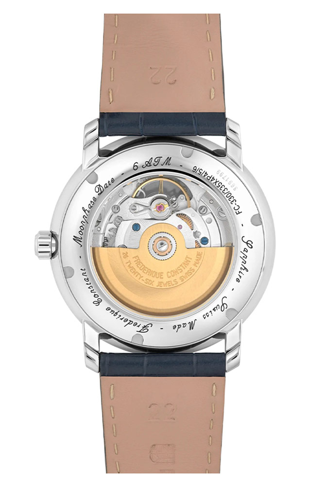 Dnešní nejnovější výtvor této řady, hodinky Frederique Constant FC-335MCNW4P26 s měsíční fází, pokračují ve zkoumání svého klasického charakteru s dokonale vyváženým 40mm pouzdrem. Díky své nadčasové, tradiční a moderní preciznosti harmonicky padne na každé zápěstí. Kompozice číselníku odráží stejnou rovnováhu. Ve 12 hodin čeká na objevení výraz hodinářského know-how, kterým se Frederique Constant od samého počátku vyznačoval. Otvor „Heart Beat“, navržený téměř před 30 lety, odhaluje tlukoucí srdce hodinek. Mechanismus byl navržen se zvláštním zaměřením na jednoduchost. Hodiny, minuty, datum a měsíční fáze se nastavují jedinou korunkou. První poloha navíjí pohyb a čtvrtá reguluje čas. Datum lze změnit na druhé pozici a fázi měsíce na třetí pozici, pokud jsou nejprve ručičky nastaveny na 10:10, protože to chrání mechanismus před poškozením.