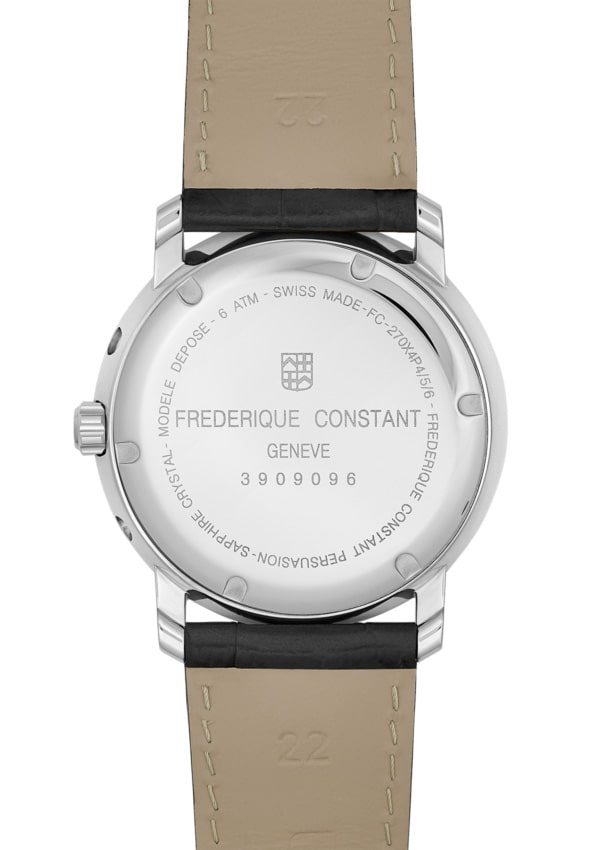 Frederique Constant FC-270SW4P26 jsou elegantní pánské hodinky k obleku z leštěné nerezové oceli 316L o velikosti 40 mm. Na pravé straně je pohodlná krajka. Výrobce spároval tyto pánské hodinky s datumem a dnem v týdnu s černým koženým řemínkem. Tento řemínek je měkký a lehký, což zajistí pohodlí při jeho používání - lze jej zapnout na zápěstí díky klasické přezce.