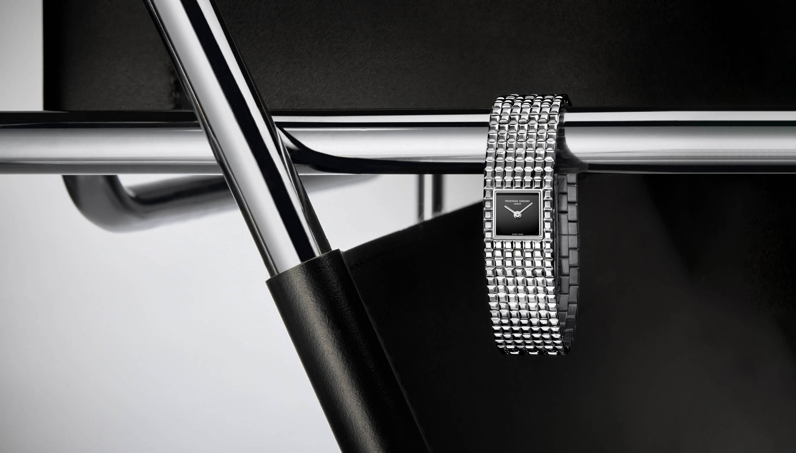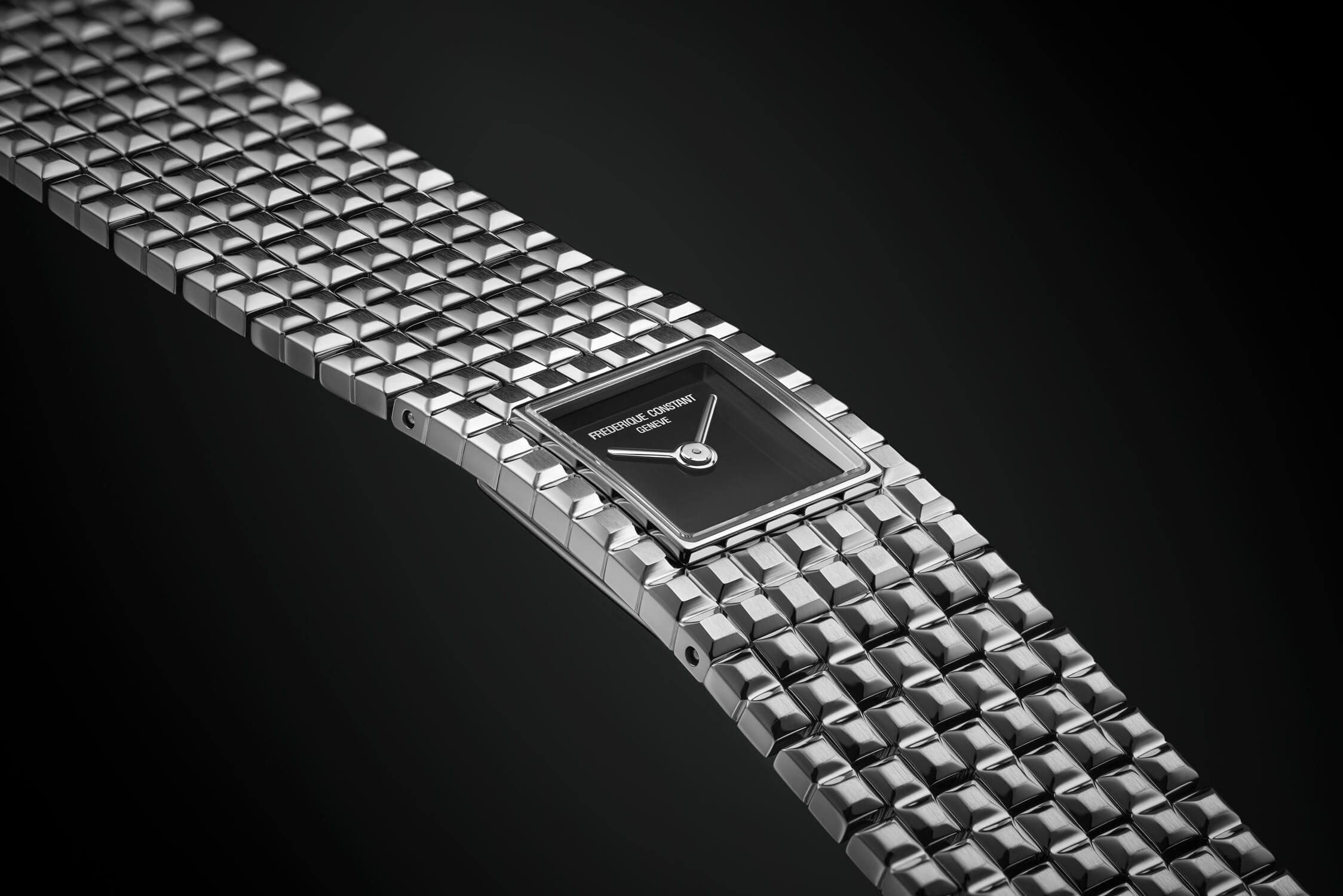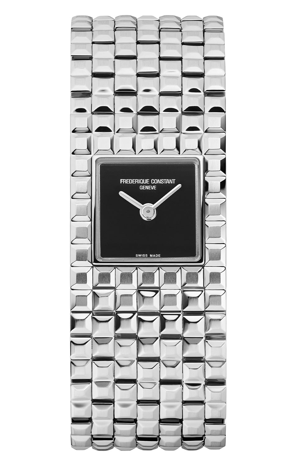 Náramek ve formě manžety je tvořen ze sedmi článků a zakončen skrytým, integrovaným zapínáním, které nenarušuje rytmus konstrukce. Celek je pokryt geometrickým vzorem Clous de Paris – pravidelným, ale ne jednotvárným, elegantním, ale ne usedlým. Tento motiv se opakuje také na čtvercovém číselníku z černého onyxu, z něhož vystupují klasické ručičky. Černý číselník z přírodního onyxu vyzařuje hloubku a klid, zatímco absence indexů zdůrazňuje jeho minimalistický charakter a kamennou, téměř meditativní čistotu. Pouzdro o rozměrech 25,7 × 20 mm z nerezové oceli spojuje šperkovou lehkost s nadčasovou odolností, zatímco švýcarský quartzový strojek zajišťuje, že tento stylový doplněk funguje stejně přesně, jako vypadá.