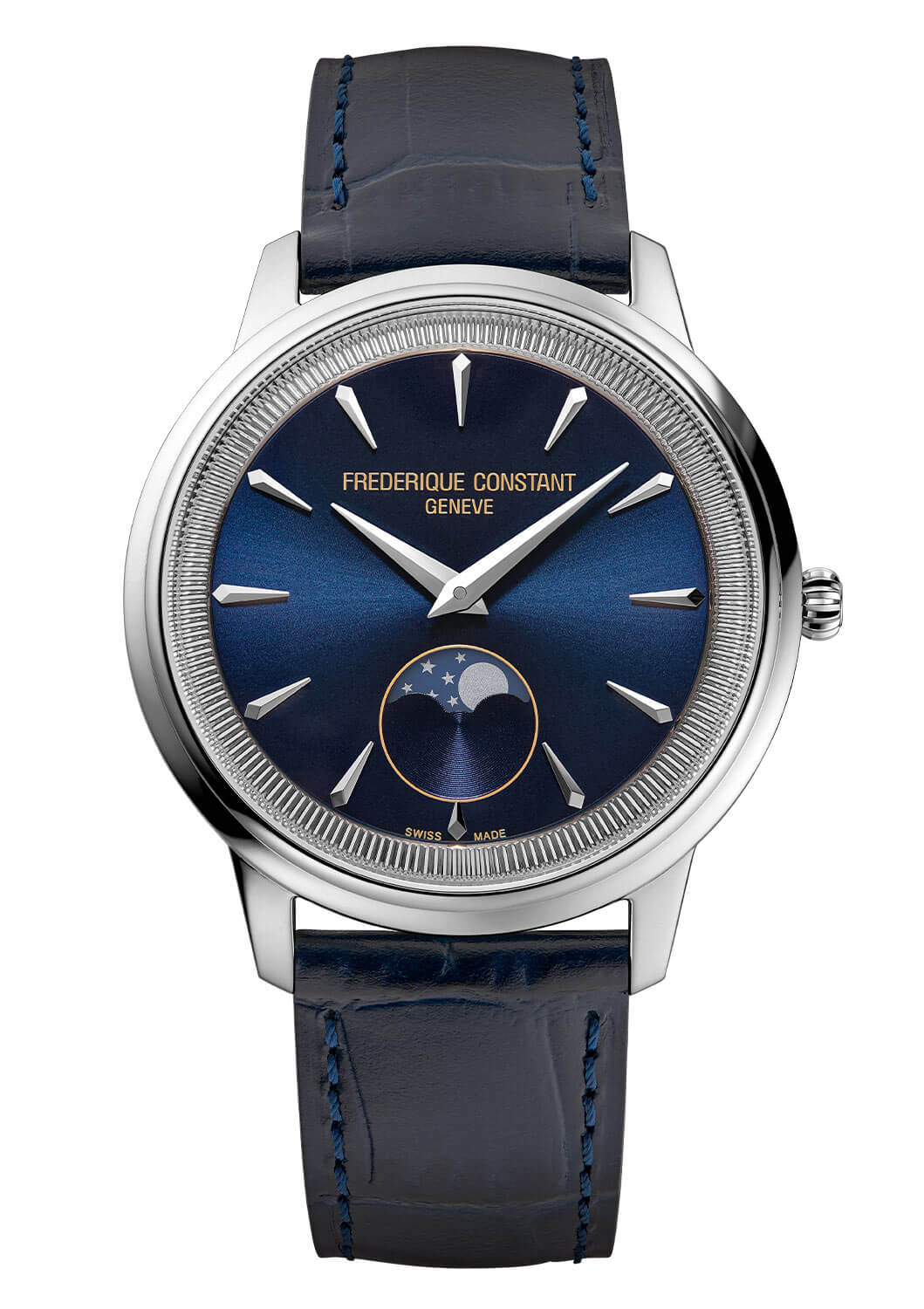 Hodinky švýcarské výroby Frederique Constant Moneta FC206N3S6, dostupné s elegantním modrým ciferníkem, kombinují tradiční, mistrovské hodinářské zpracování. Dvě rafinovaně upravené ručičky dauphine tomu dodávají třídu a absence druhé ručičky je vědomým krokem, který zdůrazňuje harmonii a eleganci designu. Ciferník je zdoben jemným solárním brusem, má aplikované tenké klínové indexy a subciferník fáze měsíce na 6. hodině, který obohacuje hodinky o další funkčnost a vytříbený styl. Švýcarský kalibr FC-206 funguje pod číselníkem a zajišťuje přesné měření času a zobrazení fáze měsíce.