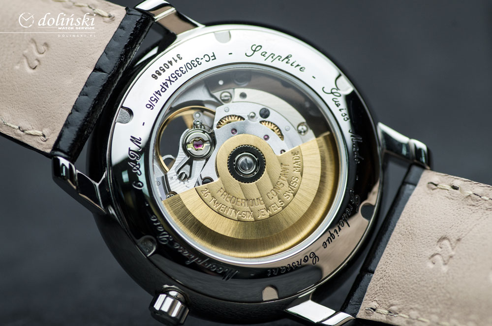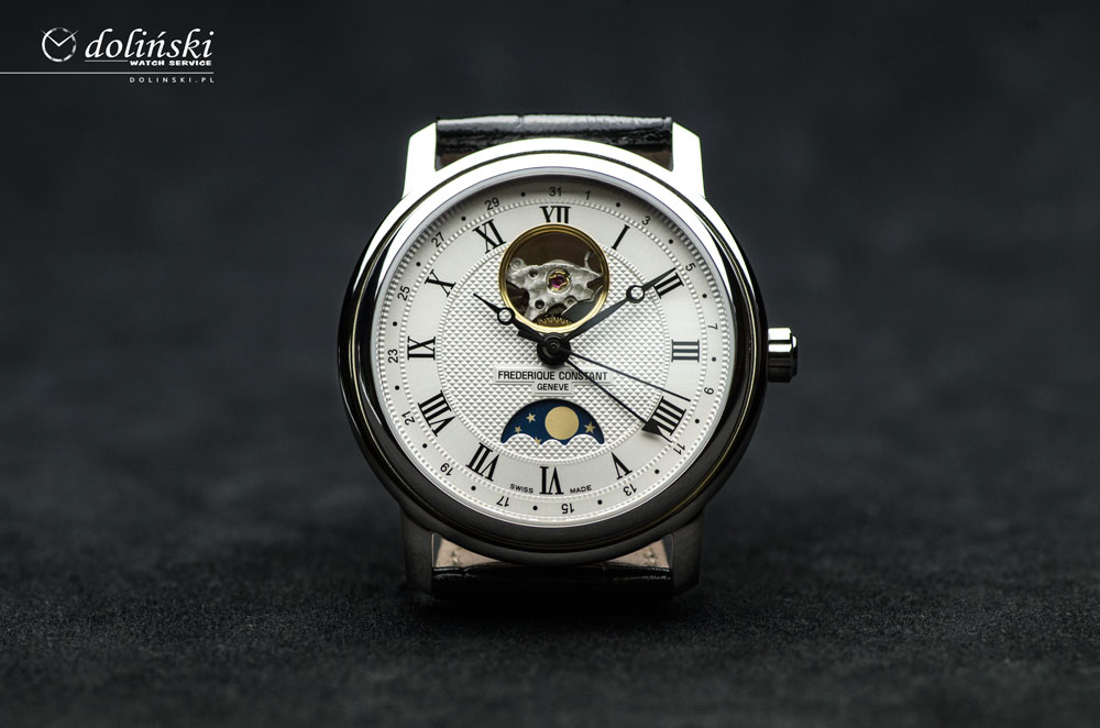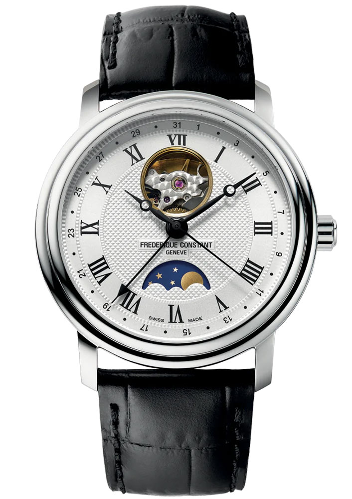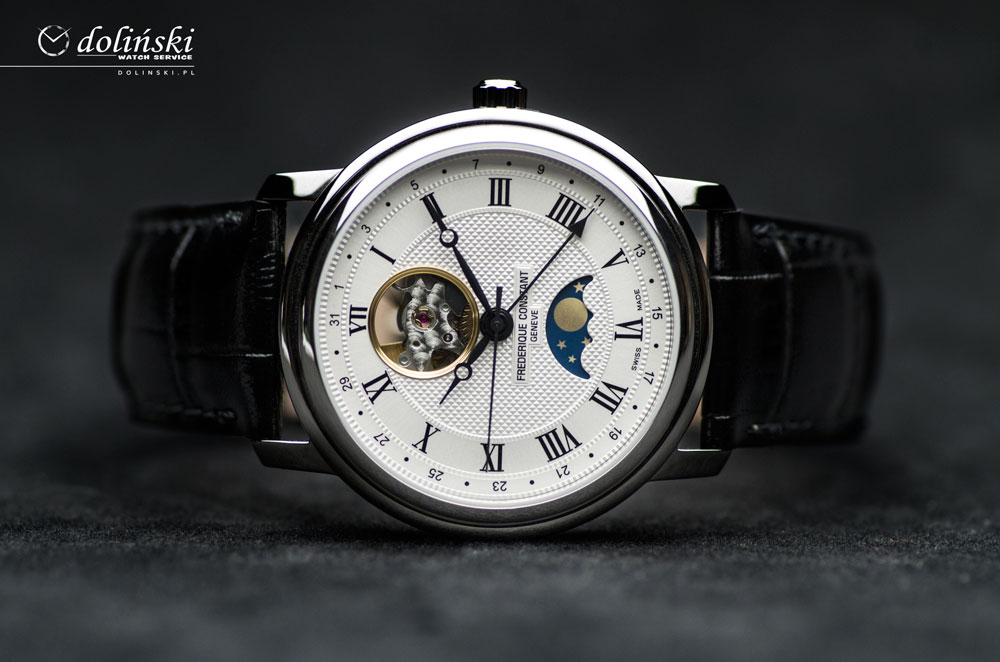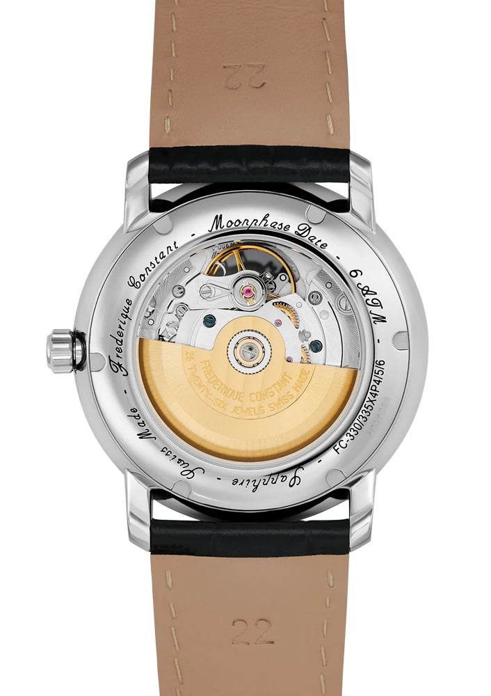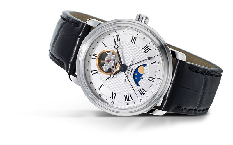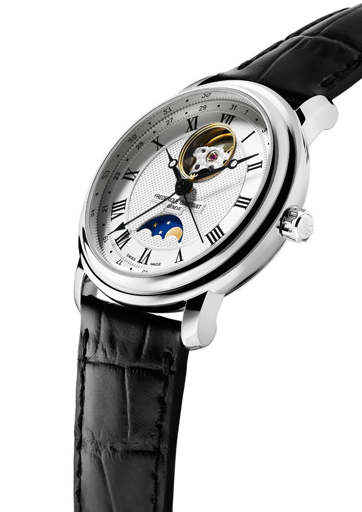 Dnešní nejnovější výtvor této řady, hodinky Frederique Constant FC-335MC4P6 s měsíční fází, pokračují ve zkoumání svého klasického charakteru s dokonale vyváženým 40mm pouzdrem. Díky své nadčasové, tradiční a moderní preciznosti harmonicky padne na každé zápěstí. Kompozice číselníku odráží stejnou rovnováhu. Ve 12 hodin čeká na objevení výraz hodinářského know-how, kterým se Frederique Constant od samého počátku vyznačoval. Otvor „Heart Beat“, navržený téměř před 30 lety, odhaluje tlukoucí srdce hodinek. Mechanismus byl navržen se zvláštním zaměřením na jednoduchost. Hodiny, minuty, datum a měsíční fáze se nastavují jedinou korunkou. První poloha navíjí pohyb a čtvrtá reguluje čas. Datum lze změnit na druhé pozici a fázi měsíce na třetí pozici, pokud jsou nejprve ručičky nastaveny na 10:10, protože to chrání mechanismus před poškozením.