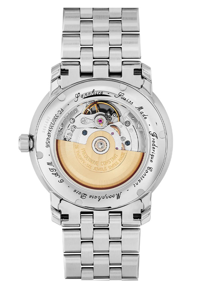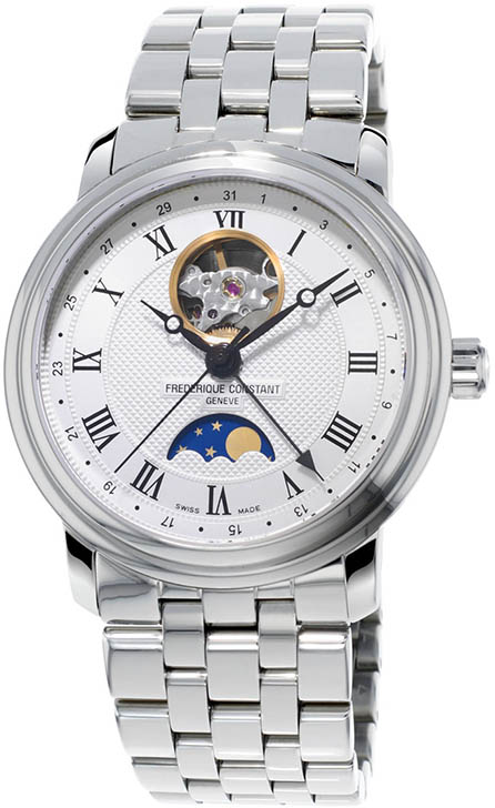 Klasické hodinky Frederique Constant se speciálním otvorem (otevřené srdce) na 12. hodině s náhledem na pracovní vyvážení mechanismu. Pro pozorovatele jde o vizuálně nejatraktivnější část mechanismu. Hodinky mají navíc ukazatel data v podobě ručičky, která ukazuje číslo dne v měsíci po obvodu ciferníku a fázi měsíce. Hodinky propracované do nejmenších detailů, kterým návrháři Frederique Constant přikládají maximální význam. Jsou to právě precizně propracované detaily, které tyto hodinky odlišují od všech ostatních švýcarských značek ve stejném cenovém segmentu. Originální technologická řešení, prestiž a třída samy o sobě dokazují nejvyšší kvalitu švýcarského hodinářství provozovaného s vášní pro vytváření krásných a luxusních produktů.