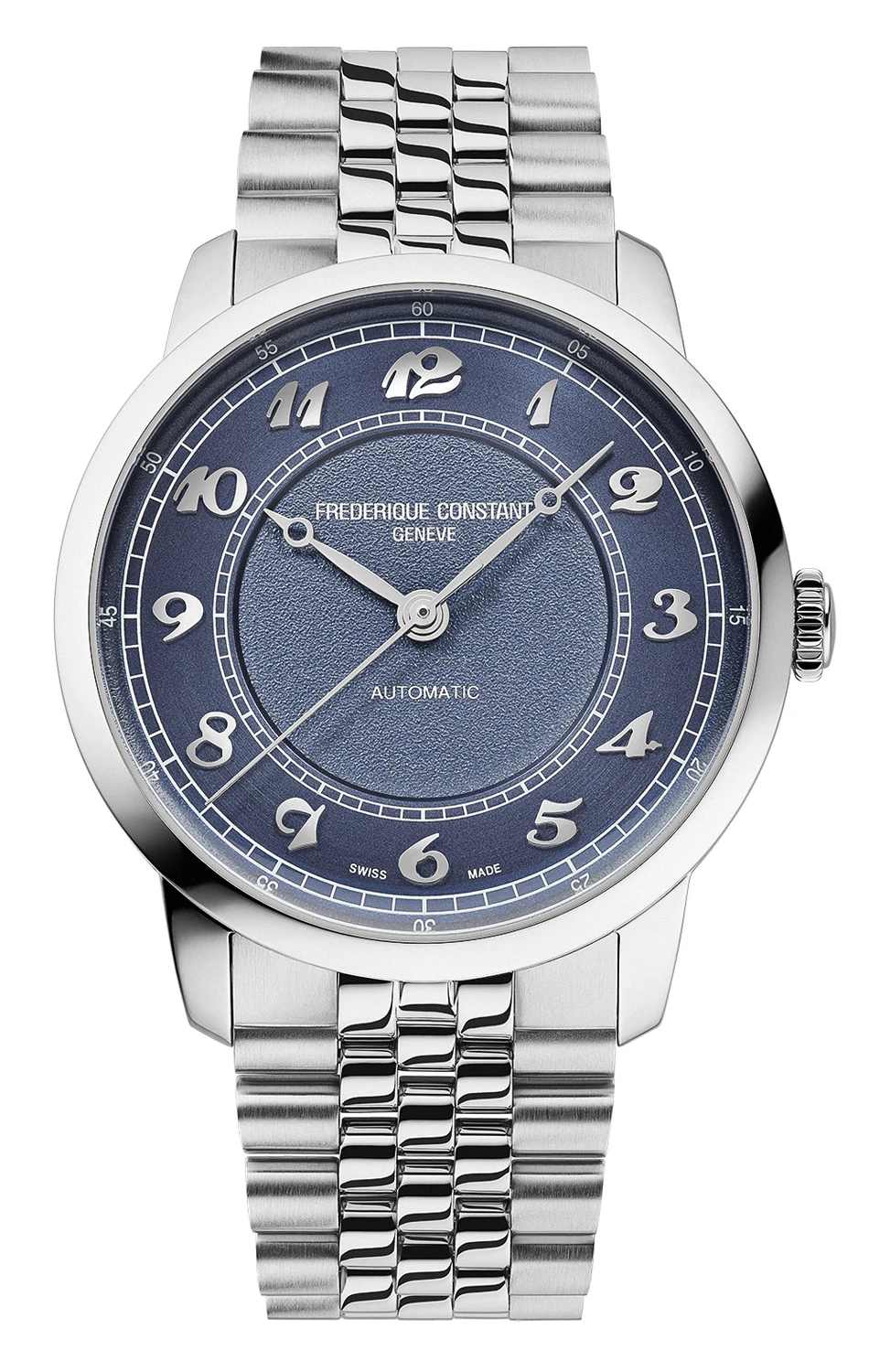Frederique Constant Classics Premiere FC-301BL3B6B okouzluje číselníkem v hluboké modři, jehož jemná textura a lesk slunečního brusu vytvářejí jedinečnou hru světla. Design inspirovaný estetikou poloviny 20. století vyniká arabskými číslicemi ve vintage stylu a ručkami typu pomme, které zajišťují čitelnost i eleganci zároveň. Minutová stupnice „railtrack“ evokuje ducha art déco a dodává celku nadčasový charakter.