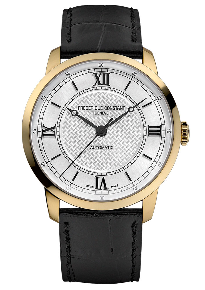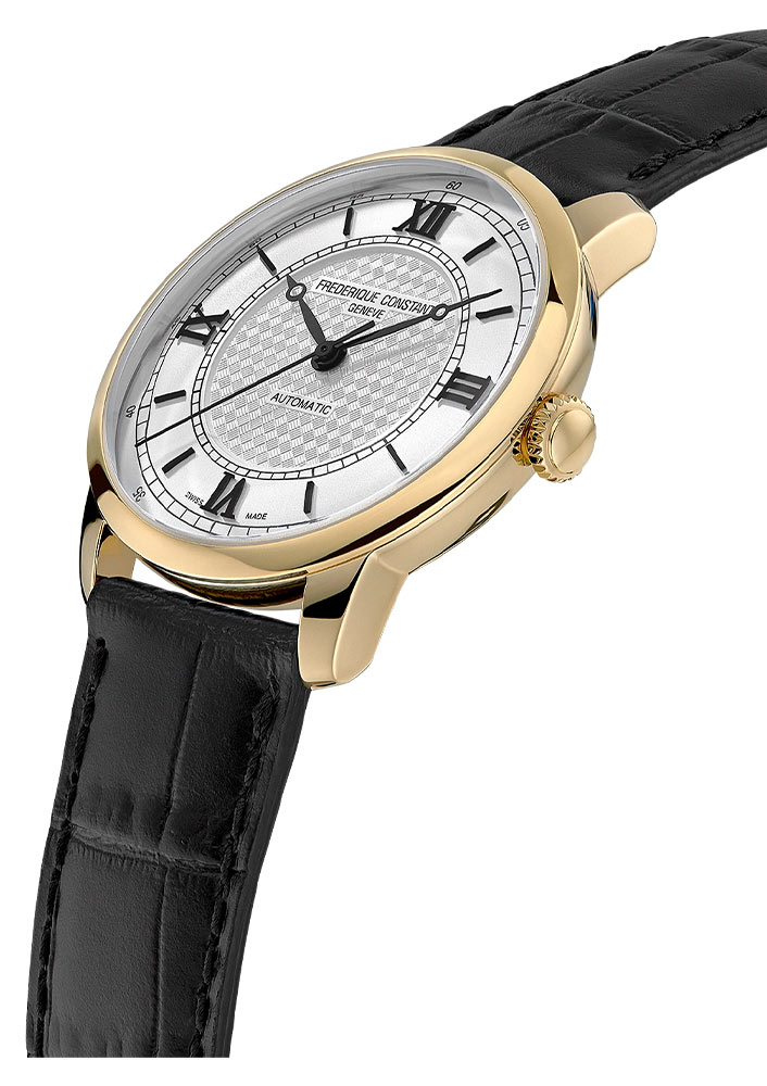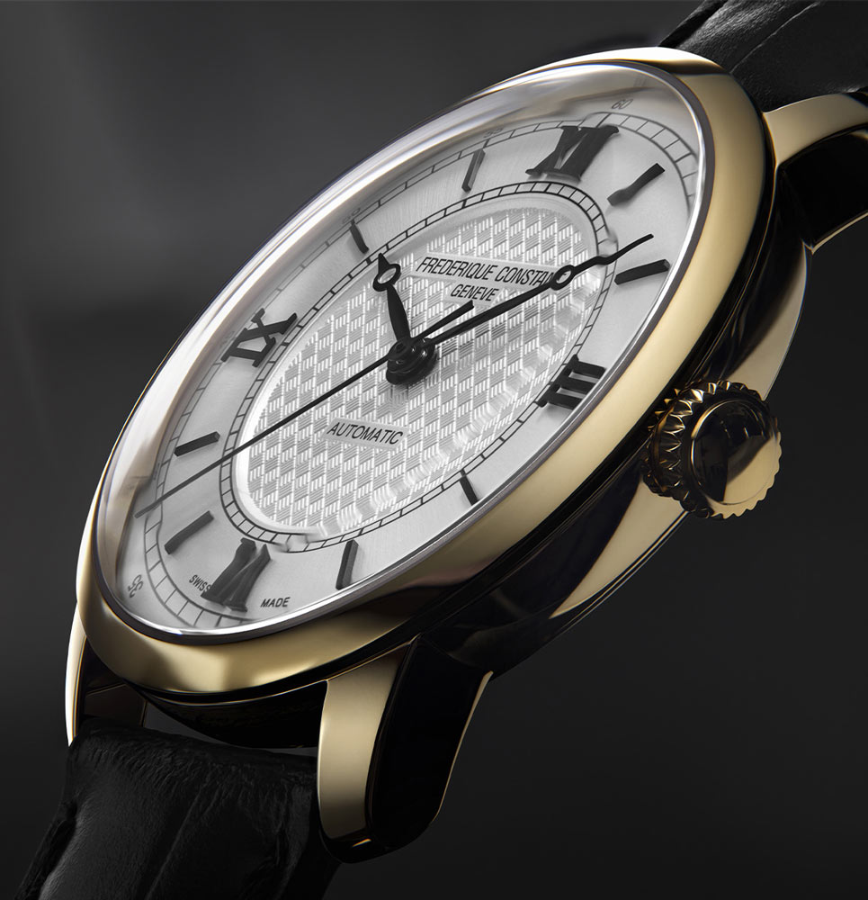 Tento pozlacený model je spojením dědictví švýcarského hodinářství. Pod vysoce odolným safírovým sklem se nachází estetický ciferník. Střední část ciferníku je zdobena gilošováním a pyšným logem značky Frederique Constant, zatímco vnější část je opatřena římskými číslicemi a minutovým kroužkem, který připomíná železniční tratě. Hodinu lze přečíst díky charakteristickým, elegantním ručičkám typu Breguet s kroužkem a špičkou na vrcholu. Pod ciferníkem se nachází manufakturní automatické srdce časoměru Manufacture La Joux Perret G100 – mechanismus poháněný pohybem zápěstí s rezervou chodu až 68 hodin. Automatické mistrovské dílo hodinářství je přesné a zajistí dokonalou práci měření času. Průhledné dýnko na zadní straně pouzdra tohoto časoměru umožňuje obdivovat tlukot srdce a dekorace Côtes de Genève.
