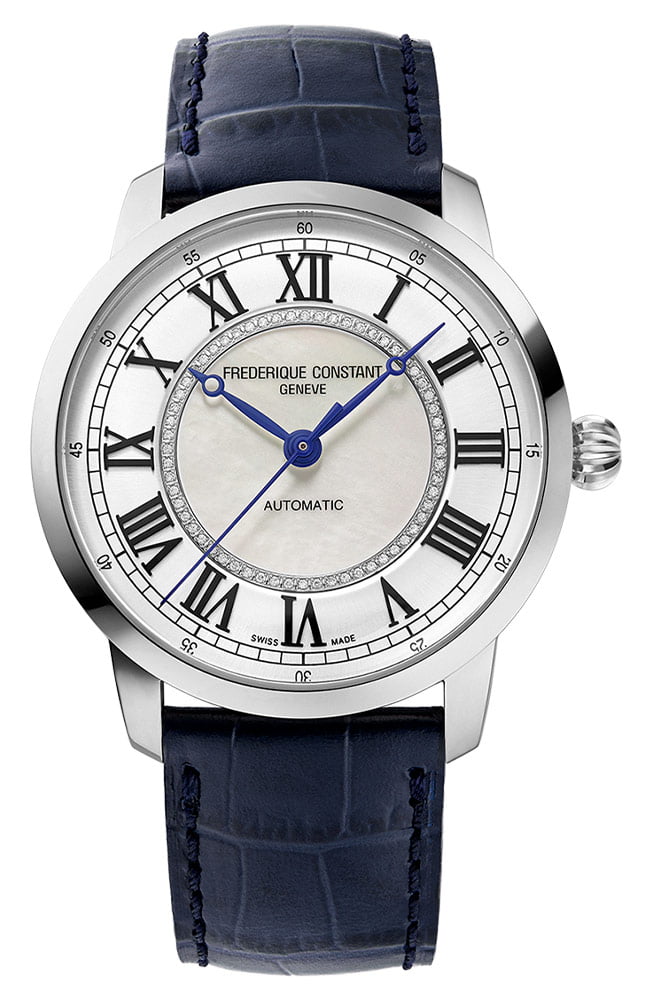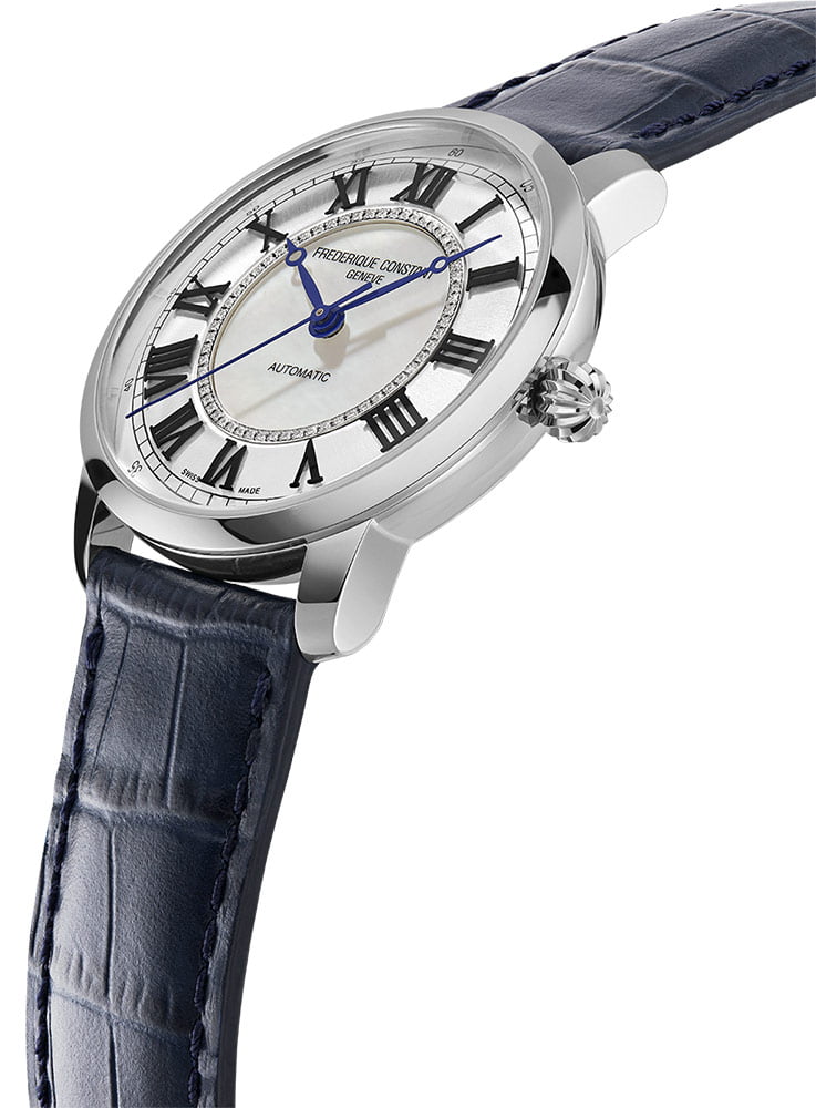 Tento elegantní model je kombinovaným dědictvím švýcarského hodinářství. Pod safírovým sklíčkem vysoce odolným proti poškrábání se nachází estetický stříbrný ciferník. Vnitřní kruh ciferníku zdobí nádherné diamanty a hrdé logo Frederique Constant, zatímco vnější kruh zdobí římské číslice a minutové kolečko, které připomíná vlakové koleje. Diamantů je až 60 a jejich hmotnost je 0,06 ct. Čas lze číst díky charakteristickým, elegantním ručičkám typu Breguet s prstenem a bodcem nahoře. Pod ciferníkem je automatické srdce Manufacture La Joux Perret G100 , Machineek poháněný zápěstím s rezervou chodu až 68 hodin. Mistrovské dílo automatického hodináře je přesné a poskytne vynikající časomíru. Vysoká rezerva chodu vám umožní odpočinout si od používání hodinek, aniž byste se museli bát, že přestanou pracovat. Skleněné víko na zadní straně těchto limitovaných hodinek vám umožní obdivovat tlukot srdce a dekorace Côtes de Genève .