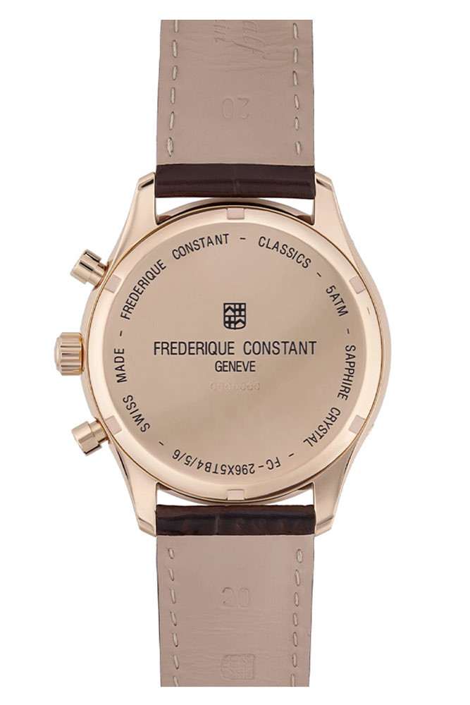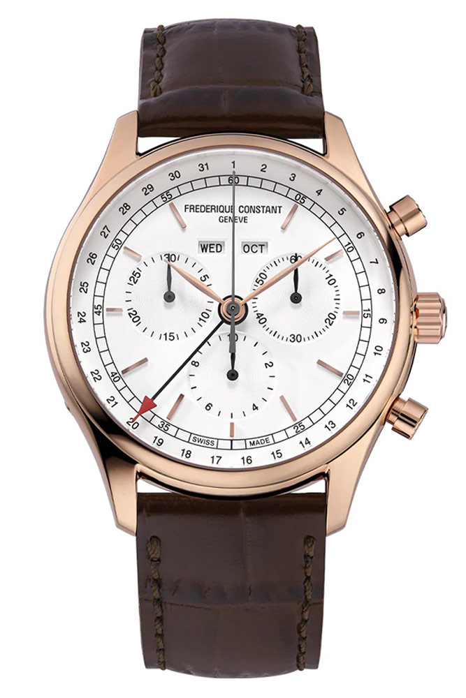Frederique Constant Classics Quartz Chronograph Triple Calendar FC-296SW5B4 klasické pánské hodinky s chronografem a rozšířeným zobrazením data . Umístěno v elegantním, pozlaceném pouzdře o malém průměru 40 mm . Vybaven třemi dílčími ciferníky stopek a dvěma jasnými, obdélníkovými okny ukazujícími den v týdnu a měsíc. Na ciferníku jsou navíc dva kroužky. Jeden ve stylu železničních tratí s vteřinovou stupnicí, druhý, což je číselný seznam dnů v měsíci. Každý prsten má odpovídající vodítko. Základní časovou stupnici tvoří pozlacené aplikované lineární indexy následované dvěma štíhlými ručičkami listového typu. Celý ciferník v elegantní bílé barvě zdobí jemný lesk. Kromě zmenšeného průměru jsou retro podtexty tohoto modelu ovlivněny nepoškrábatelným, sférickým safírovým sklíčkem a koženým řemínkem z aligátoří. Velkou spokojenost způsobí i pohled na kvalitní detaily, jako jsou linie, výřezy v ciferníku, speciální textury knoflíků, loga na korunce nebo prošívání řemínku. Klasické hodinky na hnědém koženém řemínku z kolekce Classics Quartz jsou luxusní každodenní hodinky pro muže, který má rád čas plně pod kontrolou.