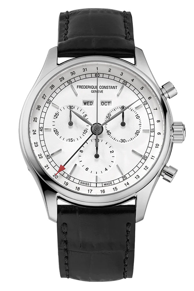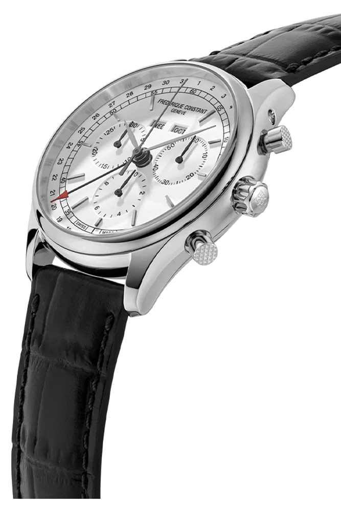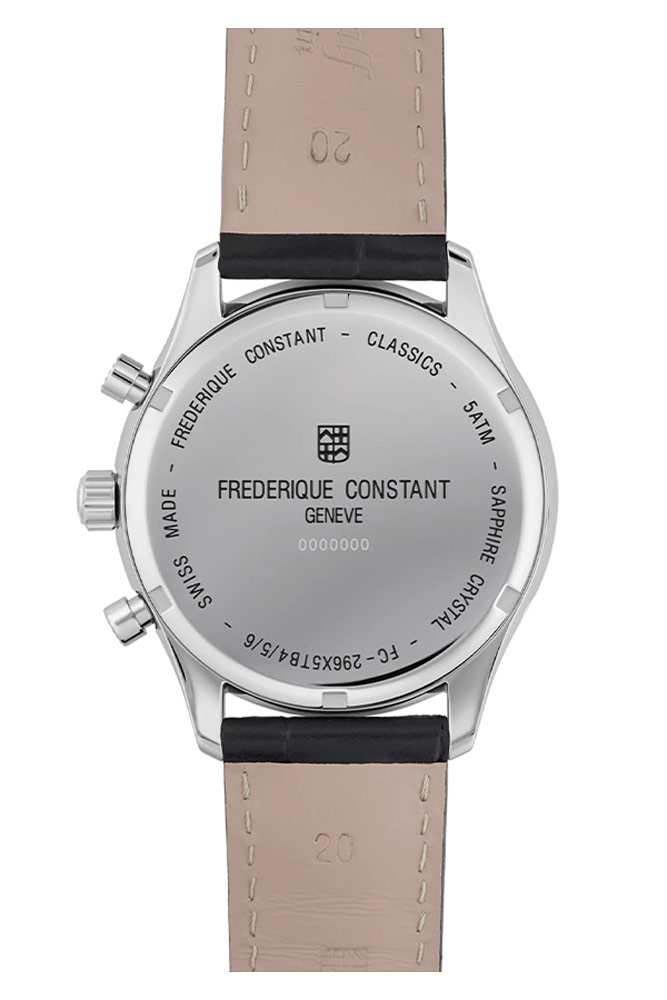 Frederique Constant Classics Quartz Chronograph Triple Calendar FC-296SW5B6 klasické pánské hodinky s chronografem a rozšířeným zobrazením data . Umístěno v elegantním ocelovém leštěném pouzdře s malým průměrem 40 mm . Vybaven třemi dílčími ciferníky stopek a dvěma jasnými, obdélníkovými okny ukazujícími den v týdnu a měsíc. Na ciferníku jsou navíc dva kroužky. Jeden ve stylu železničních tratí s vteřinovou stupnicí, druhý, což je číselný seznam dnů v měsíci. Každý prsten má odpovídající vodítko. Základní časová stupnice se skládá ze stříbrných aplikovaných lineárních indexů následovaných dvěma štíhlými ručičkami listového typu. Celý ciferník v elegantní bílé barvě zdobí jemný lesk. Kromě zmenšeného průměru jsou retro podtexty tohoto modelu ovlivněny nepoškrábatelným, sférickým safírovým sklíčkem a koženým řemínkem z aligátoří. Velkou spokojenost způsobí i pohled na kvalitní detaily, jako jsou linie, výřezy v ciferníku, speciální textury knoflíků, loga na korunce nebo prošívání řemínku. Klasické hodinky na černém koženém řemínku z kolekce Classics Quartz jsou luxusní každodenní hodinky pro muže, který má rád svůj čas plně pod kontrolou.