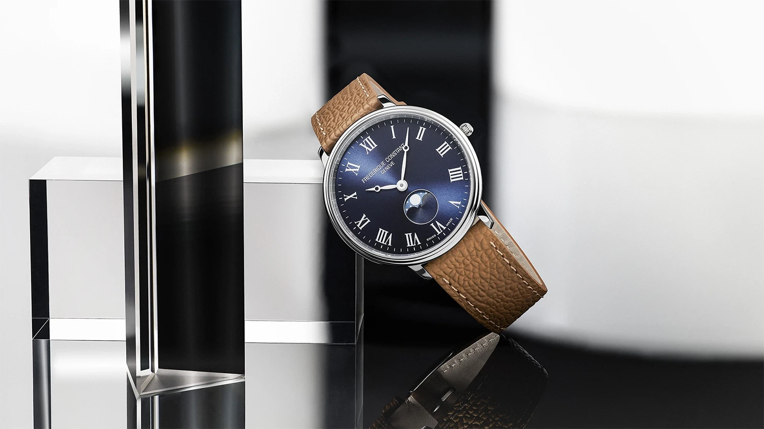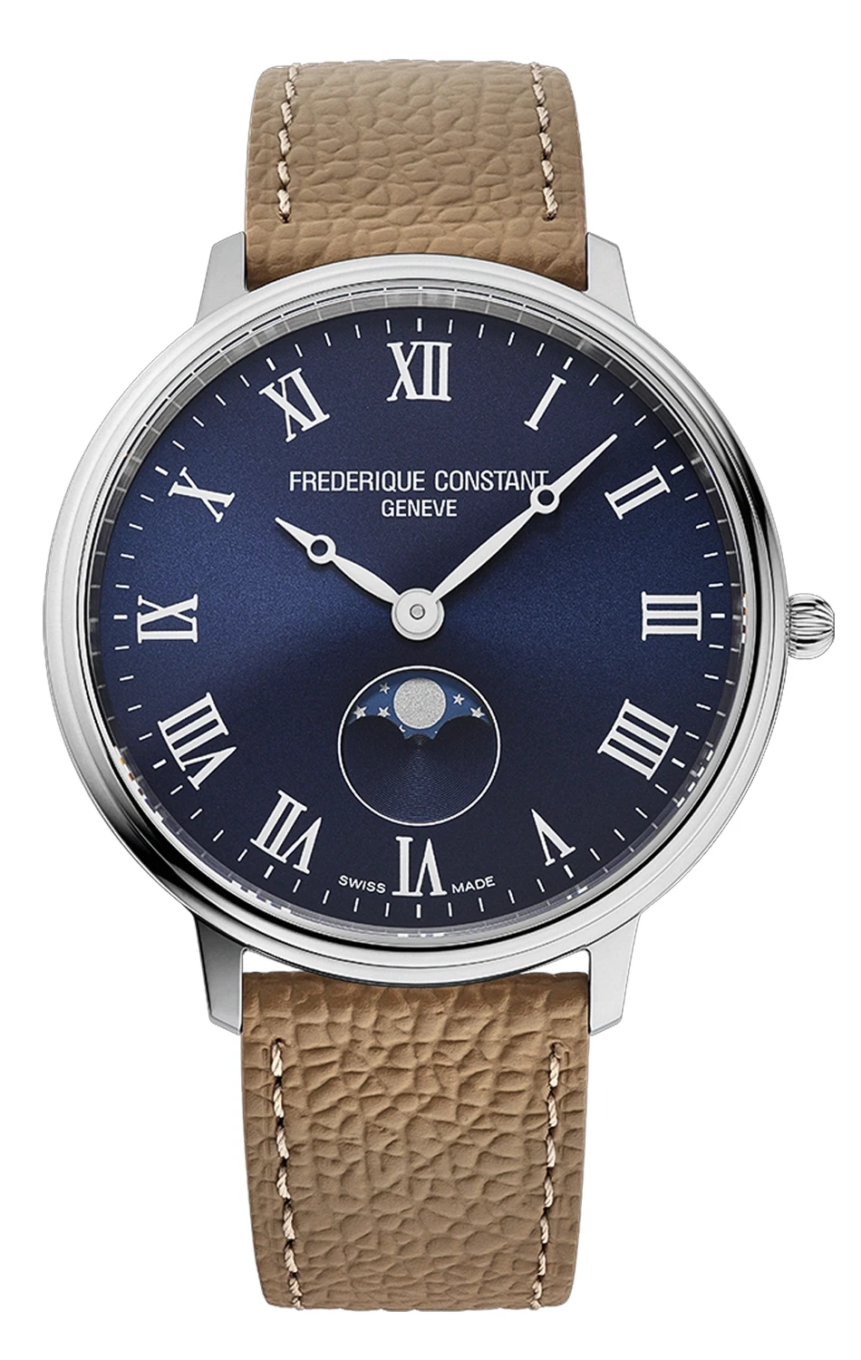 Frederique Constant Classics Quartz Moonphase FC-206RN3S6 jsou hodinky, které spojují funkčnost každodenního časomíry s půvabem nadčasového designu. Pouzdro z ušlechtilé oceli o průměru 39 mm je doplněno hnědým koženým řemínkem, což vytváří klasický, ale přesto neotřelý vizuální dojem. Modrý ciferník se slunečním brusem mění odstín podle úhlu dopadu světla a subciferník fází měsíce na šesté hodině dodává celku romantický charakter. Štíhlé ručky a aplikované římské indexy připomínají vintage hodinky, ale celek zůstává svěží a současný.