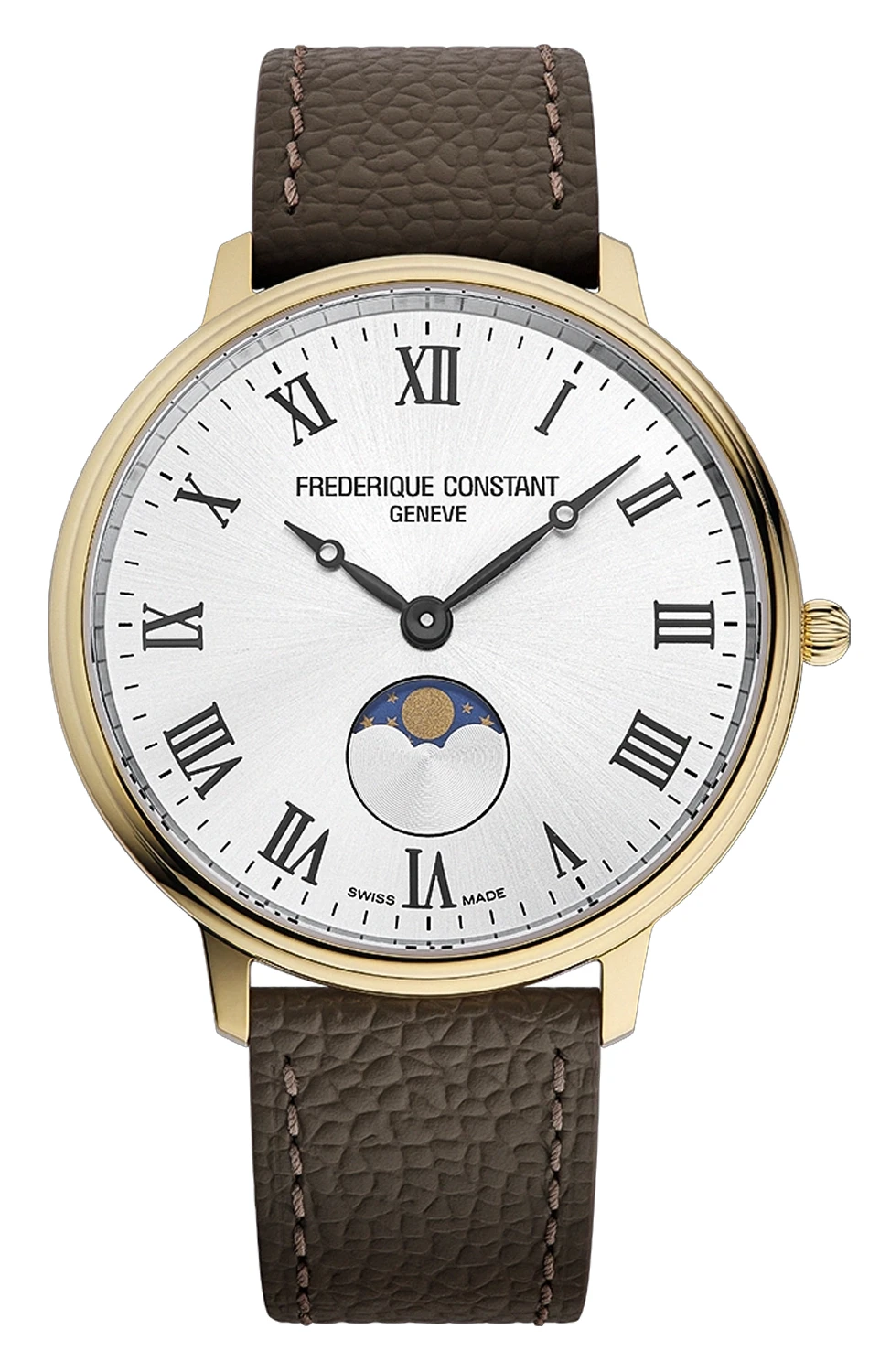 Frederique Constant Classics Quartz Moonphase FC-206RS3S5 je model, který spojuje klasickou formu s moderními technickými řešeními a nabízí uživateli nejen přesný čas, ale i vizuální potěšení. Pouzdro z ušlechtilé oceli pokryté povlakem PVD ve žlutém zlatě dodává hodinkám elegantní a teplý charakter. Jeho průměr 39 mm a štíhlý profil zajišťují, že hodinky skvěle sedí na zápěstí, aniž by ztrácely na přítomnosti. Stříbřitý ciferník se slunečním brusem je ozdoben černými římskými číslicemi, které dokonale ladí s elegantními ručičkami typu dauphine.