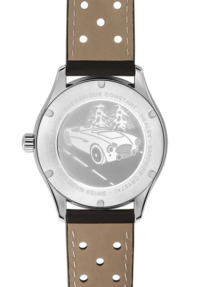 Výjimečný charakter dodává intenzivně zelený číselník inspirovaný slavným odstínem British Racing Green, ozdobený minimalistickým logem Healey. Čistý povrch podtrhuje čitelnost – stříbřité, luminiscenční indexy a ručky jsou dokonale viditelné za všech podmínek, zatímco červená sekundová ručka dodává sportovní nádech. Gravura klasického automobilu Healey na dýnku a perforovaný hnědý řemínek připomínající rukavice vintage jezdců doplňují retro styl.
