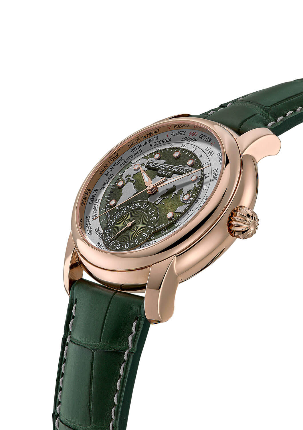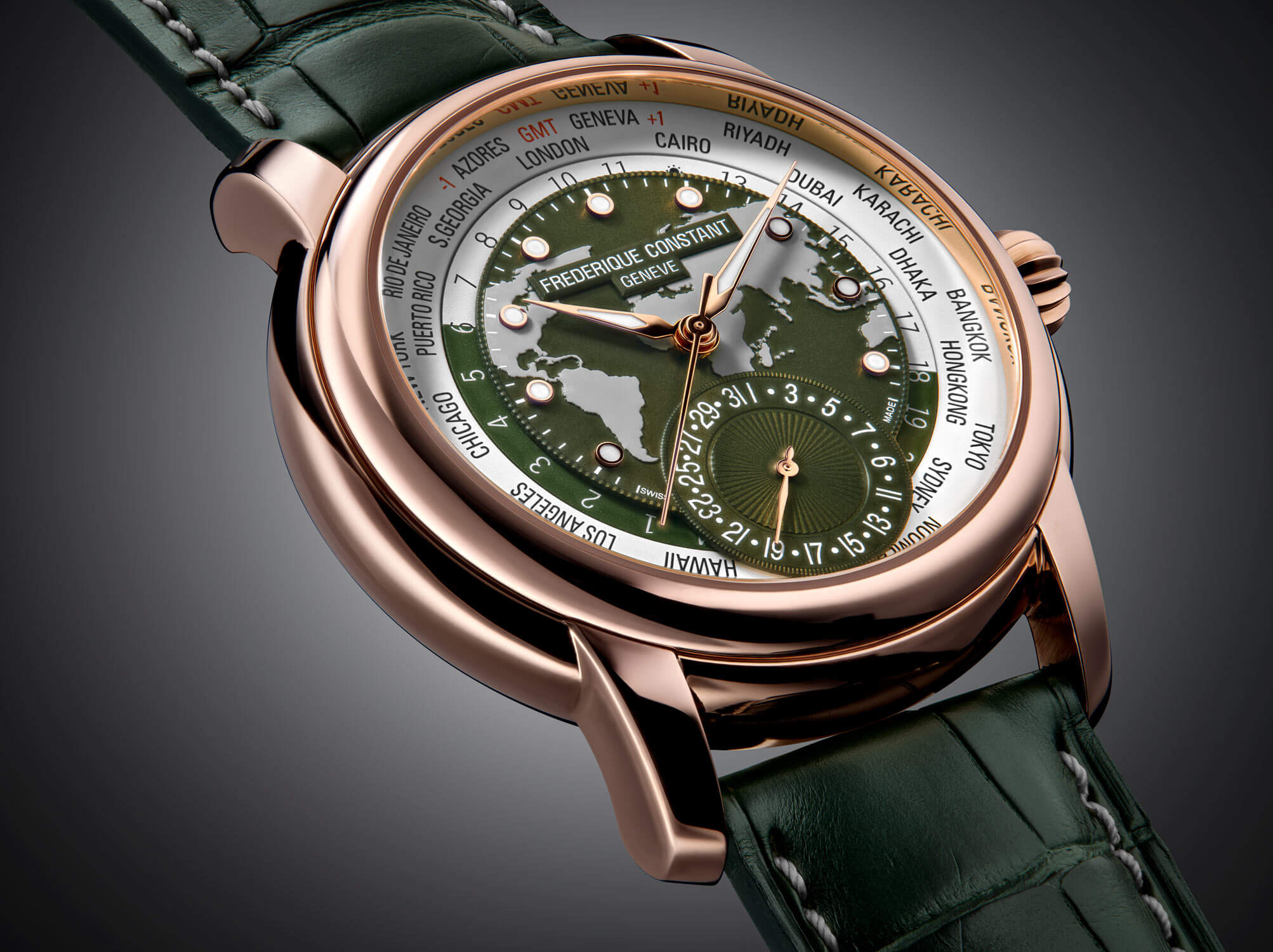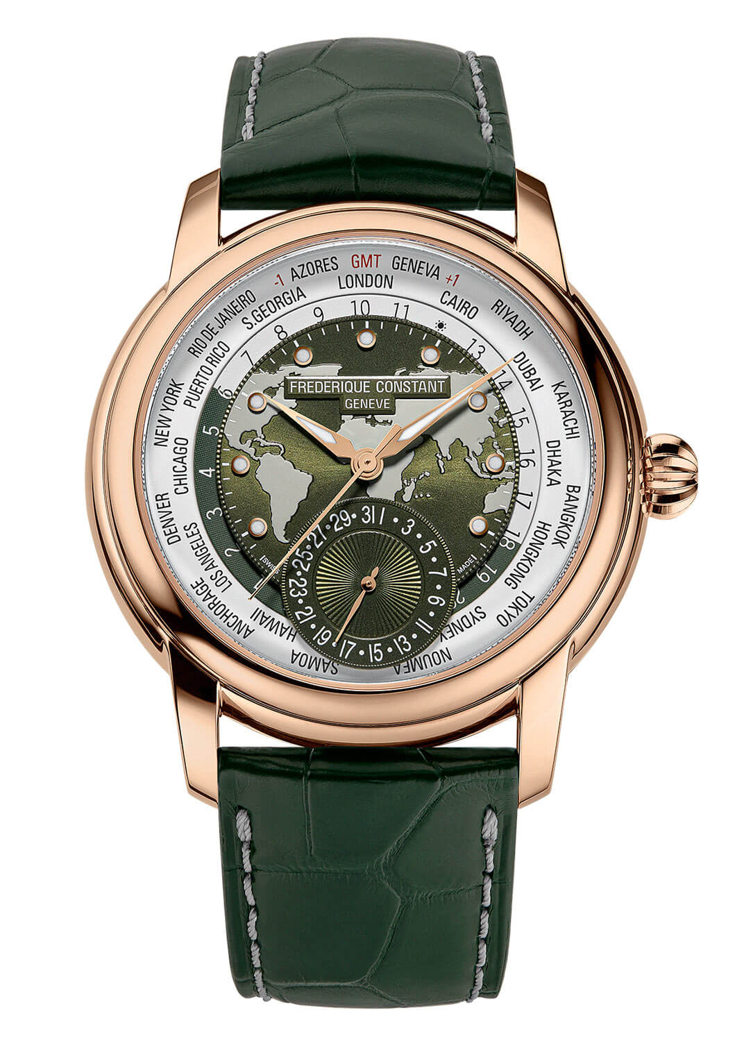 Ciferník zlatých hodinek Frederique Constant FC-718KWWM4H9 ukazuje mapu světa s datumovkou na 6. hodině a elegantním tmavě zeleným koženým řemínkem, který celku dodává harmonický vzhled obohacený o četné detaily. Mechanismus Manufacture umožňuje pohodlně sledovat čas ve 24 různých časových pásmech, které se zaznamenávají na 24-hodinový disk, a zobrazovat datum. Všechny funkce lze snadno nastavit pomocí korunky, což podtrhuje intuitivní povahu těchto hodinek. Precizní zpracování řemeslníků Frederique Constant je patrné zejména v detailech datumového okénka - jeho jemně rytý rám a matný prsten eliminují odlesky a střed zdobený technikou giloš zajišťuje čitelnost ruky. Ciferník má vynikající viditelnost i v noci: každý hodinový fix je pokryt vrstvou Super-LumiNova a barvy fixů dokonale ladí s barvami pouzdra a ruček, vyrobených z oceli nebo růžového zlata. Luminiscenční ručky se pohybují po ciferníku, na kterém jsou celá jména všech 24 referenčních měst. Doprovází je 24hodinový kotouč, přičemž světlejší část symbolizuje den a tmavě zelená část představuje noční hodiny, čímž odpadá potřeba ukazatele dne/noc, díky čemuž je číselník přehlednější.