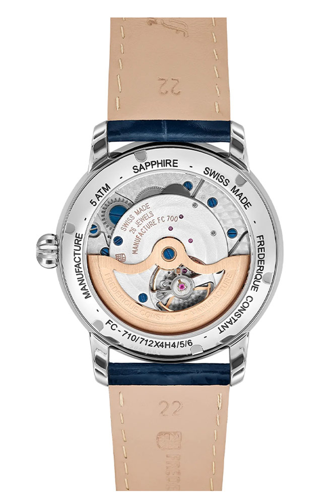 Pánské hodinky Frederique Constant Classic Moonphase Manufacture FC-712MN4H6 obsahují nejnovější interní kalibr automatického Machineku FC-712, který se stává 29. přírůstkem do stále se rozrůstající kolekce. Na základě ikonického Machineku FC-700 od Frederique Constant byl přepracován tak, aby zahrnoval funkce fáze měsíce a data. Obojí lze upravit pomocí tkaničky. Přes prosklené zadní pouzdro Machineek ukazuje slavné dekorace Perlage a Côtes de Genève přítomné na všech interních rážích Frederique Constant. Oddělení výzkumu a vývoje značky a hodinářům trvalo dva roky, než zdokonalili tento kalibr a uvedli jej na trh.