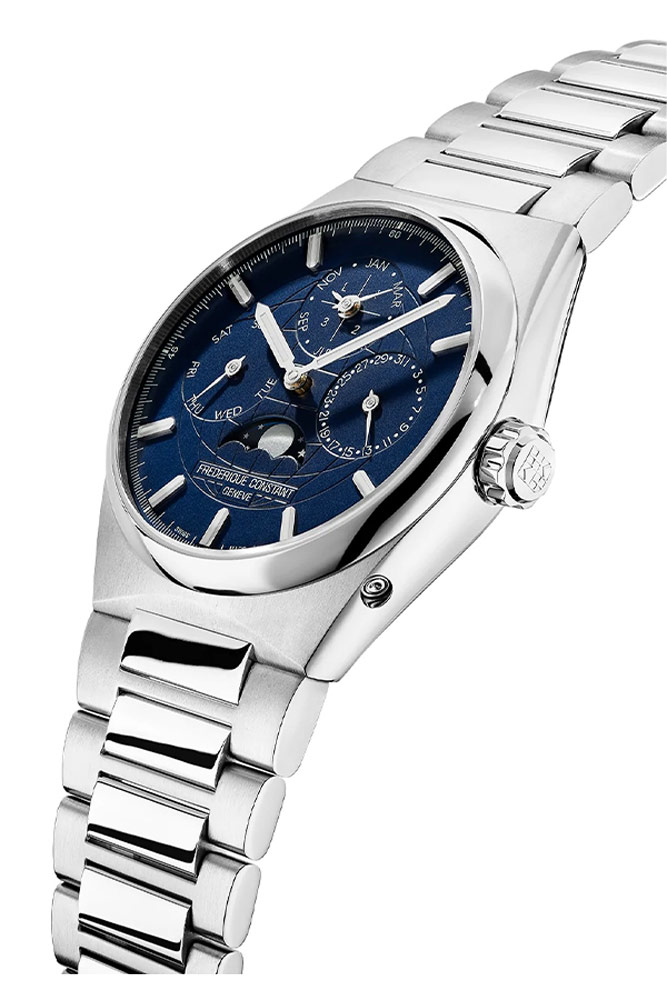Představovaný model FC-775N4NH6B má originální, prodloužený ciferník v matné námořnické modré barvě, který odráží, jak velký význam švýcarský výrobce přikládá otázce designu. Od počátku značky znamenala tato sekce hodně, protože do značné míry odráží poselství tvůrců, definuje individuální charakter a dává jedinečnou hodnotu jedinému produktu. Zásadní je tedy celkový design, ale důležité jsou i detaily. Jsou duší hodinek, definují jejich tvar, sílu poselství a povolání. Ciferník Frederique Constant FC-775N4NH6B Highlife Perpetual Calendar Manufacture ve skutečnosti obsahuje důležitou zprávu. Tři dílčí ciferníky, které jsou ukazateli dne v měsíci, jeho názvu a dne v týdnu, vystřižené místo s funkcí fází měsíce a zajímavé pozadí v podobě sady globusové mřížky na tmavě modré kouli ... Všechny komponenty se spojují v jednu a ilustrují mimořádný smysl a roli, kterou hraje čas na Zemi i mimo ni. Časomíra je navíc vybavena funkcí věčného kalendáře, která od nynějška dá uživateli zapomenout na nutnost upravovat datum v případě počtu dnů v měsíci s rozlišením 30 a 31 dnů a přeskočit let.