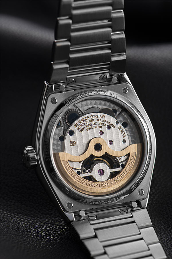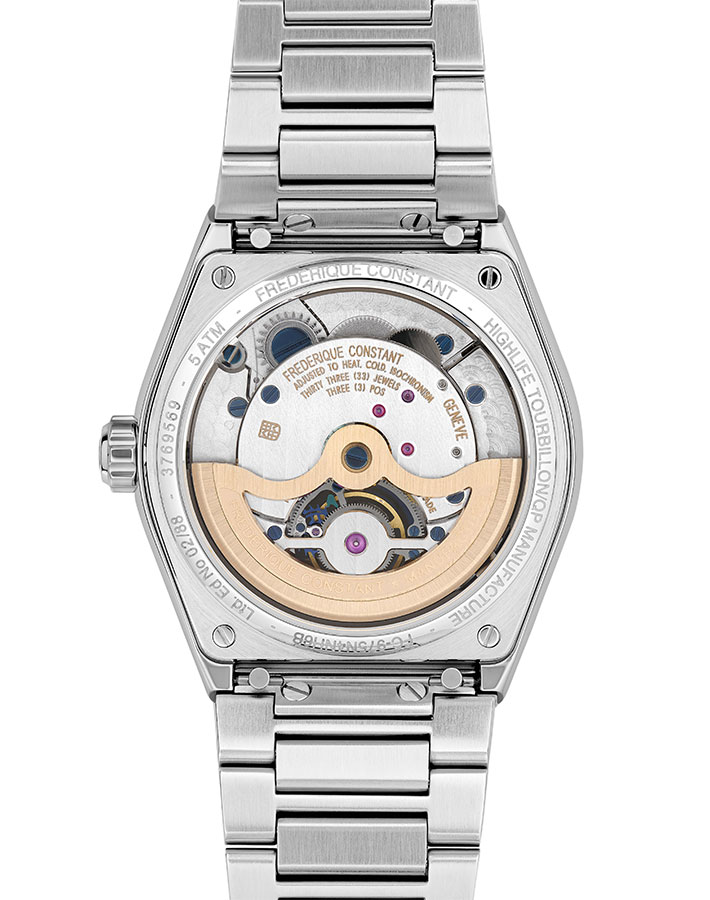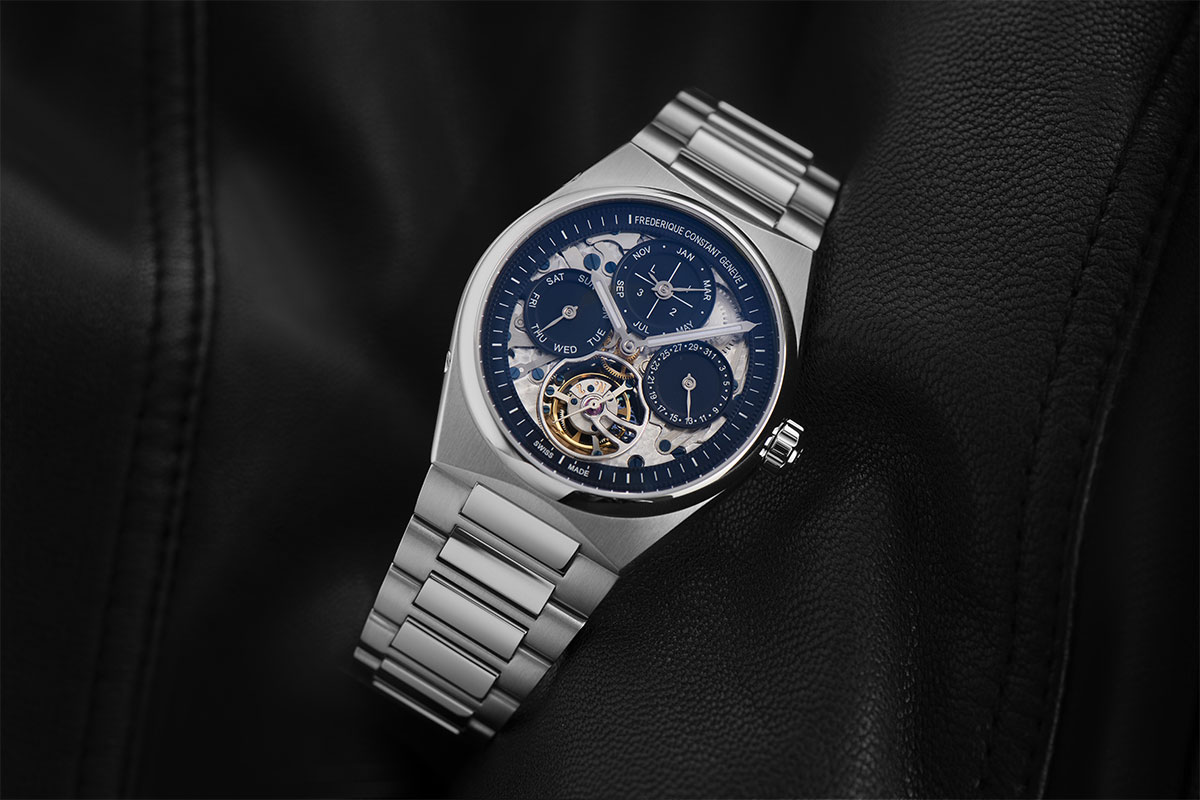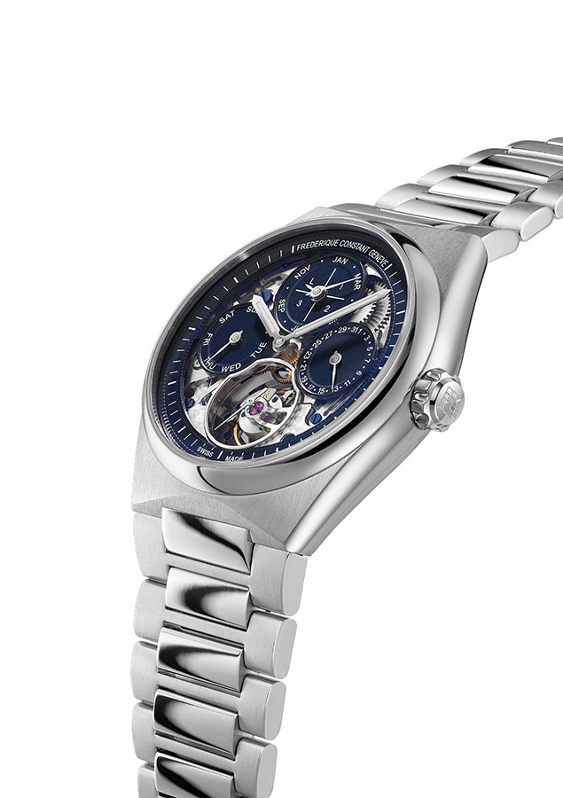 Tento model je k dispozici ve vysoce kvalitní nerezové konstrukci a je neúprosný. Porušuje pravidla, jako by byla dávno vytesaná do kamene. Frederique Constant dokazuje, že je možné navrhnout něco vysoce moderního, a přitom obohaceného o tradiční komplikace. A co víc, lze jej vyrábět a montovat ve zdech ženevské manufaktury, čímž vzniká nejlepší dostupná vlastní produkce, jaká kdy existovala. Nakonec. Podařilo se nám spojit to, co se mezi jednotlivými názory zdálo nemožné a oživit elegantní, přesné a moderní hodinky. Intuitivní, jako u každé vysoce výkonné komplikace, protože čitelnost je zásadní. V 41mm pouzdře s integrovaným páskem, charakteristickém pro kolekci Highlife, Frederique Constant rozdělil své komplikace do čtyř segmentů. Den a datum jsou nejčastěji čtené informace. Výrobci je kvůli tomu seřadili horizontálně tak, aby byly dostupné ve zlomku vteřiny přirozenou cestou. Měsíc (velká ručička) a přestupný rok (malá ručička) jsou vloženy do jednoho počítadla na pozici 12 hodin. Tuto dokonale obsaženou estetickou kompozici završuje tourbillon na 6. hodině s ručně leštěnou a postříbřenou ručičkou odpočítává vteřiny pomocí středové ručičky. Patří k nejkvalitnějším in-house kalibrům FC-975. Jeho omezená výroba probíhá výhradně v továrně v Ženevě.