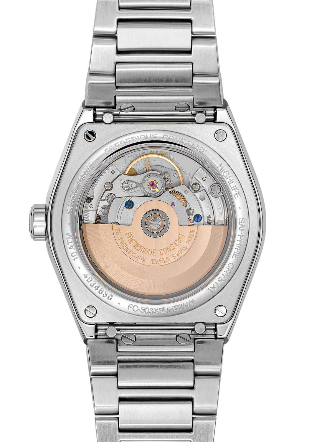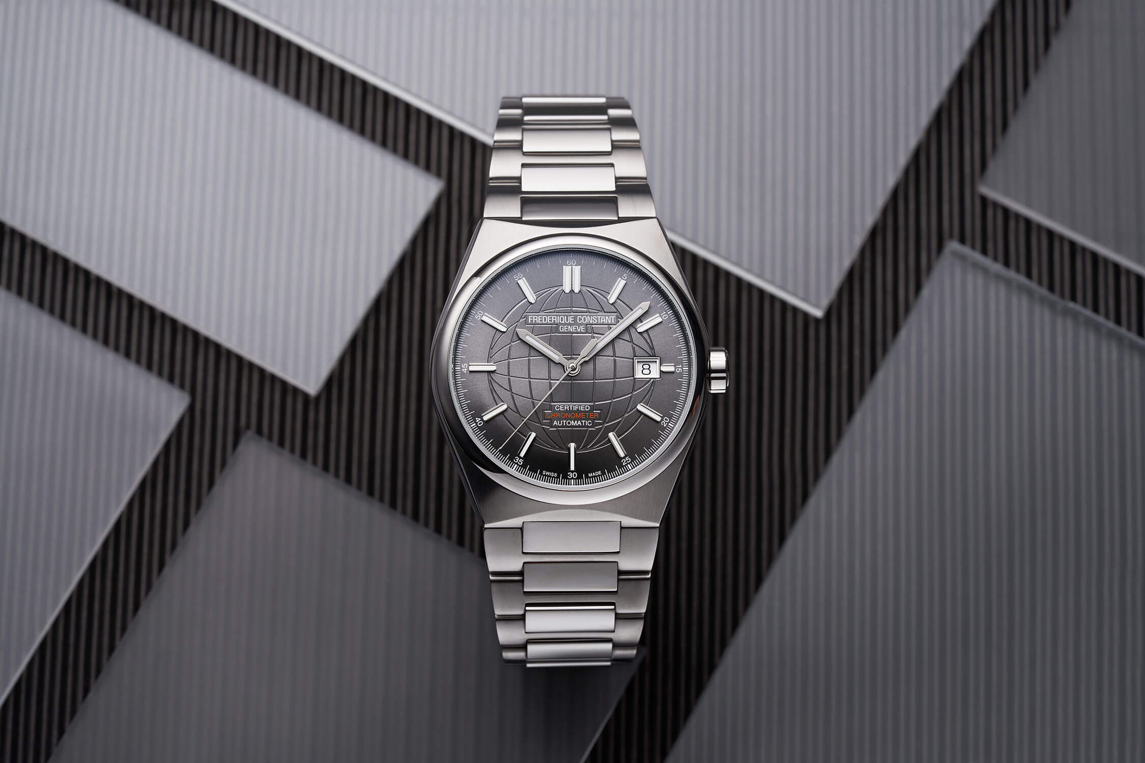 Centrálním prvkem tohoto modelu je jeho jedinečný ciferník. Šedý, výrazný odstín v kombinaci s jemným gilošovaným vzorem glóbu mu dodává unikátní, moderní charakter. Aplikované indexy se subtilními akcenty podtrhují precizní zpracování a dokonale čitelné ručičky zaručují komfortní odečet času za všech okolností. Dalším praktickým prvkem je ukazatel data na třetí hodině, který zvyšuje funkčnost modelu. Uvnitř hodinek pracuje automatický kalibr FC-303, který se vyznačuje maximální přesností a spolehlivostí, potvrzenou certifikací COSC. Frederique Constant Highlife FC-303GO3NH6B na ocelovém náramku představuje spojení nadčasového stylu s moderní technologií – hodinky, které jsou vždy přesné a vždy vypadají dokonale.