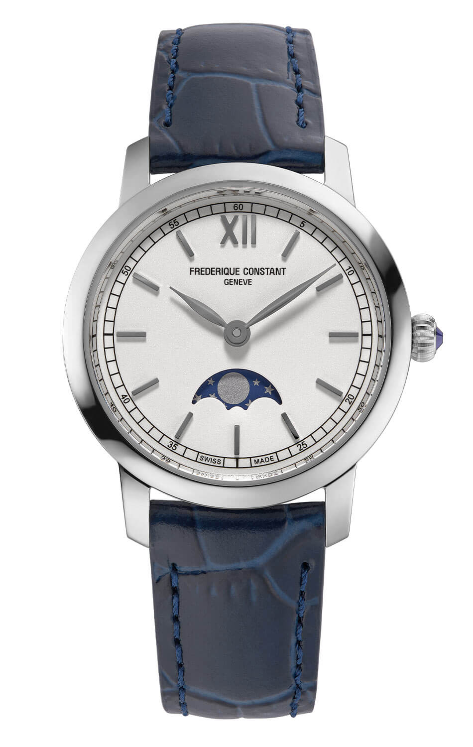 Po úspěchu modelů Slimline Moonphase s perleťovým číselníkem a diamantovými indexy představuje Frederique Constant dvě nové edice, které oslavují klasické, nadčasové a vznešené hodinářství. Dámské hodinky s fází měsíce Frederique Constant FC-206SW1S6 jsou jedním z nich. Již v bílém, matném ciferníku s perleťově černými hodinovými značkami lze nalézt typické rysy ušlechtilého ženevského hodinářství. Pouze sever je oproti předchozím modelům odlišen „XII“ v římské notaci. Kolem ciferníku je minutová stupnice v podobě římských číslic, které se objevují každých 5 minut mezi prázdnými oblastmi oddělenými intuitivními linkami. V 6 hodin je na stupnici nenápadně přidána značka kvality „Swiss Made“. Tato jemná, tzv. „železniční“ interpretace pohybové práce může být spojena se „sektorovými ciferníky“ známými ze zlaté éry hodinářství od 20. do 40. let 20. století. Tento estetický prvek doplňuje "cibulová" korunka na 3. hodině zakončená elegantním modrým kabošonovým kamínkem.