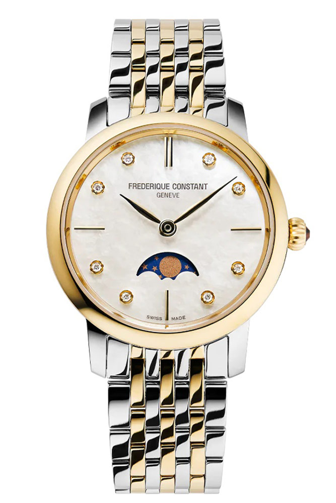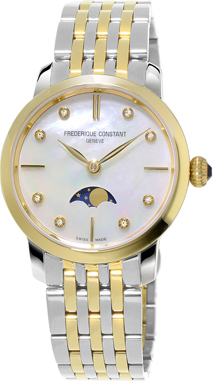 Dámské hodinky Frederique Constant Slimline Moonphase FC-206MPWD1S3B jsou ultratenkým modelem vybaveným bateriovým quartz Machinekem s funkcí fáze měsíce. Ploché pouzdro o tloušťce pouhých 7,7 mm je uzavřeno vypouklým safírovým sklíčkem, pod kterým se nachází perleťový ciferník zdobený diamanty.