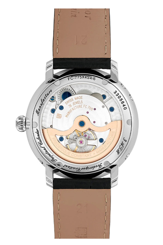 Představený Frederique Constant Slimline Perpetual Calendar FC-775S4S6 je nádherná kopie s působivým ciferníkem zachovaným v tónu jemné a čistě bílé. Neposkvrněná čistota pokračuje měsíčním leskem stříbra aplikovaným na: jemné indexy, tenké indikace i na ocelové pouzdro o průměru 42 mm. Ciferník je krytý sférickým safírovým sklem s vysokou odolností proti poškrábání a vysokým stupněm průhlednosti. Fáze návrhu byla vždy jednou z nejdůležitějších a vzrušujících věcí pro tým Frederique Constant, bez ohledu na generaci. Od semínka ve fantazii vizionáře, přes první skici na papíře, vizualizaci v pokročilém kreativním programu, až po prototyp vytvořený precizními inženýry a oficiální, schválenou verzi.
