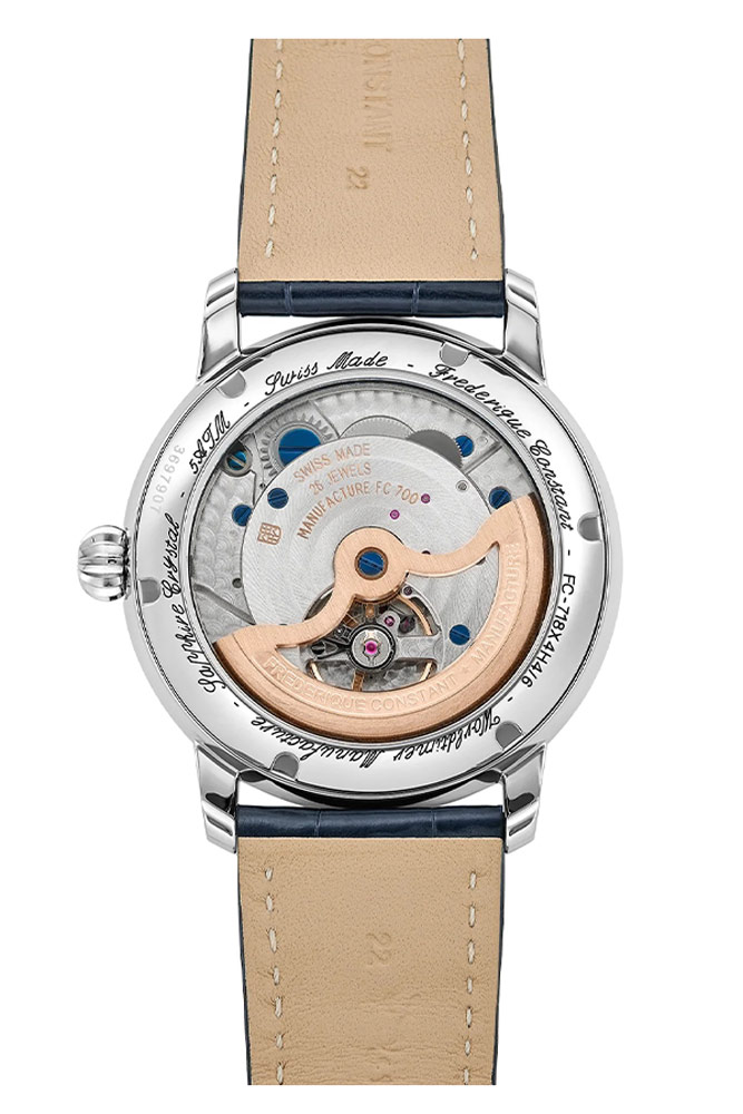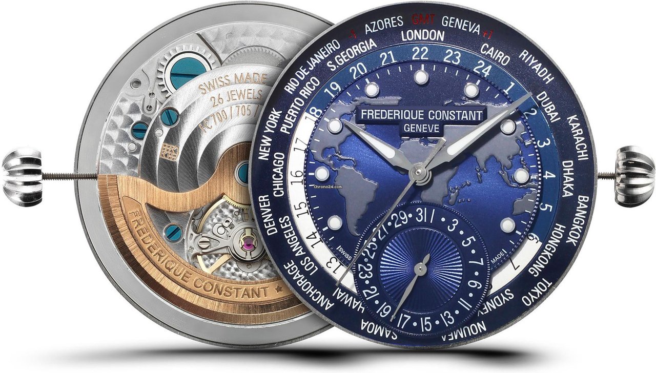 Srdcem hodinek je manufakturní automatický strojek FC-718, kompletně navržený a sestavený v ženevské manufaktuře značky. Kalibr nabízí přibližně 38 hodin rezervy chodu a vyniká intuitivním ovládáním – všechny funkce, včetně nastavení místního času, data či časových pásem, se regulují pouze pomocí jediné korunky. Toto řešení podtrhuje snahu Frederique Constant spojovat vysoké hodinářské řemeslo s komfortem každodenního používání.